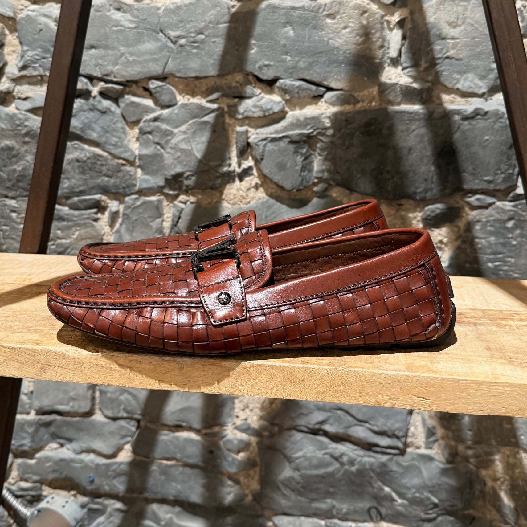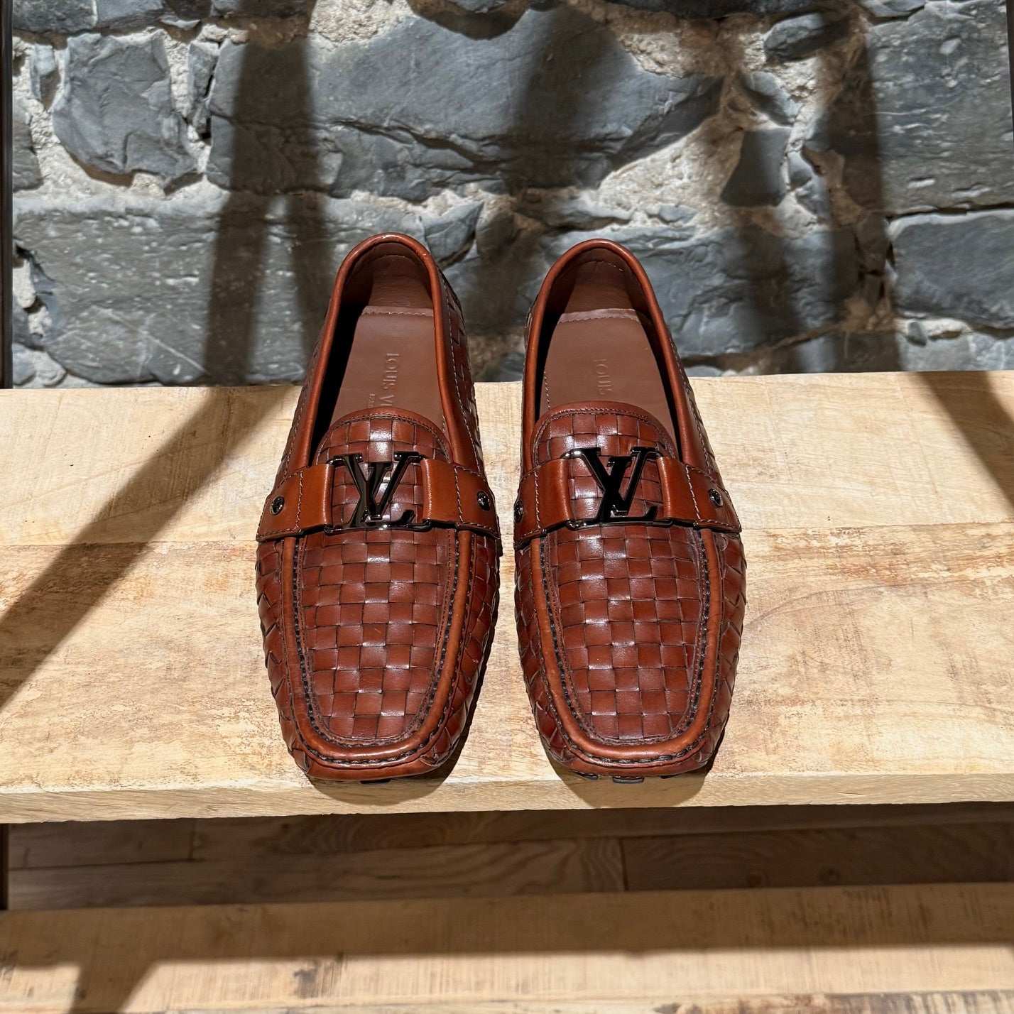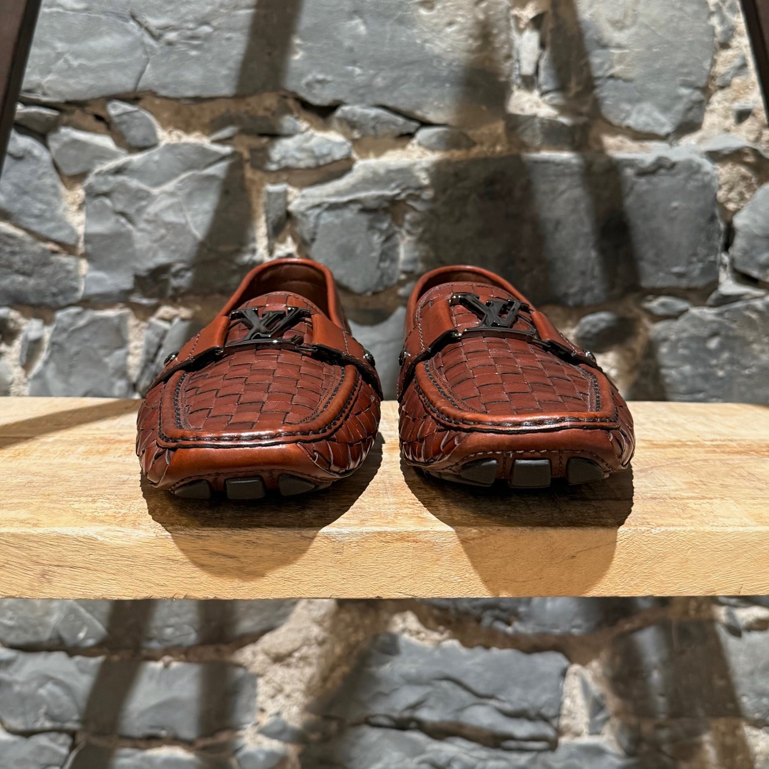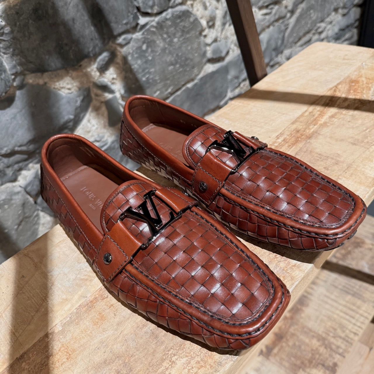 Mocassin de conduite en cuir brun cognac à léger lustre. Texture tressée effet panier. Enfilage sans lacets avec bout mocassin et couture visible de style mocassin. Bride sur l’empeigne avec quincaillerie LV Initials en métal finition canon de fusil et rivets latéraux gravés. Doublure en cuir et semelle intérieure en cuir rembourrée. Semelle extérieure de conduite en caoutchouc avec plots segmentés et empiècement au talon embossé Louis Vuitton. Livrés tels quels.