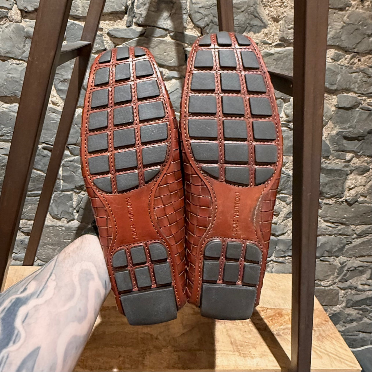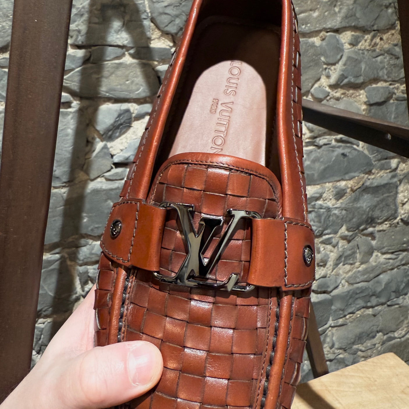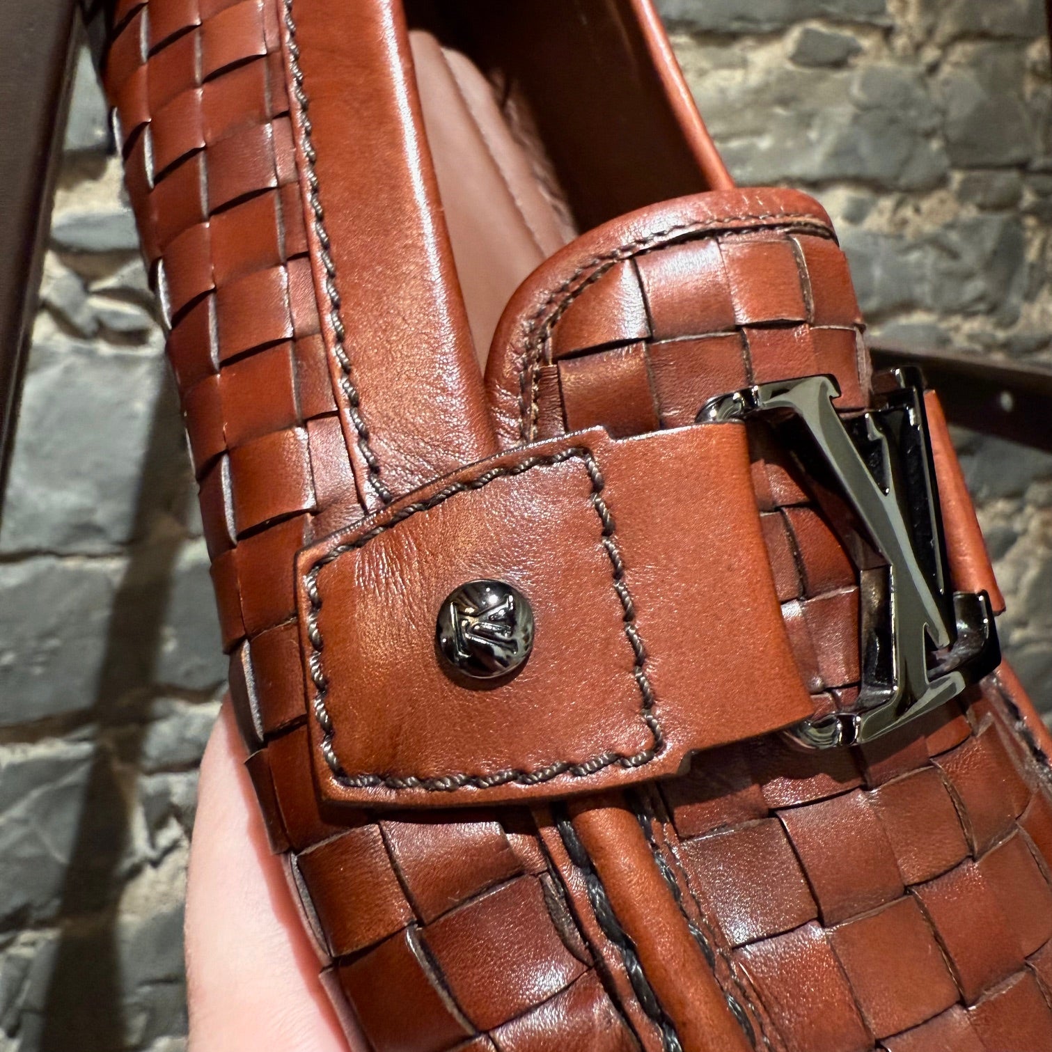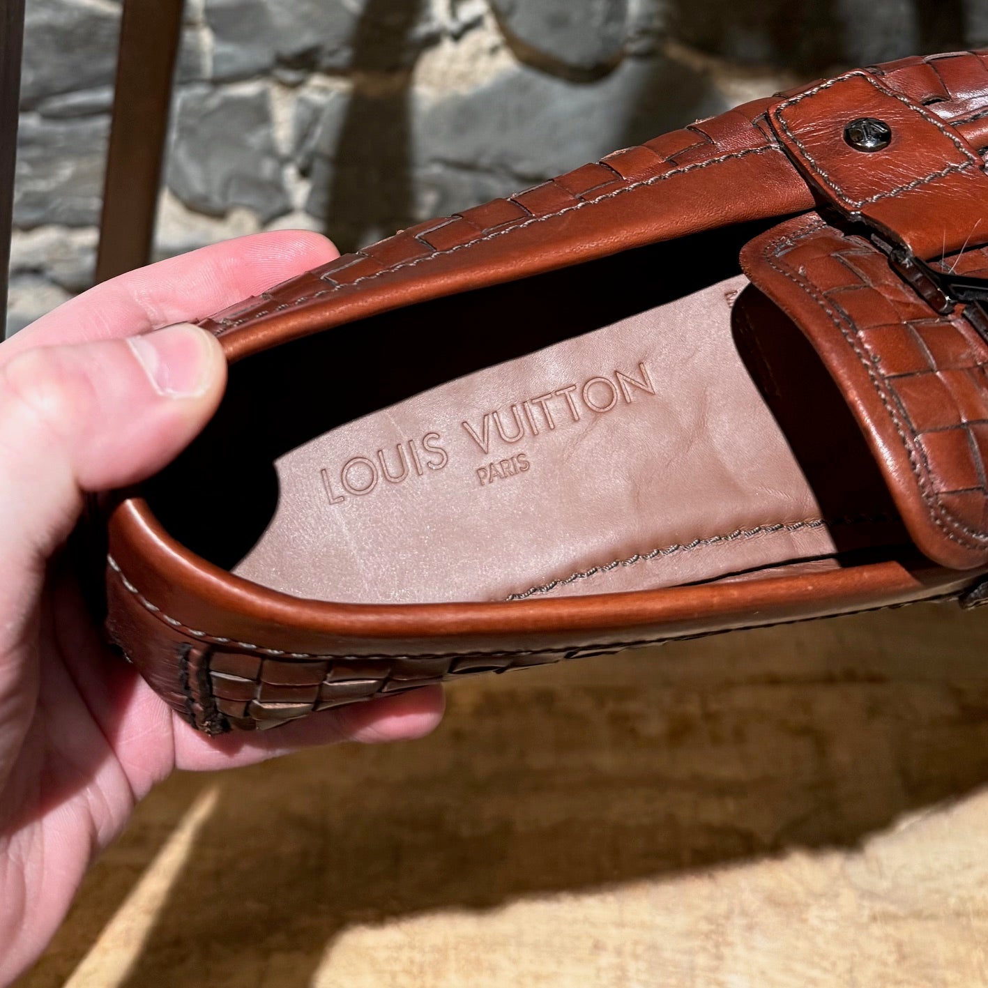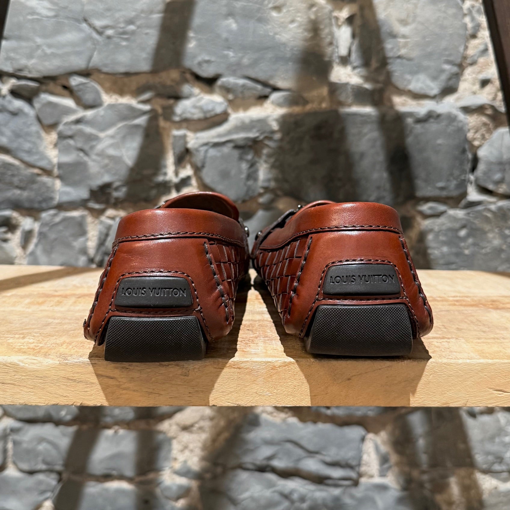 Mocassin de conduite en cuir brun cognac à léger lustre. Texture tressée effet panier. Enfilage sans lacets avec bout mocassin et couture visible de style mocassin. Bride sur l’empeigne avec quincaillerie LV Initials en métal finition canon de fusil et rivets latéraux gravés. Doublure en cuir et semelle intérieure en cuir rembourrée. Semelle extérieure de conduite en caoutchouc avec plots segmentés et empiècement au talon embossé Louis Vuitton. Livrés tels quels.