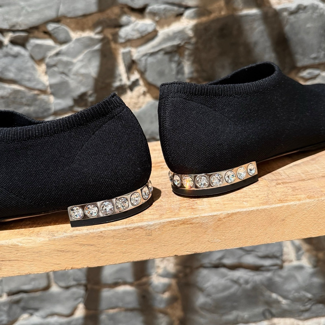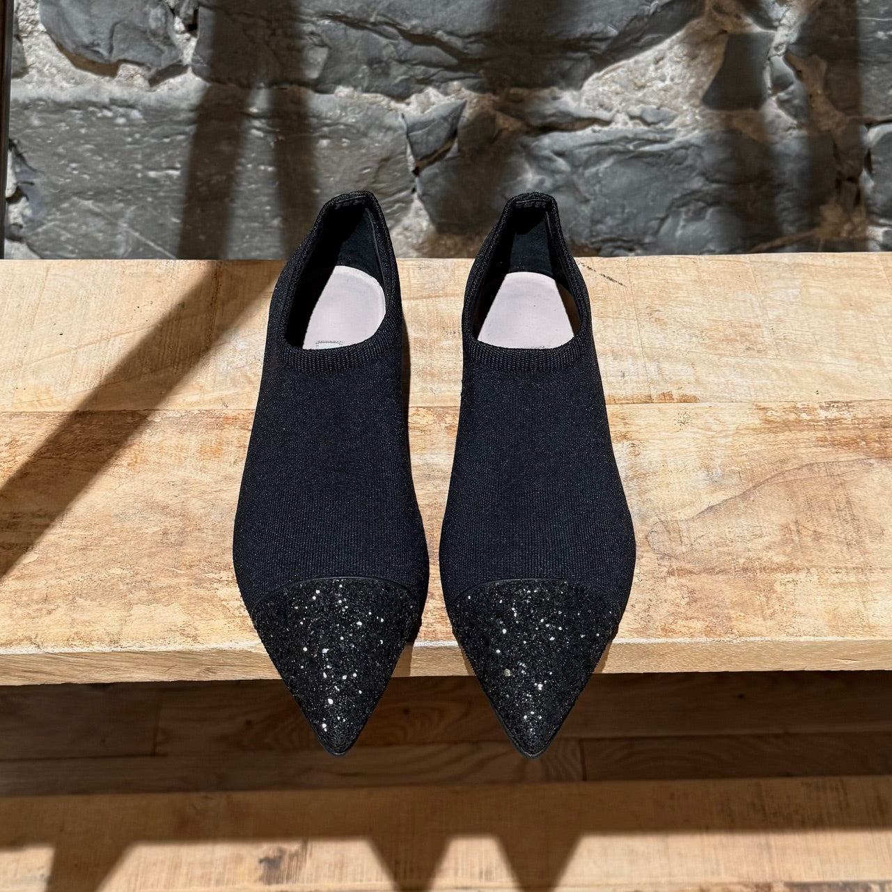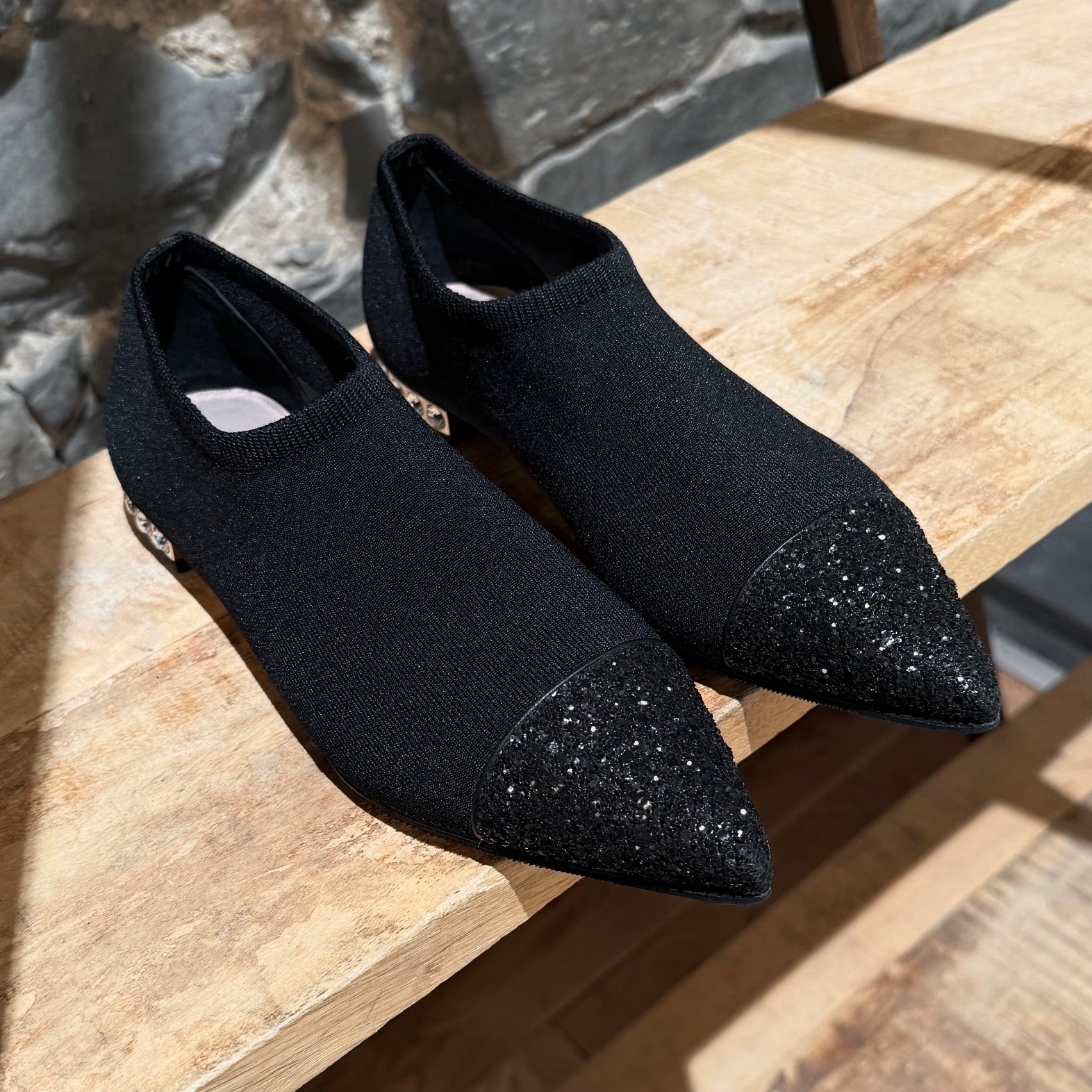 Design à enfiler en maille extensible technique noire, style chaussette. Col élastiqué en maille. Bout pointu orné de paillettes noires. Talon plat agrémenté de cristaux ronds transparents sertis dans une monture en métal argenté. Semelle intérieure en cuir beige. Semelle extérieure beige avec empiècements en caoutchouc.