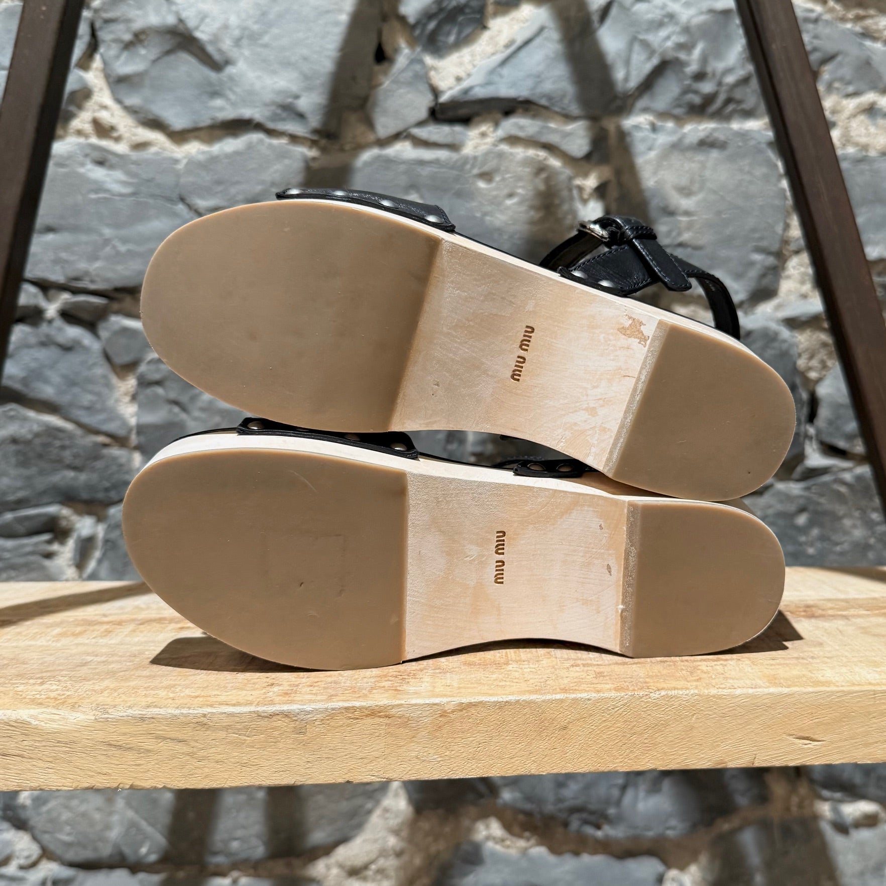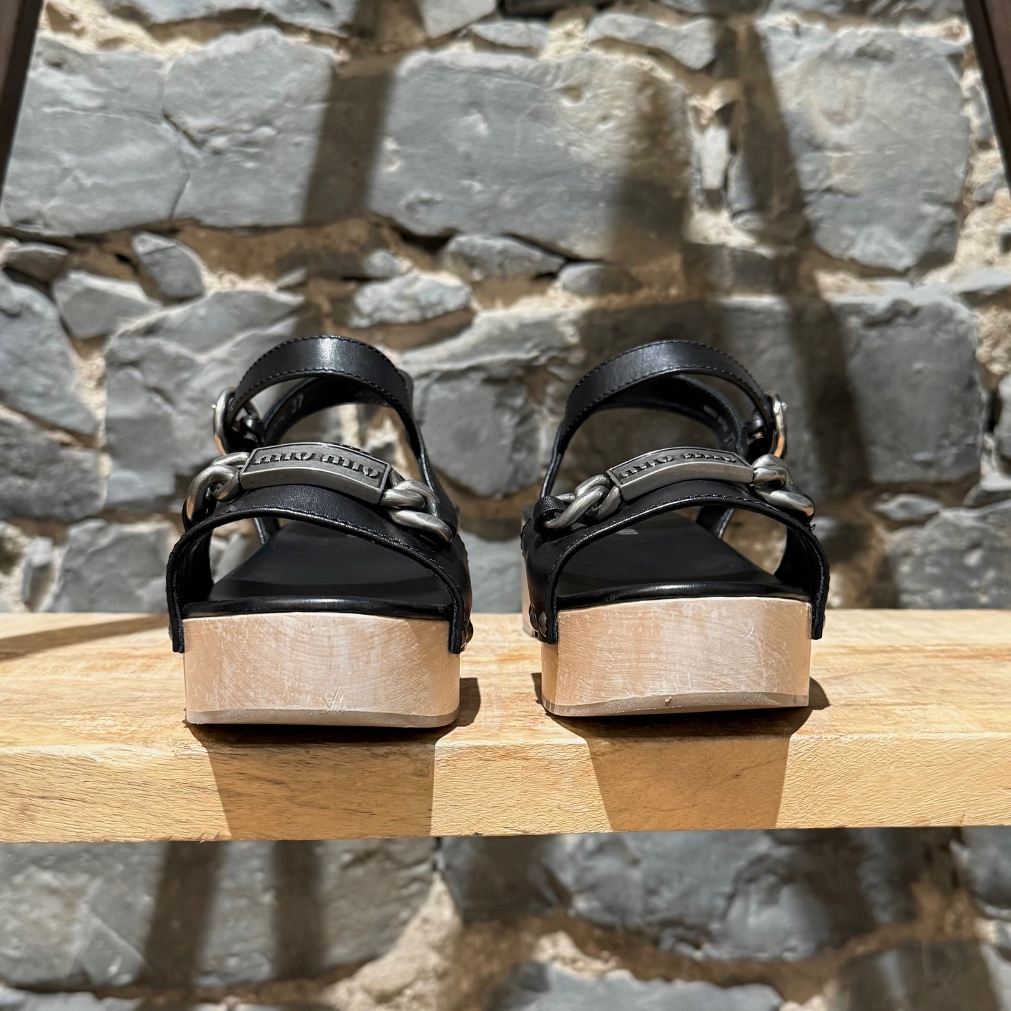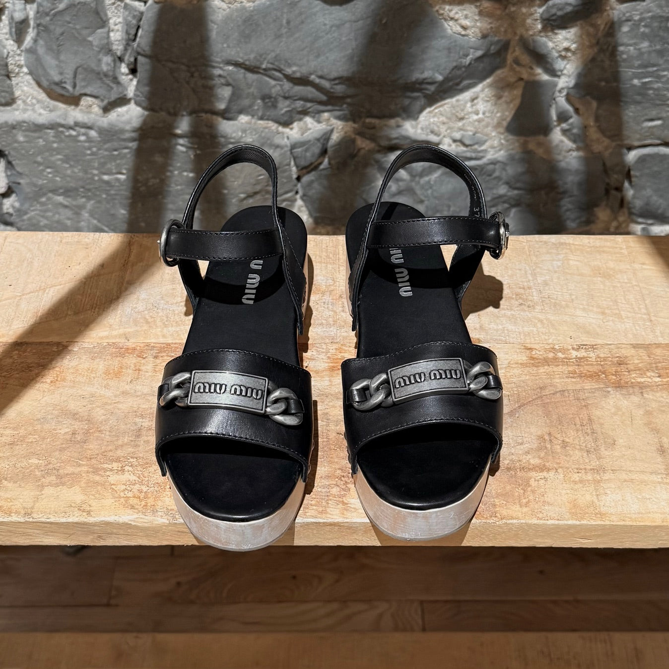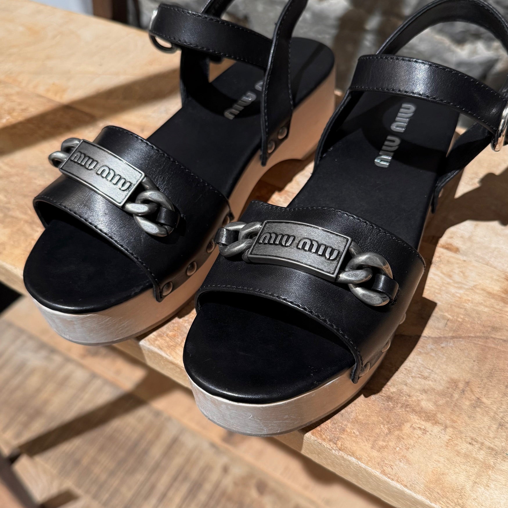 Sandales à plateforme ouvertes à l’avant avec tige en cuir cloutée. Large bride avant avec chaîne finition argent vieilli et plaque logo Miu Miu. Bride de cheville ajustable avec fermeture à boucle. Plateforme en bois naturel et talon bloc avec arche sculptée et empiècements en caoutchouc beige. Semelle intérieure en cuir noir. Faites en Italie. Livrées avec un sac poussière Miu Miu.