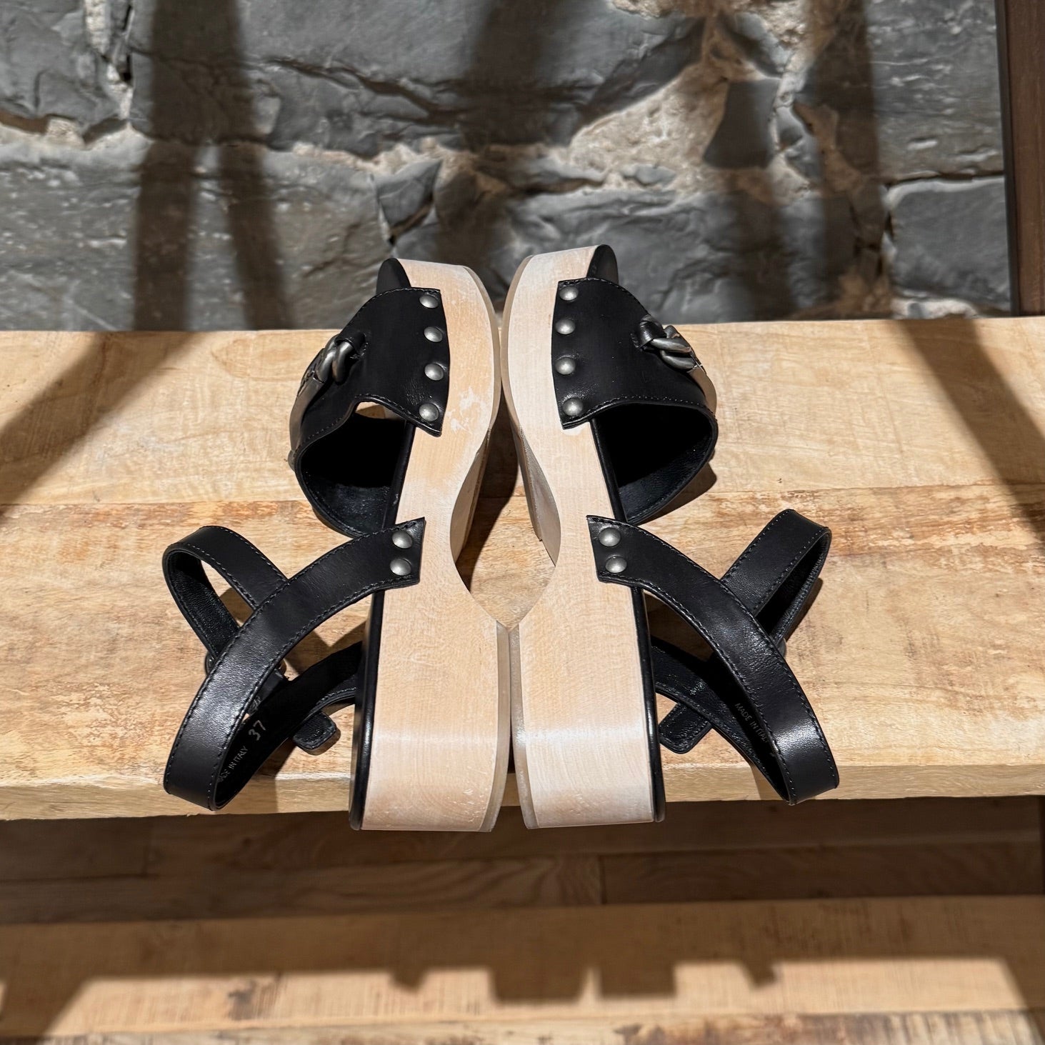 CONDITION: Article d'occasion, en très bon état. Légers signes d’usure cohérents avec une utilisation soignée. Le cuir est en très bon état avec légère usure et plis mineurs. Légères éraflures visibles et légère décoloration sur la plateforme en bois. Légère usure sur la semelle extérieure. Aucun défaut significatif. Veuillez vous référer aux photos et aux mesures. N’hésitez pas à demander des informations supplémentaires avant l’achat.