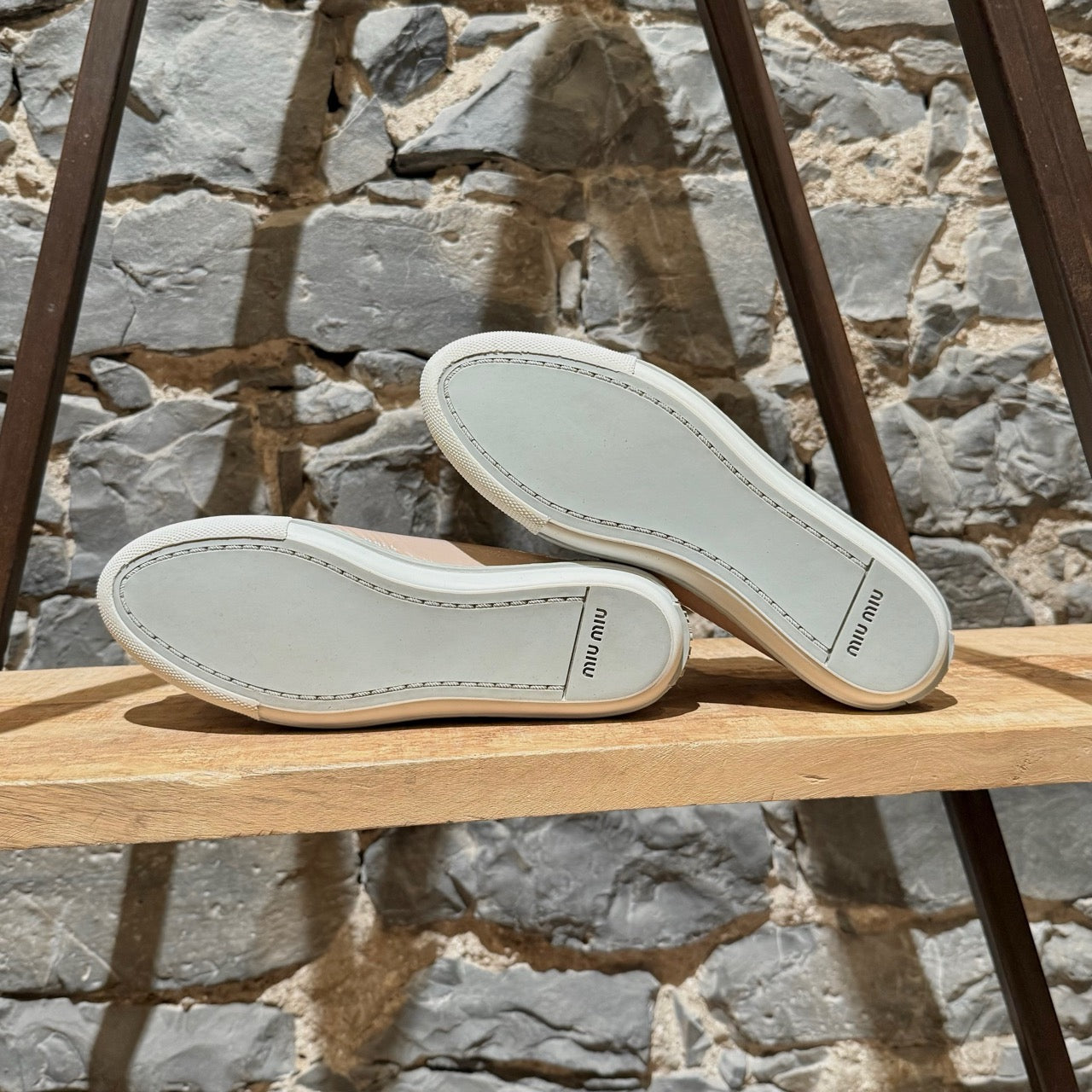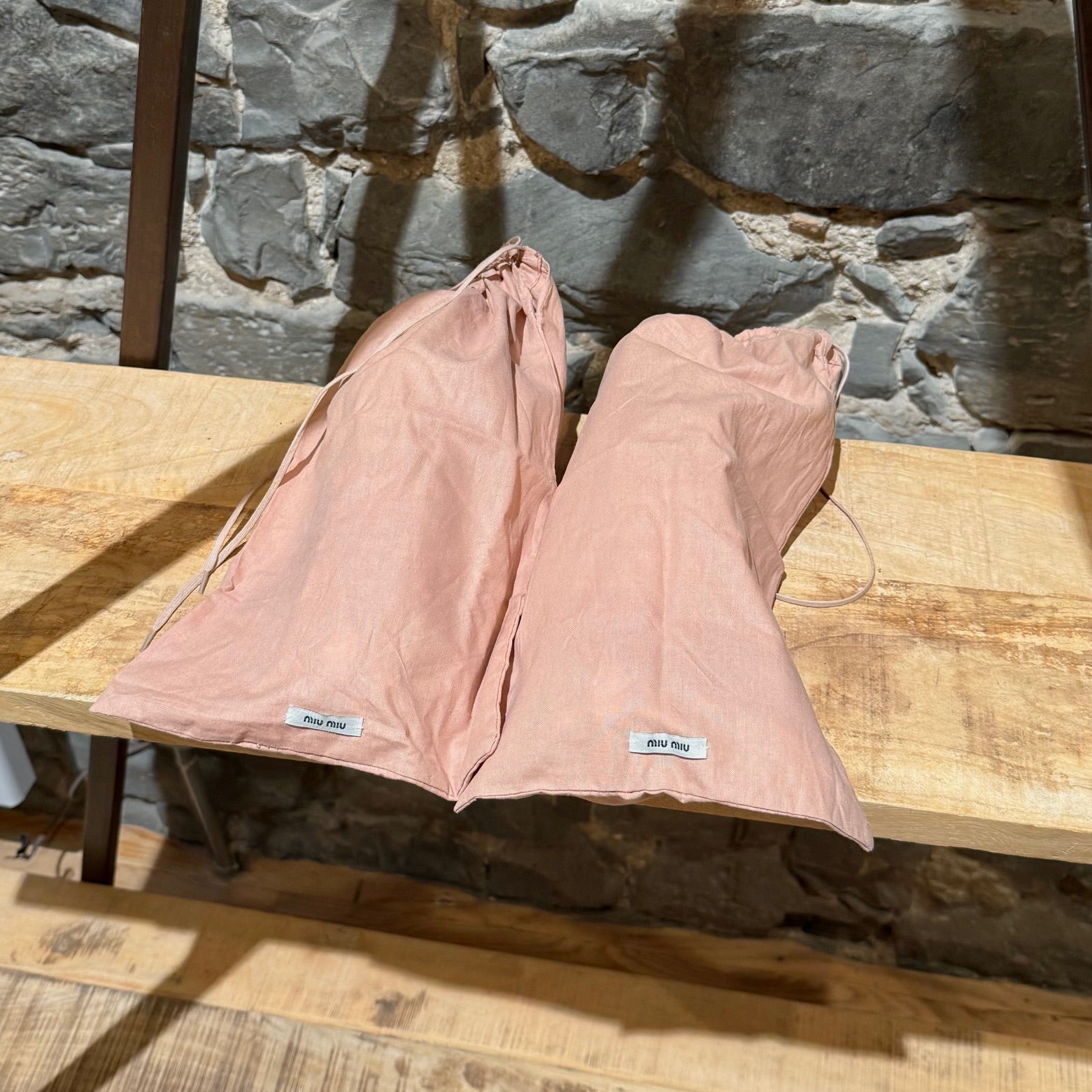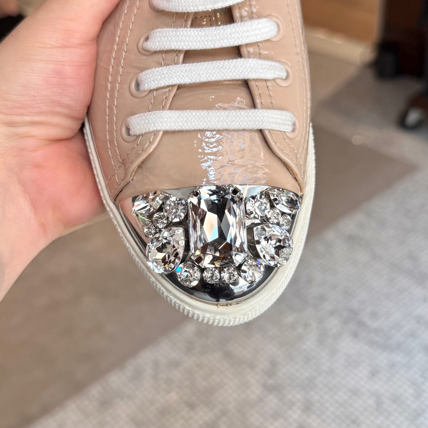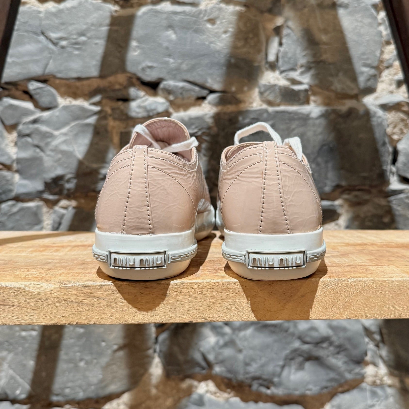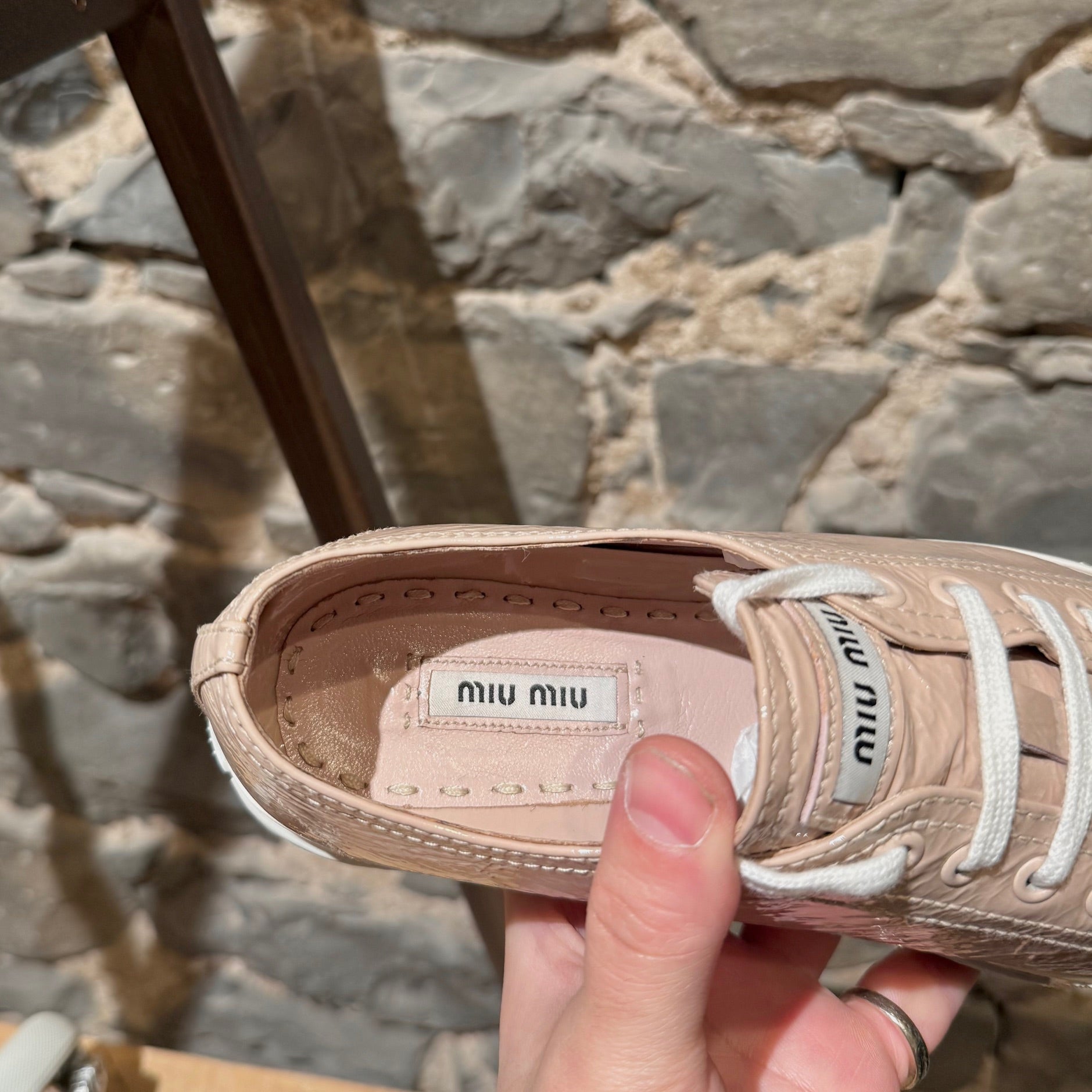 Cuir vernis rose nude brillant et froissé. Fermeture à lacets blancs. Bout arrondi orné de gros cristaux transparents sertis dans un embout en métal effet miroir. Logos Miu Miu signature sur la languette et le talon. Doublure et semelle intérieure en cuir. Semelle extérieure en caoutchouc. Fabriquées en Roumanie. Livrées avec housses de protection griffées.