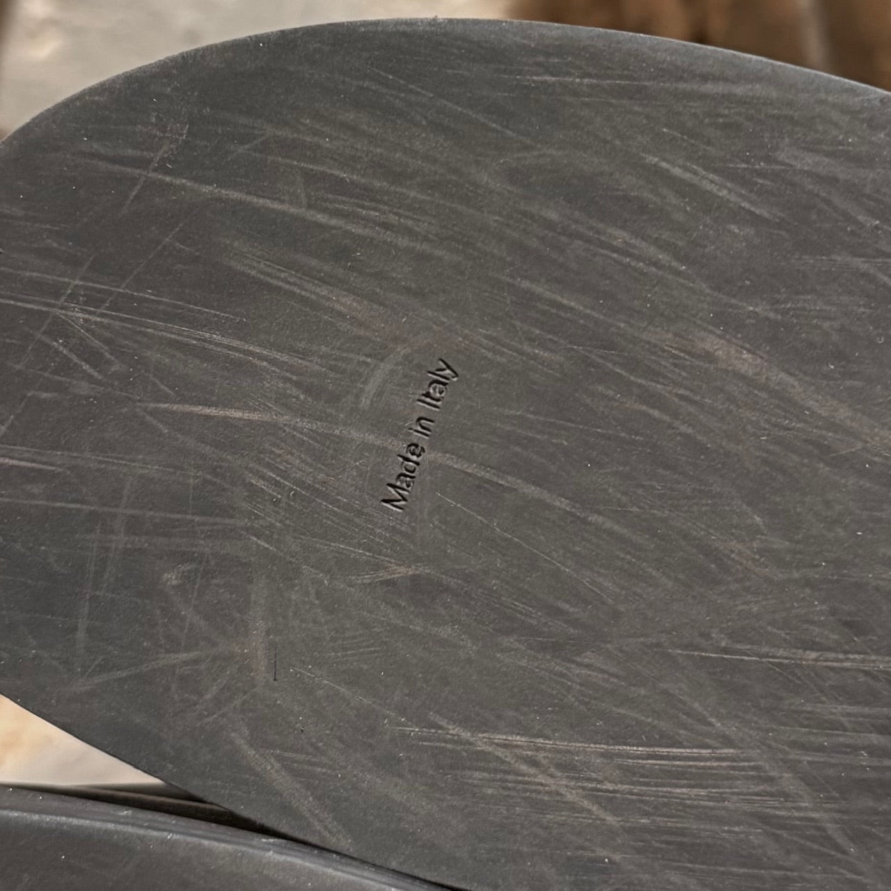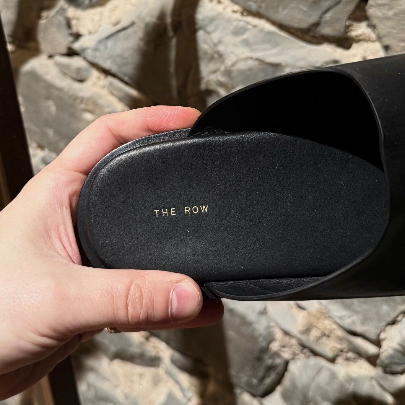 Cuir noir lisse. Style minimaliste à bout fermé et dos ouvert. Bout carré arrondi et semelle épaisse en caoutchouc noir. Estampille subtile du logo doré sur la semelle intérieure en cuir. Faites en Italie. Livrées telles quelles.