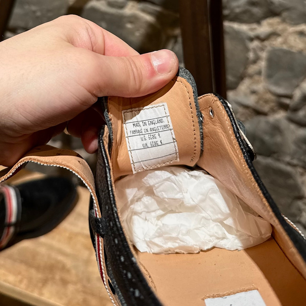 Cuir grainé noir avec détails richelieu. Dotées de perforations traditionnelles en bout golf et d'une bordure dentelée. Bride tricolore en gros-grain signature de la marque avec fermeture à boucle. Lacets et bout en amande. Talon bottier en cuir. Doublure et semelle intérieure en cuir fauve. Semelles extérieures en cuir. Tirette en gros-grain signature au talon. Livrées avec leurs étiquettes d'origine.