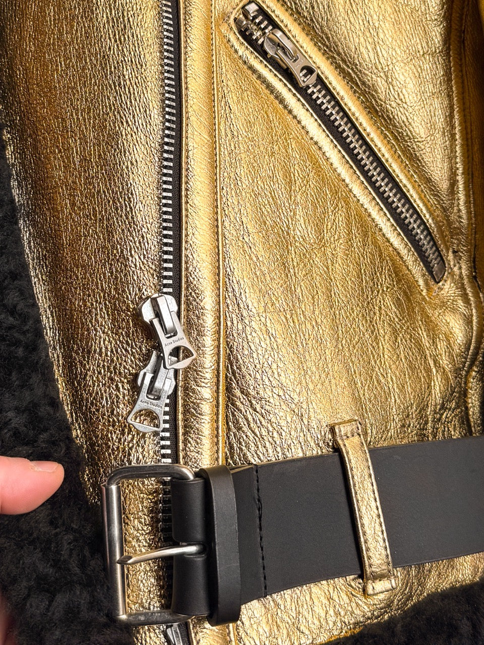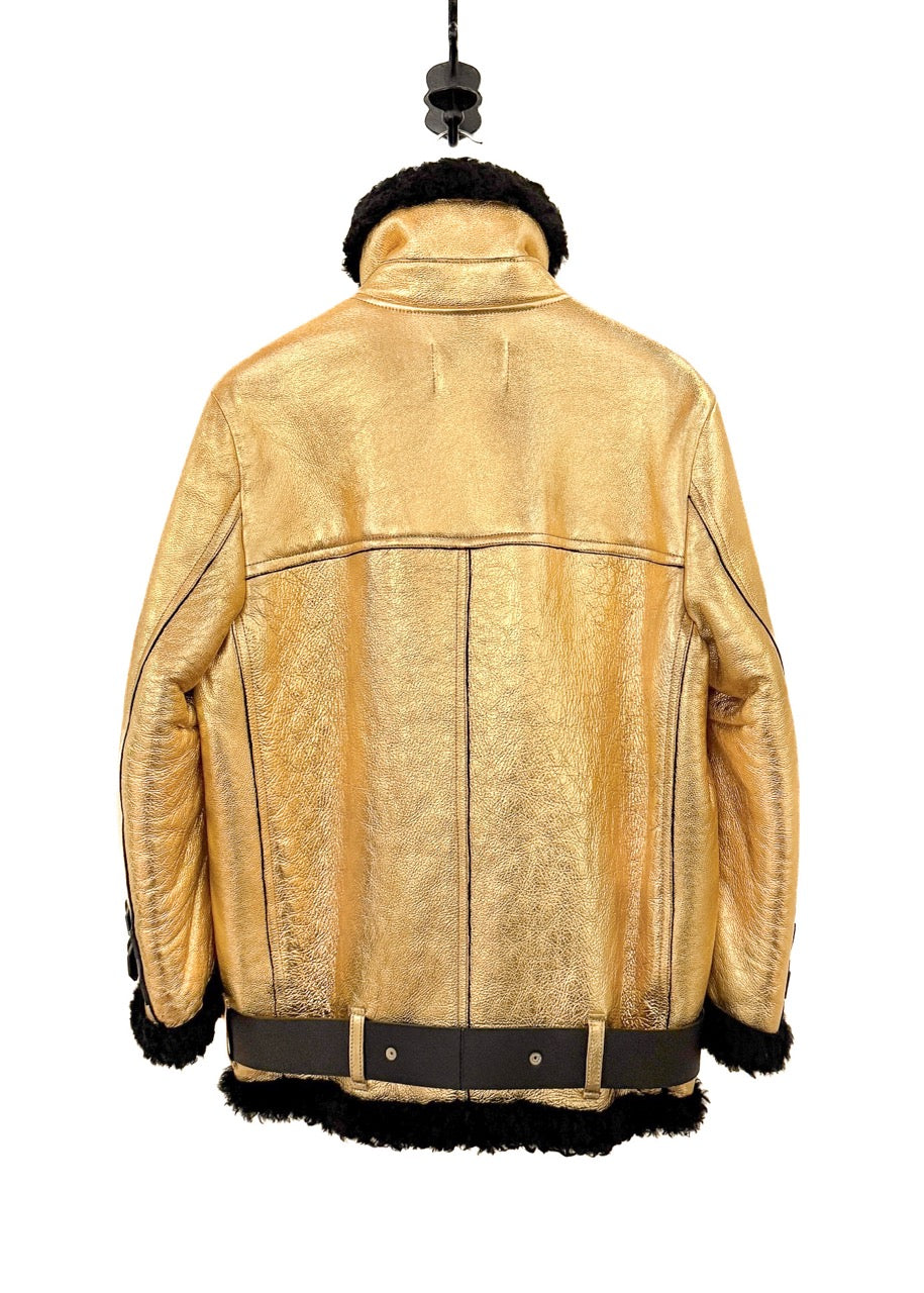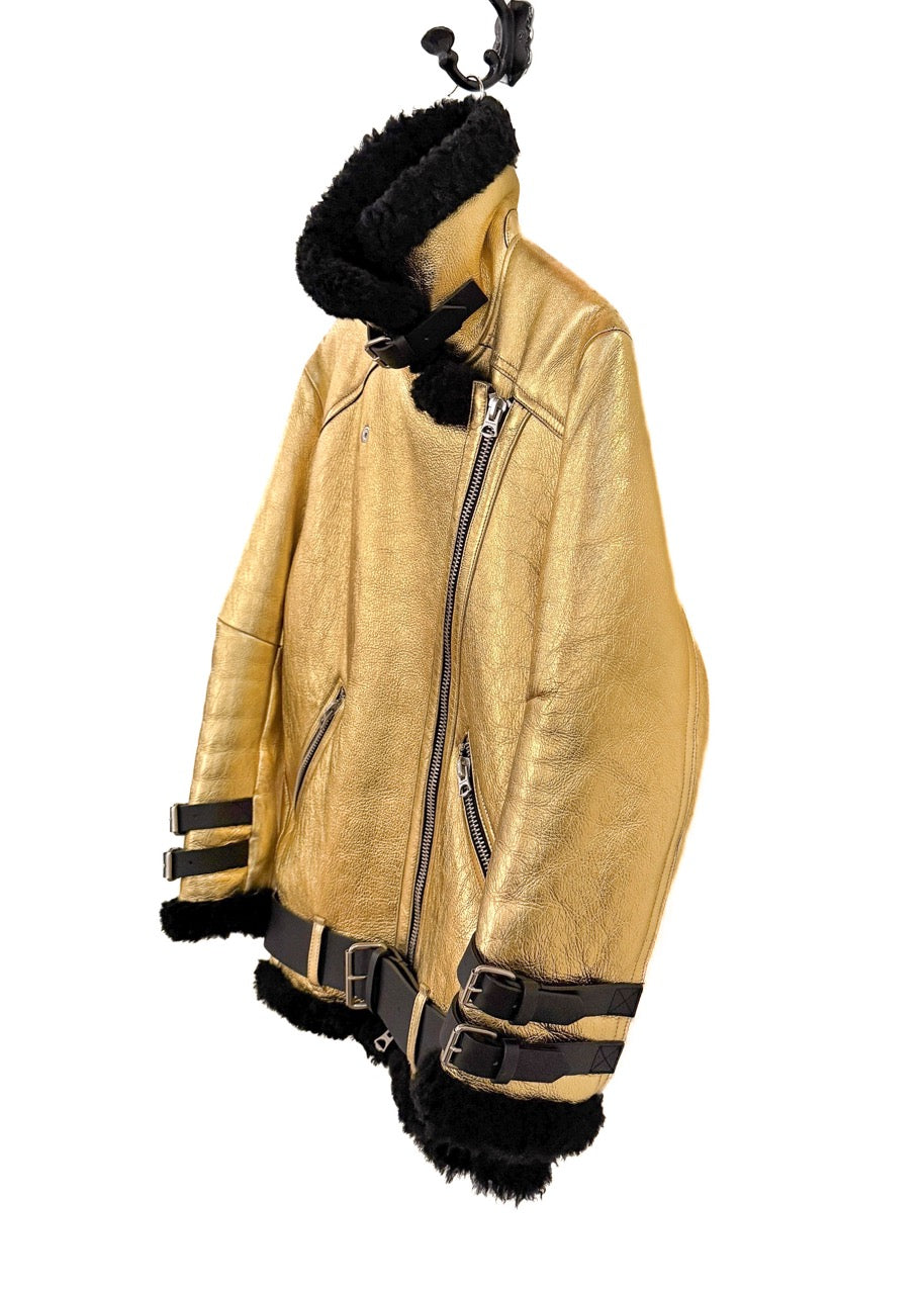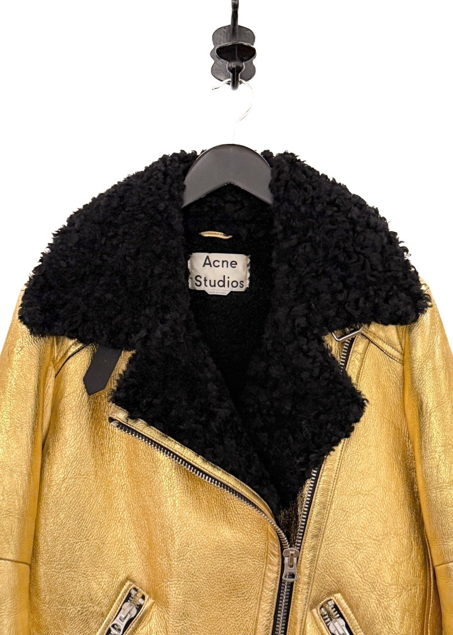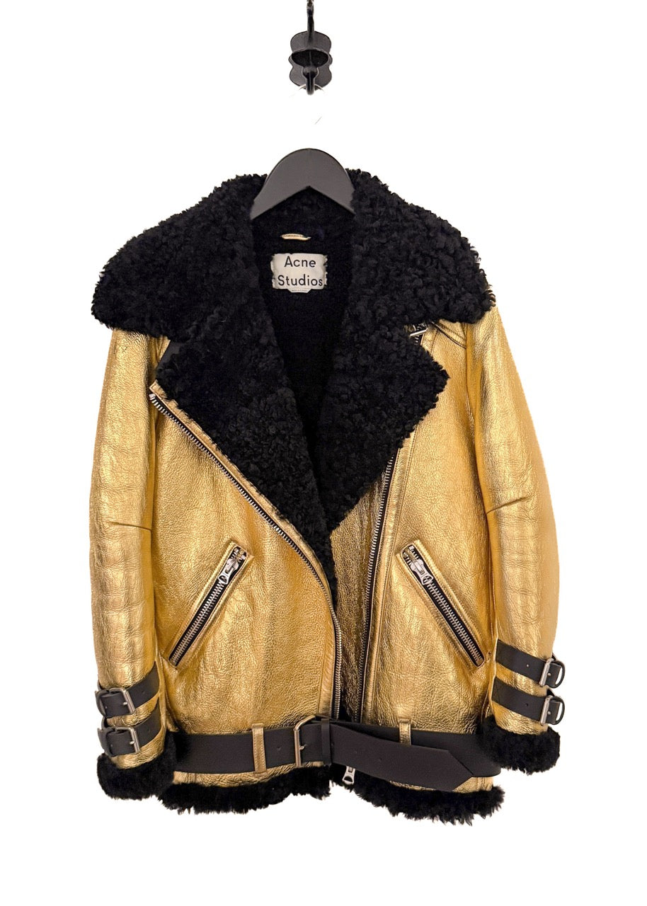 Iconic Velocite model from Acne Studio. Limited edition piece from the Fall Winter 2016 collection. Metallic gold shearling coat in a structured biker fit. Large fit. Asymmetrical zip front with dual Acne Studios engraved zipper pulls. Wide notched shearling collar. Black shearling lining throughout. Two (2) front zip pockets. Adjustable contrasting black leather belt at hem. Buckle-adjustable cuffs. Branded silver-tone metal hardware. Long sleeves. Straight hem with shearling trim. Made in Turkey.