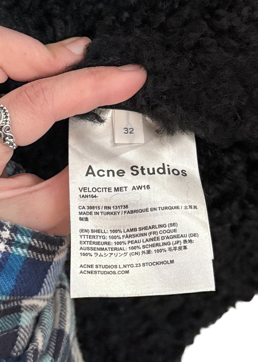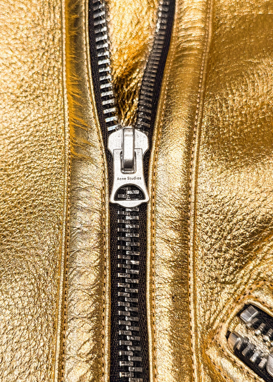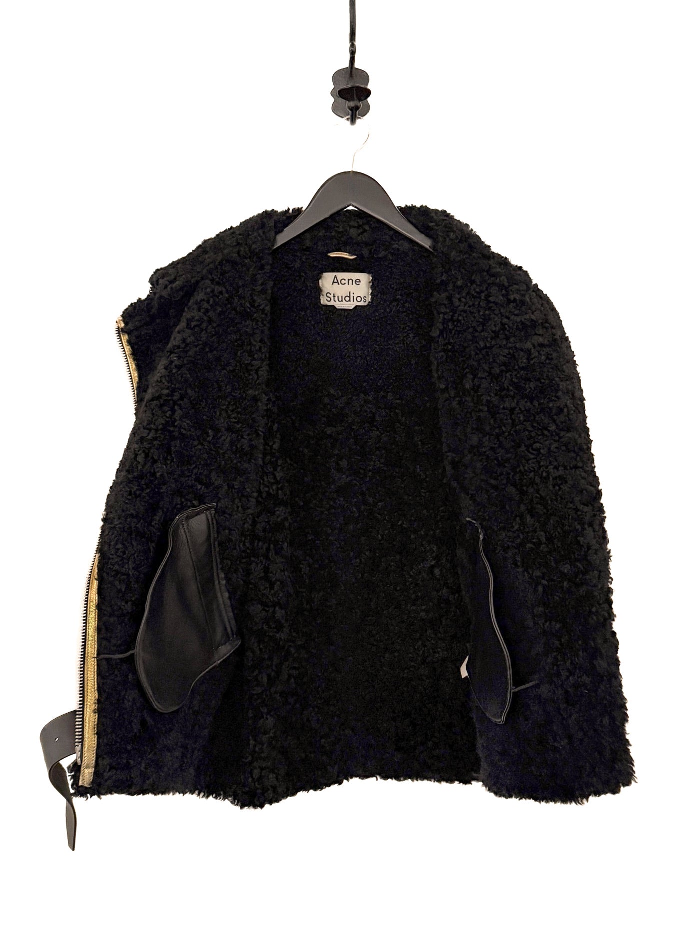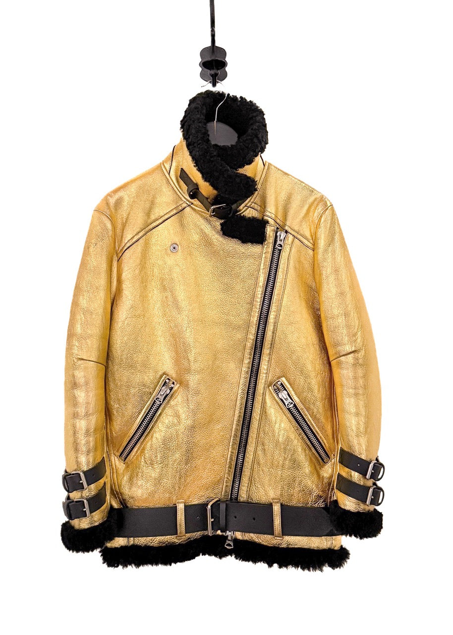 Iconic Velocite model from Acne Studio. Limited edition piece from the Fall Winter 2016 collection. Metallic gold shearling coat in a structured biker fit. Large fit. Asymmetrical zip front with dual Acne Studios engraved zipper pulls. Wide notched shearling collar. Black shearling lining throughout. Two (2) front zip pockets. Adjustable contrasting black leather belt at hem. Buckle-adjustable cuffs. Branded silver-tone metal hardware. Long sleeves. Straight hem with shearling trim. Made in Turkey.