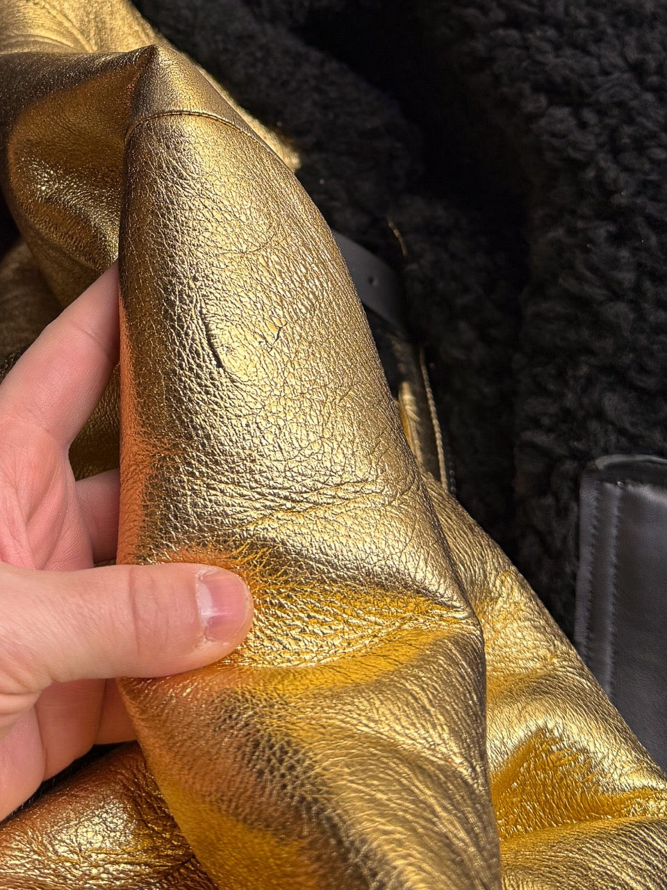 CONDITION: Pre-owned, in very good condition. Light creasing and subtle surface wear visible on the metallic leather, consistent with gentle use. Very light cracking on the right shoulder. Shearling shows no visible defects. Please refer to the pictures and measurements. Feel free to inquire for additional information prior to purchase.
