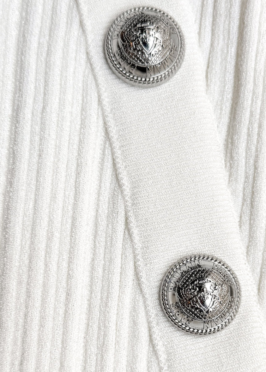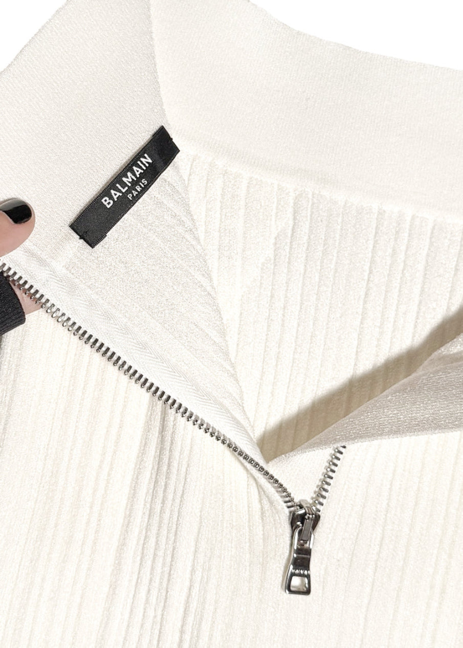 Maille côtelée avec motif semi-transparent à multiples rayures. Boutons en métal argenté gravés Balmain au devant. Fermeture éclair arrière avec tirette gravée Balmain. Matière extensible. Faite en Italie.