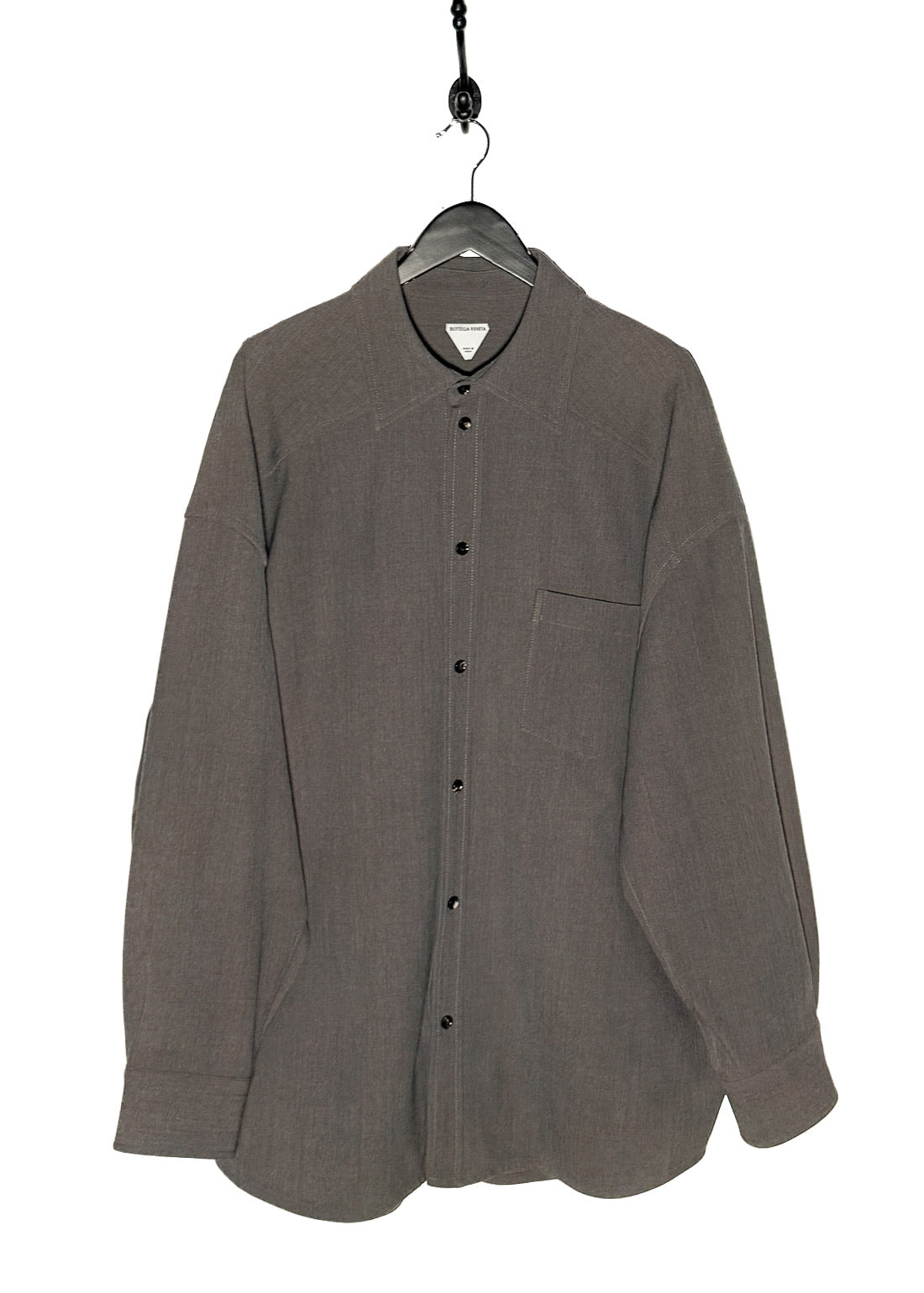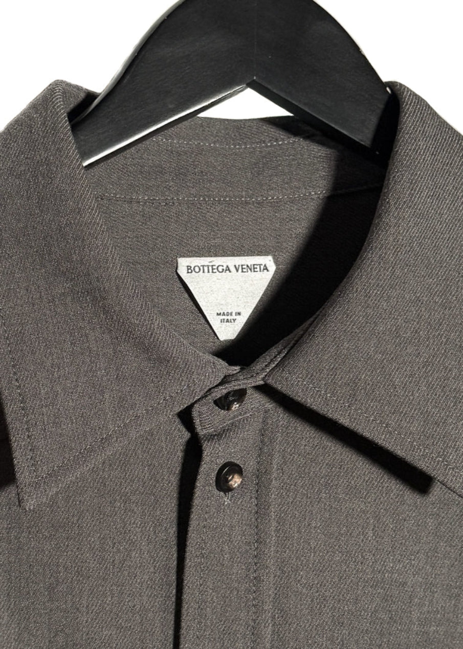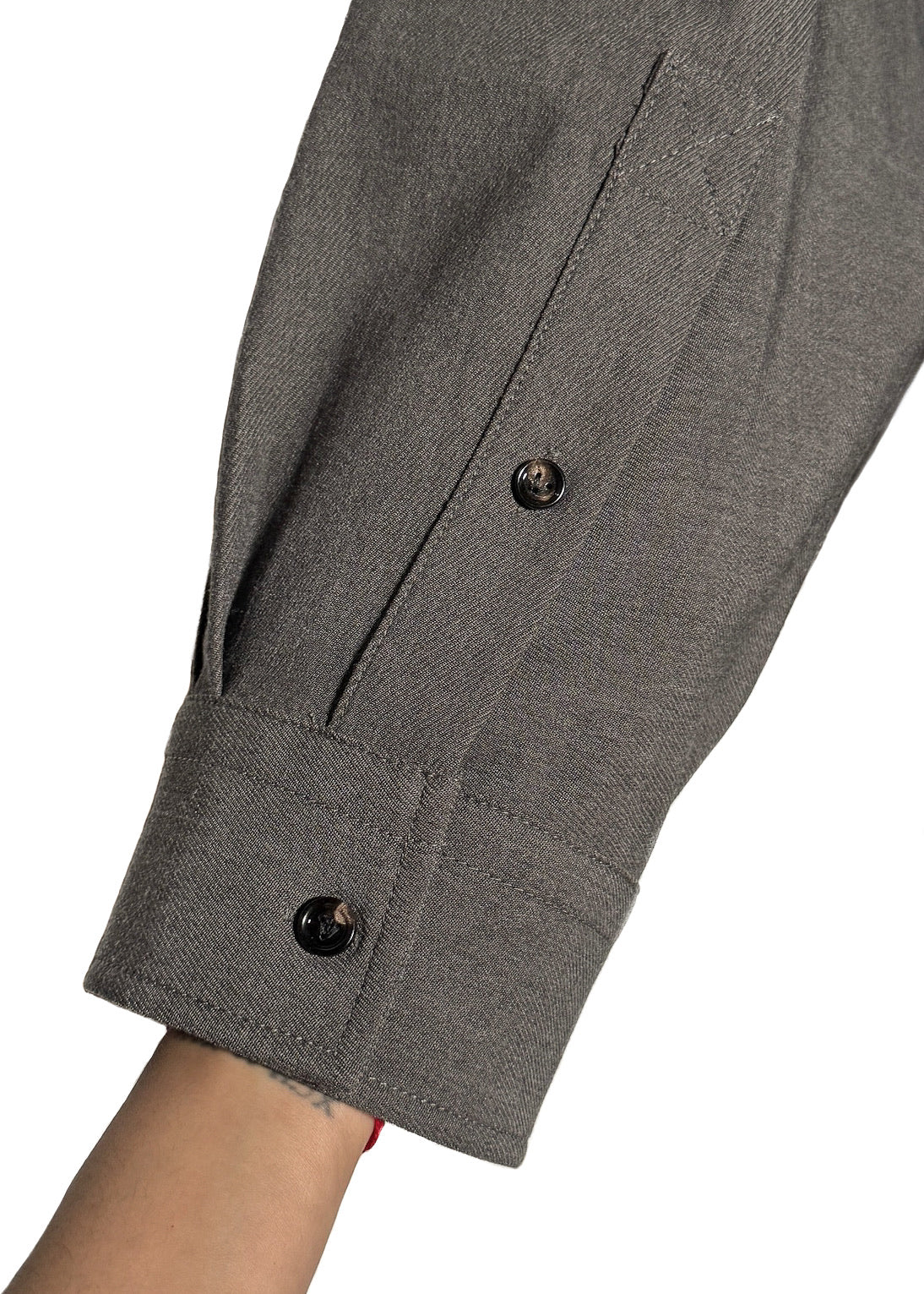 Conçue en sergé de laine grise au tombé lisse et structuré. Chemise épaisse. Col pointu et fermeture avant boutonnée. Détail de couture en V autour des boutons. Poche poitrine plaquée. Épaules tombantes avec manches articulées. Poignets boutonnés. Ourlet droit. Empiècement dorsal avec pli central. Coupe décontractée. Faite en Italie.
