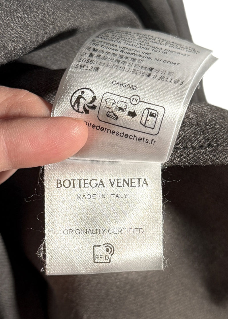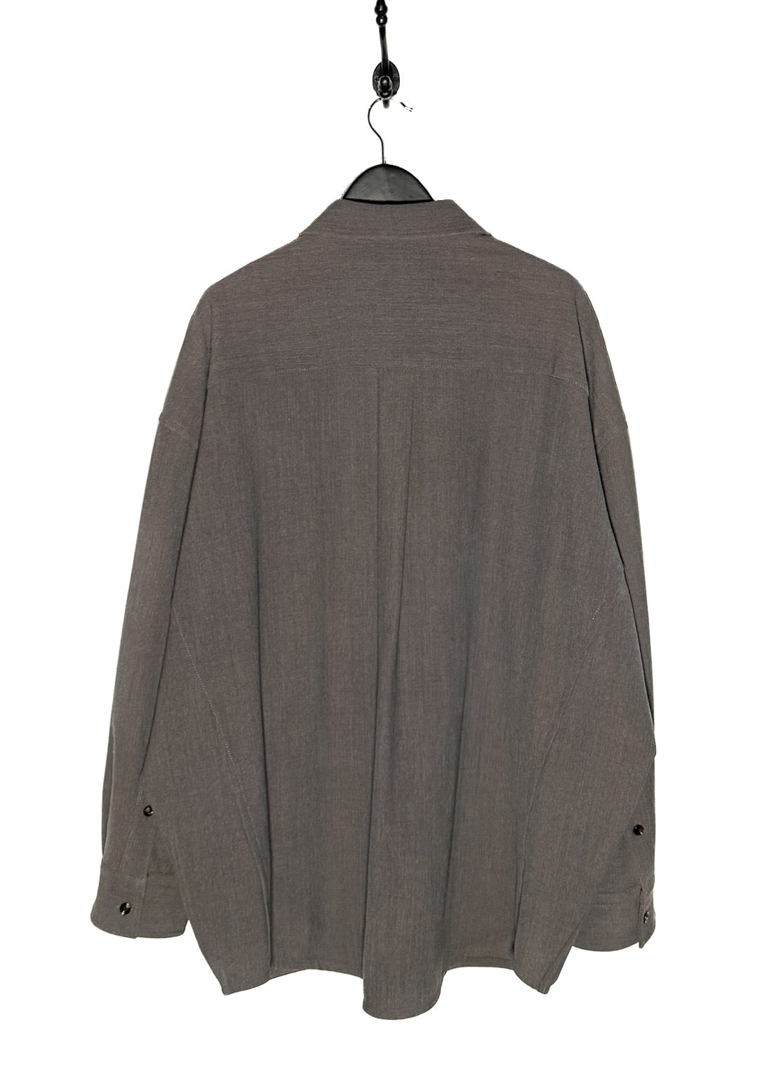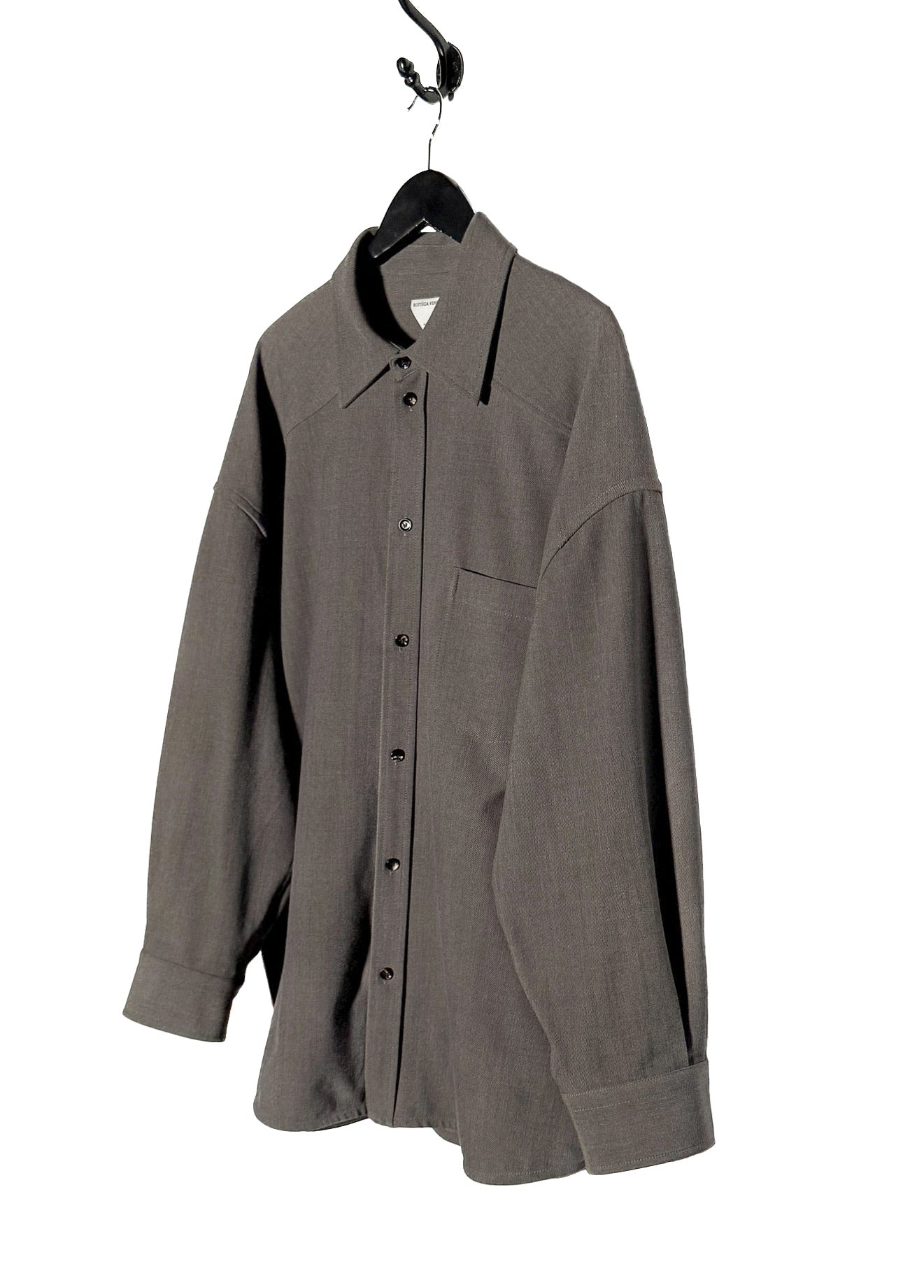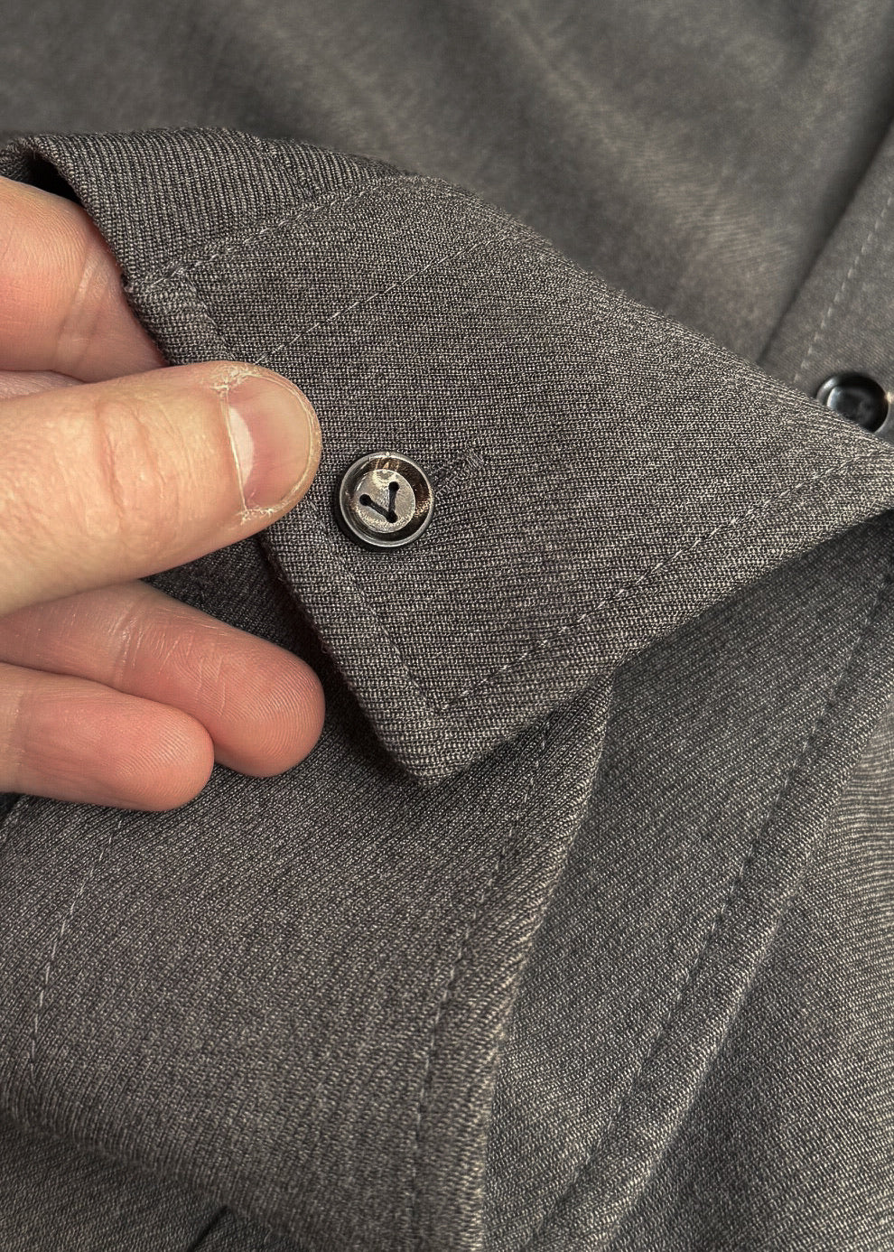 Conçue en sergé de laine grise au tombé lisse et structuré. Chemise épaisse. Col pointu et fermeture avant boutonnée. Détail de couture en V autour des boutons. Poche poitrine plaquée. Épaules tombantes avec manches articulées. Poignets boutonnés. Ourlet droit. Empiècement dorsal avec pli central. Coupe décontractée. Faite en Italie.