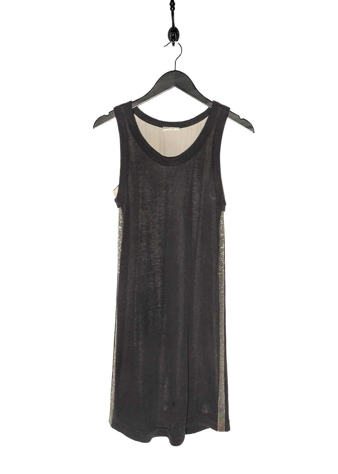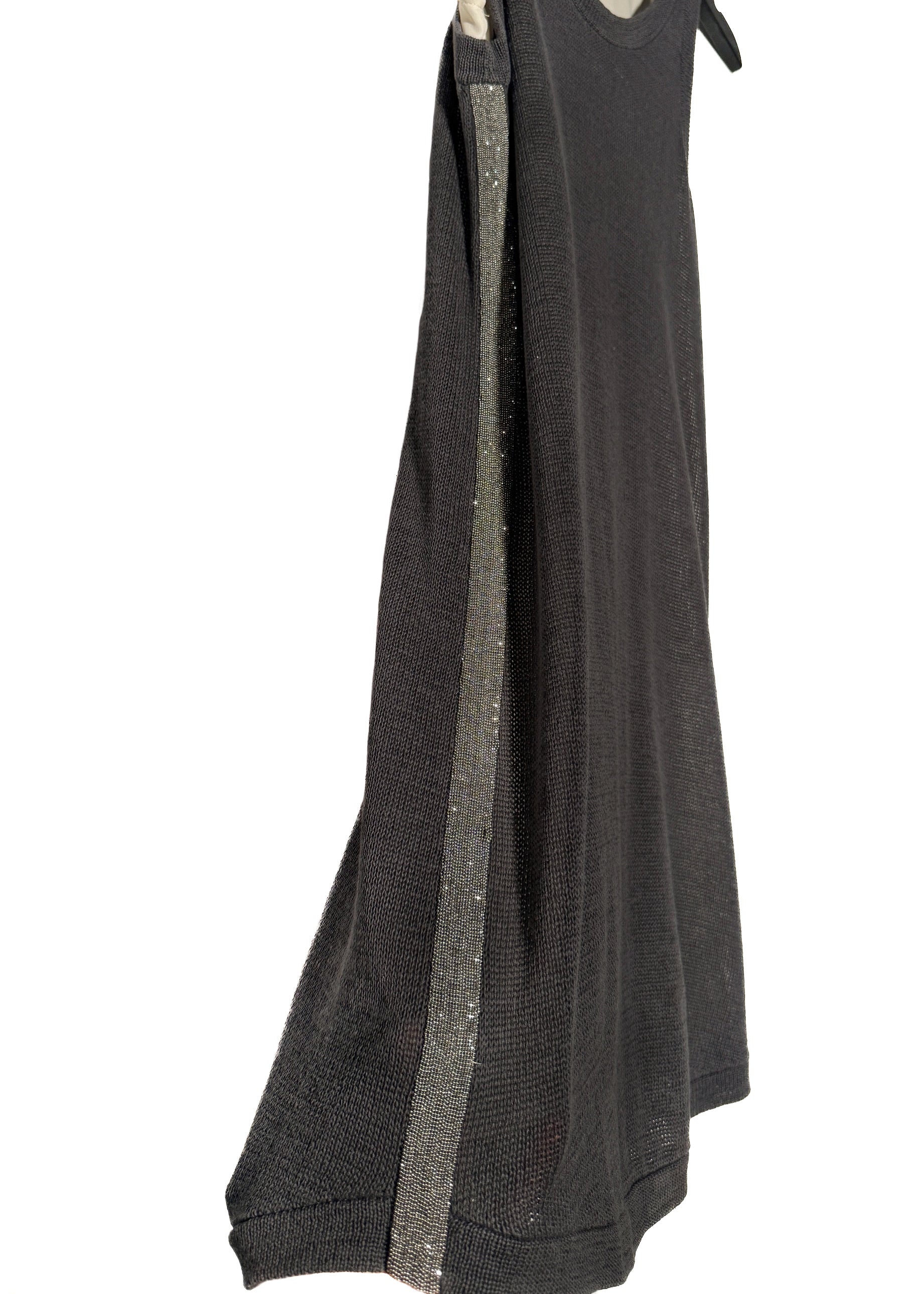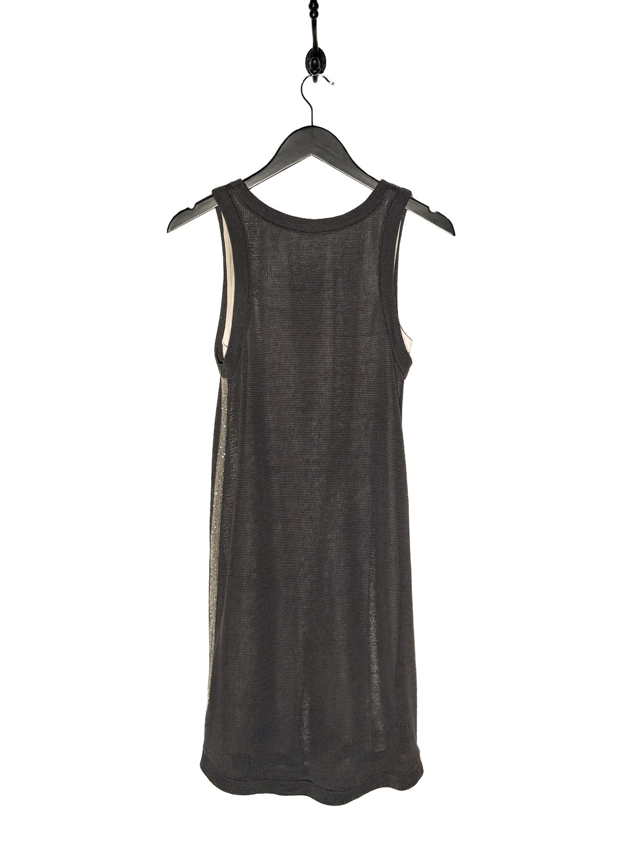 Sleeveless dress with a fine grey knit outer layer with a contrasting ivory layered construction. Straight silhouette. Knee-length. Scoop neckline. Ribbed knit collar and armholes. Monili-embellished side bands on both sides. Layered inner panels visible at arm openings. Made in Italy.
