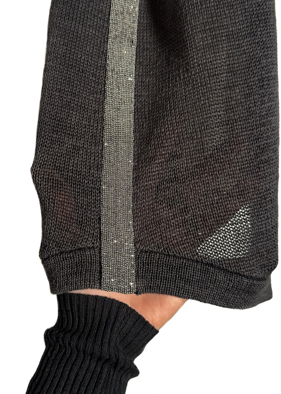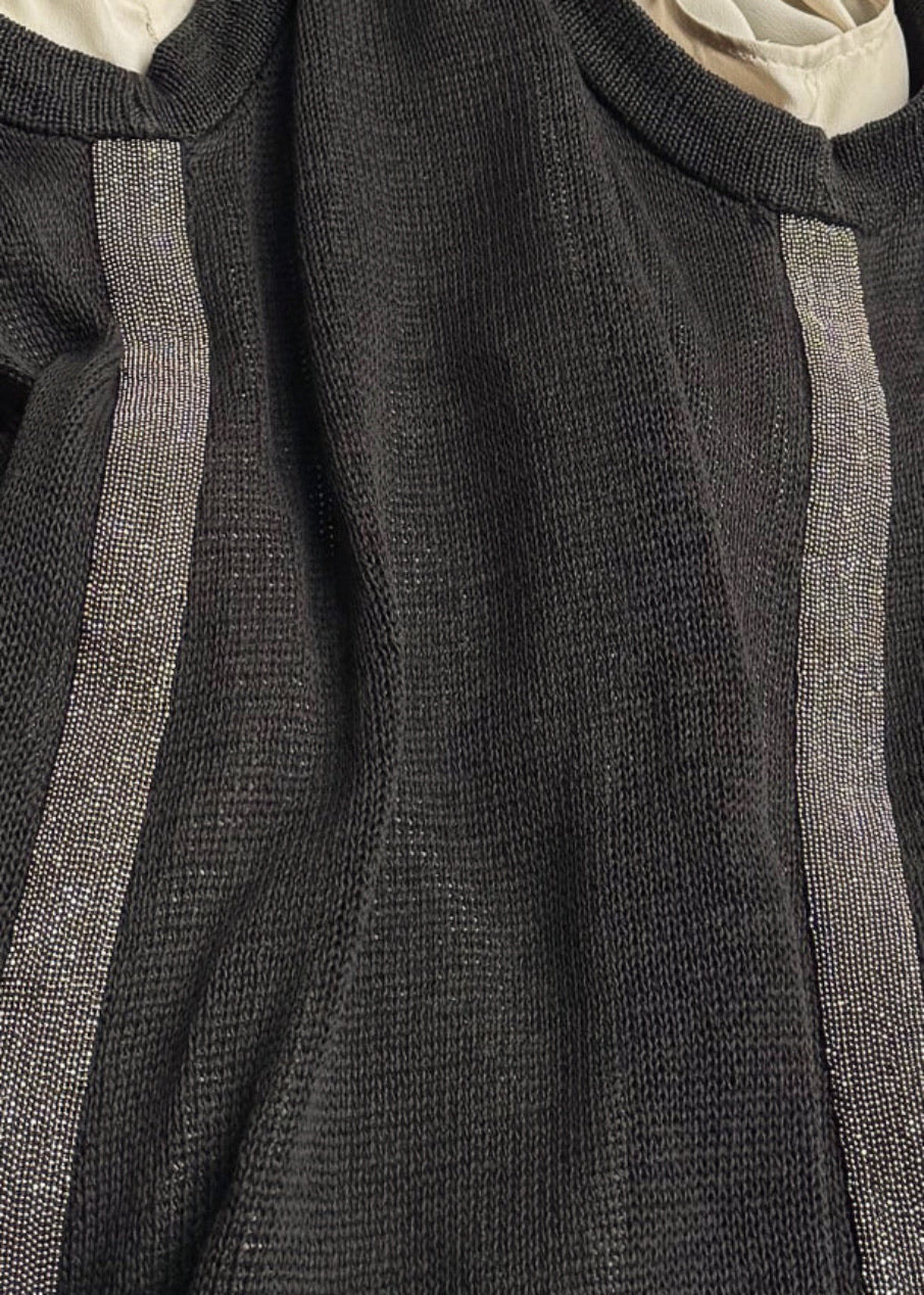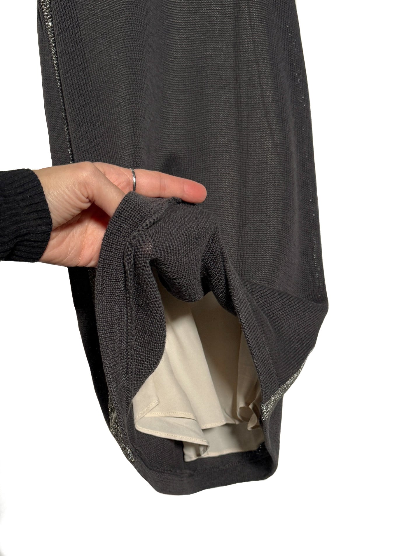 Sleeveless dress with a fine grey knit outer layer with a contrasting ivory layered construction. Straight silhouette. Knee-length. Scoop neckline. Ribbed knit collar and armholes. Monili-embellished side bands on both sides. Layered inner panels visible at arm openings. Made in Italy.