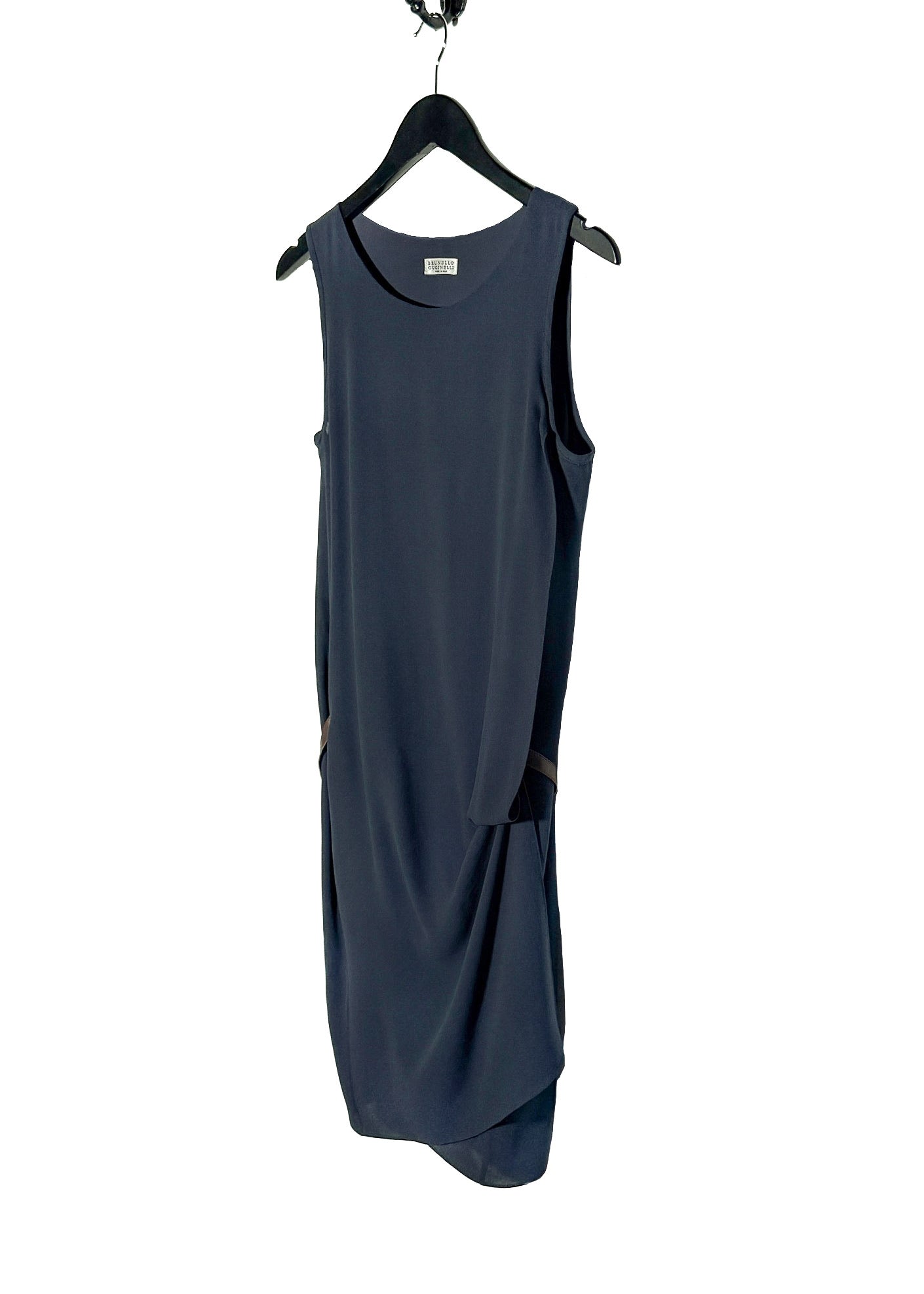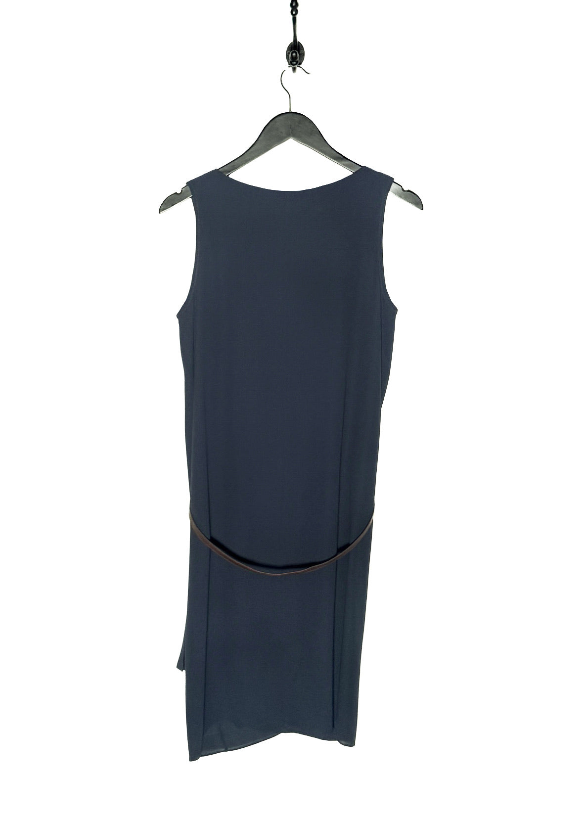 Soie fluide légère semi-transparente avec tombé souple. Sans manches. Encolure ronde. Coupe décontractée. Longueur midi. Ourlet asymétrique. Ceinture intégrée en cuir brun à porter au dos. Coutures minimales. Faite en Italie.