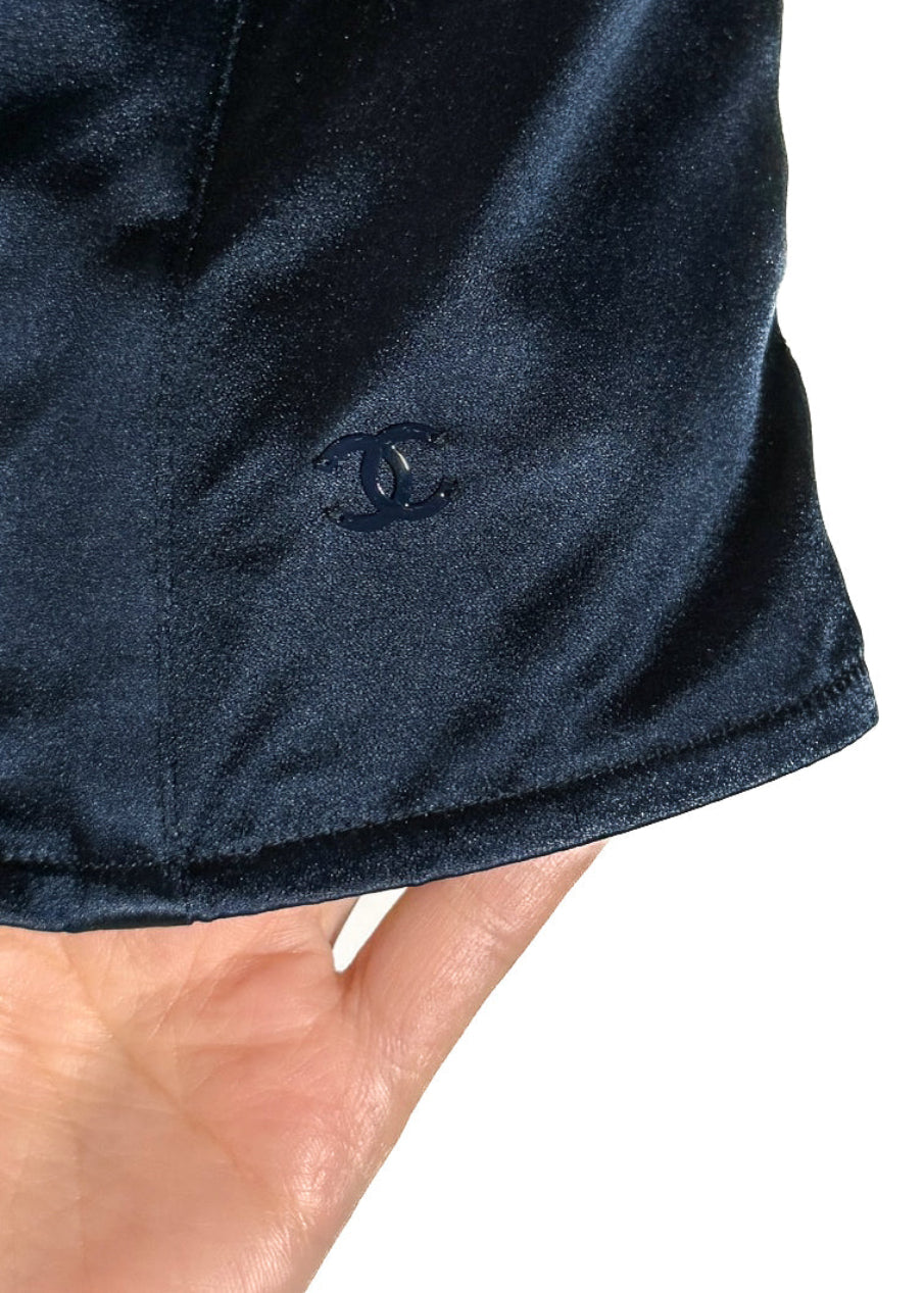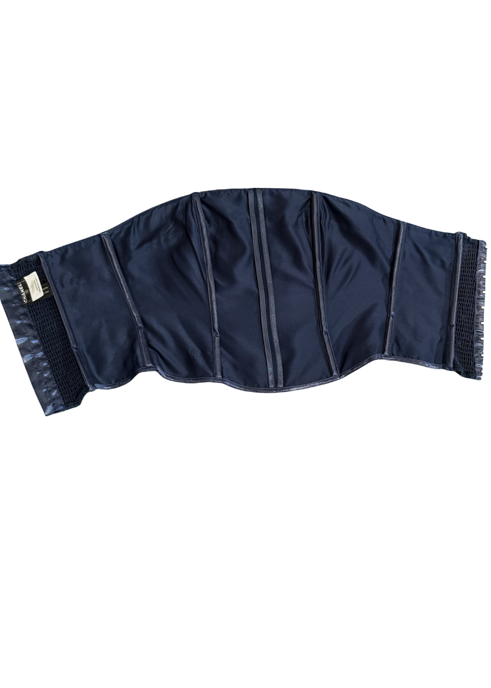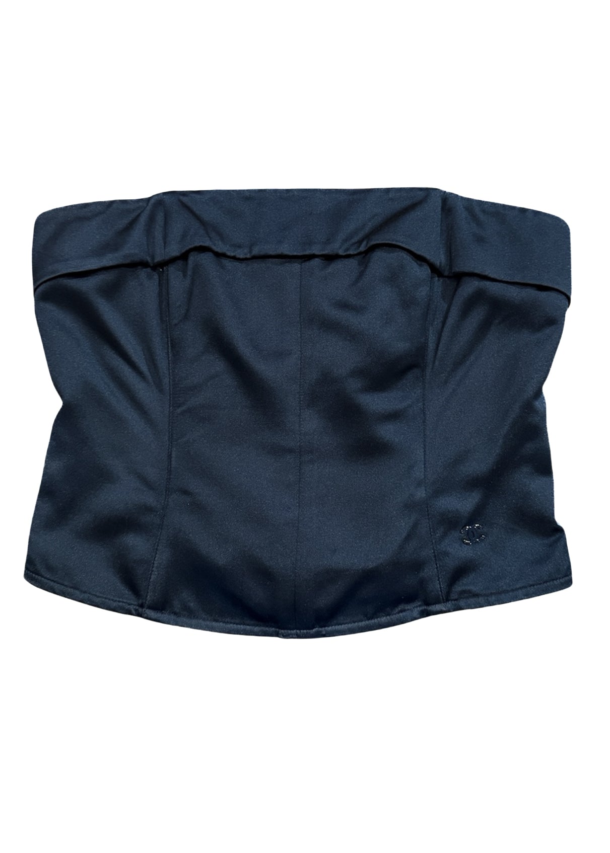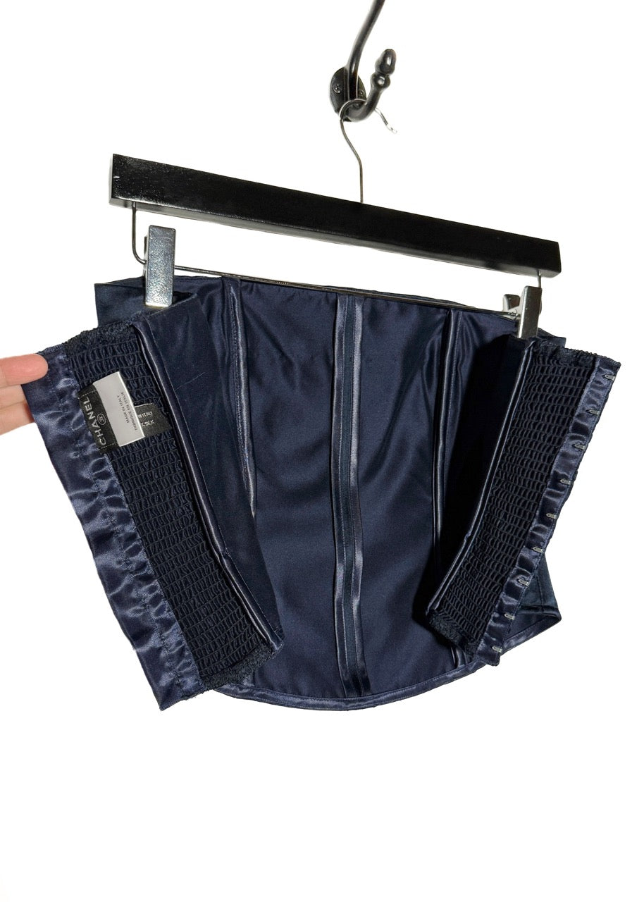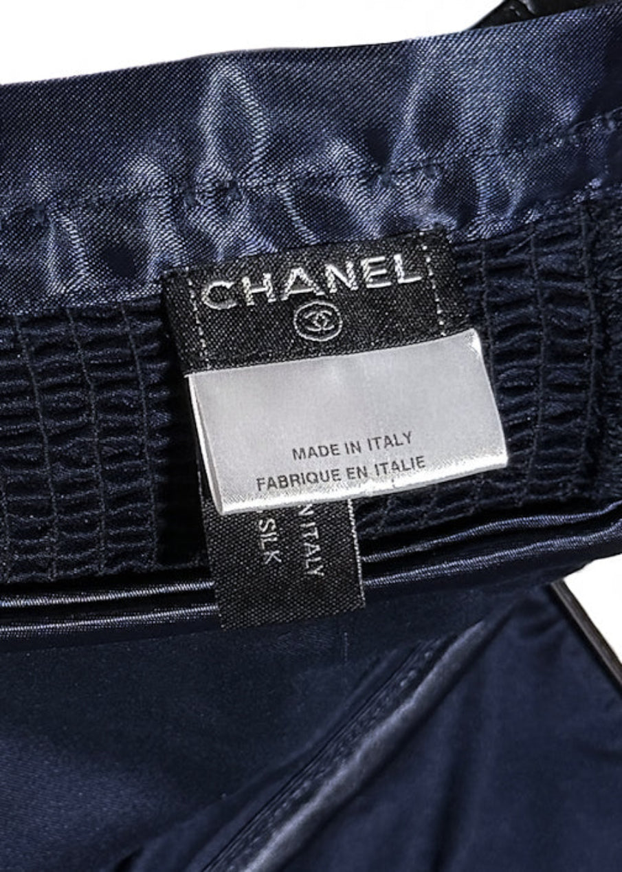De la collection croisière 2008. Conçu avec une structure sans bretelles. Extérieur en satin de soie bleu marine, lisse et lumineux. Baleines internes sur toute la doublure pour le maintien. Fermeture par agrafes sur des panneaux arrière élastiques froncés. Ligne de bas arrondie. Petit logo CC ton sur ton discret à l’avant inférieur. Entièrement doublé. Fait en Italie.