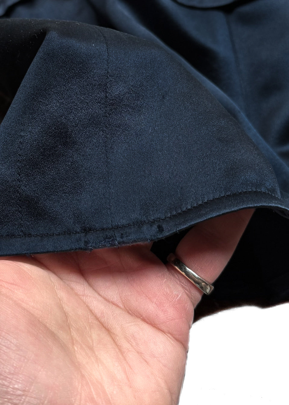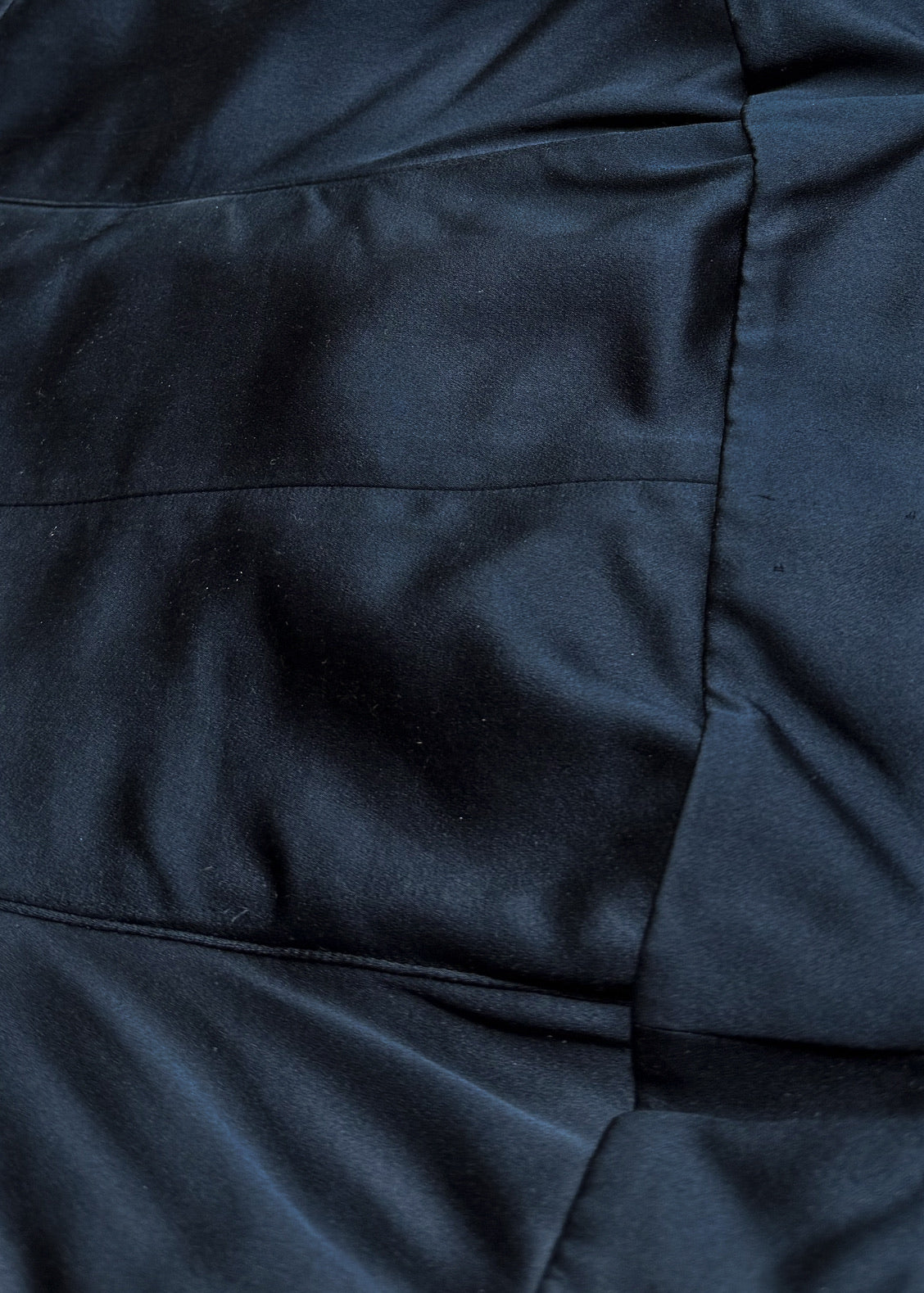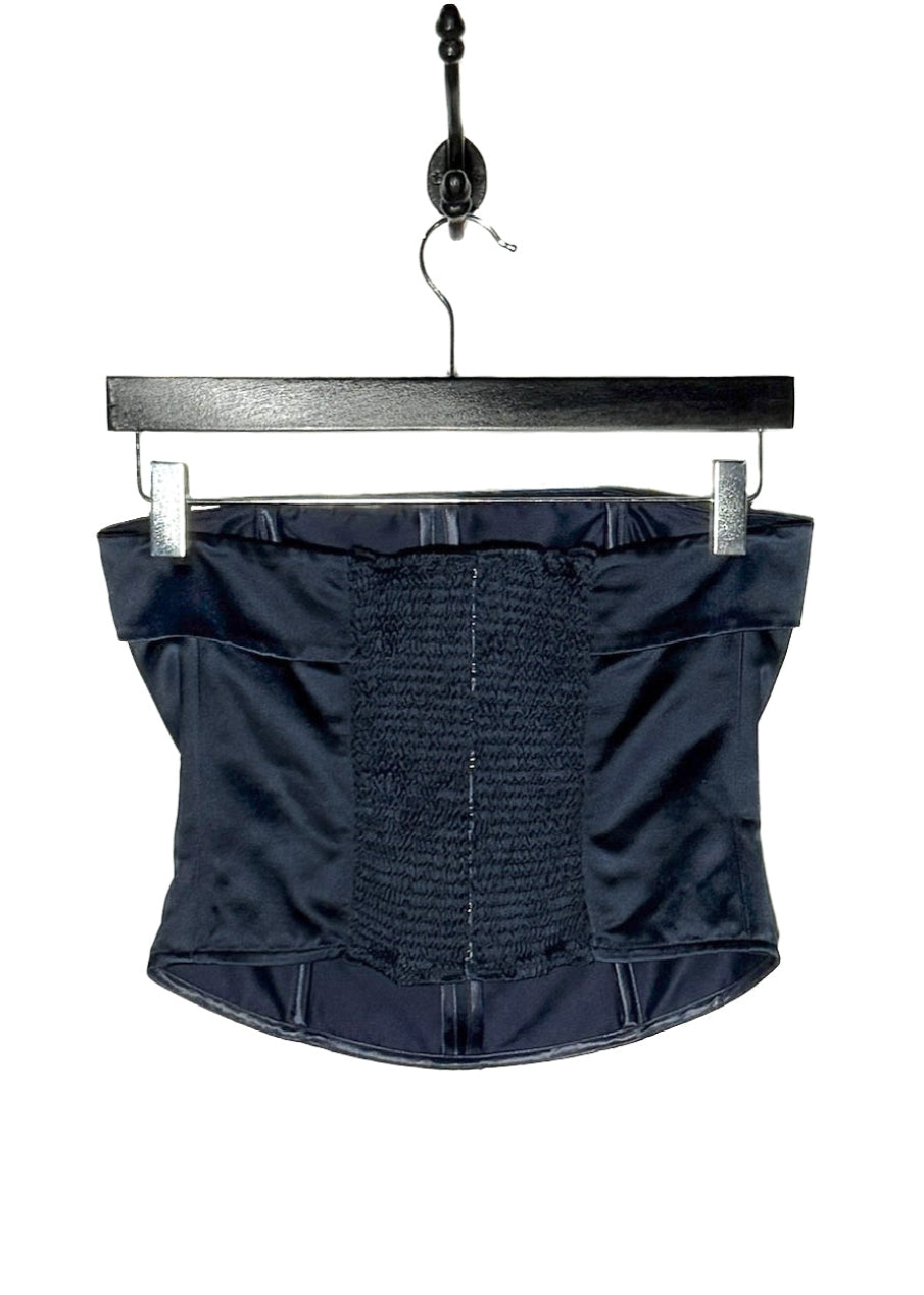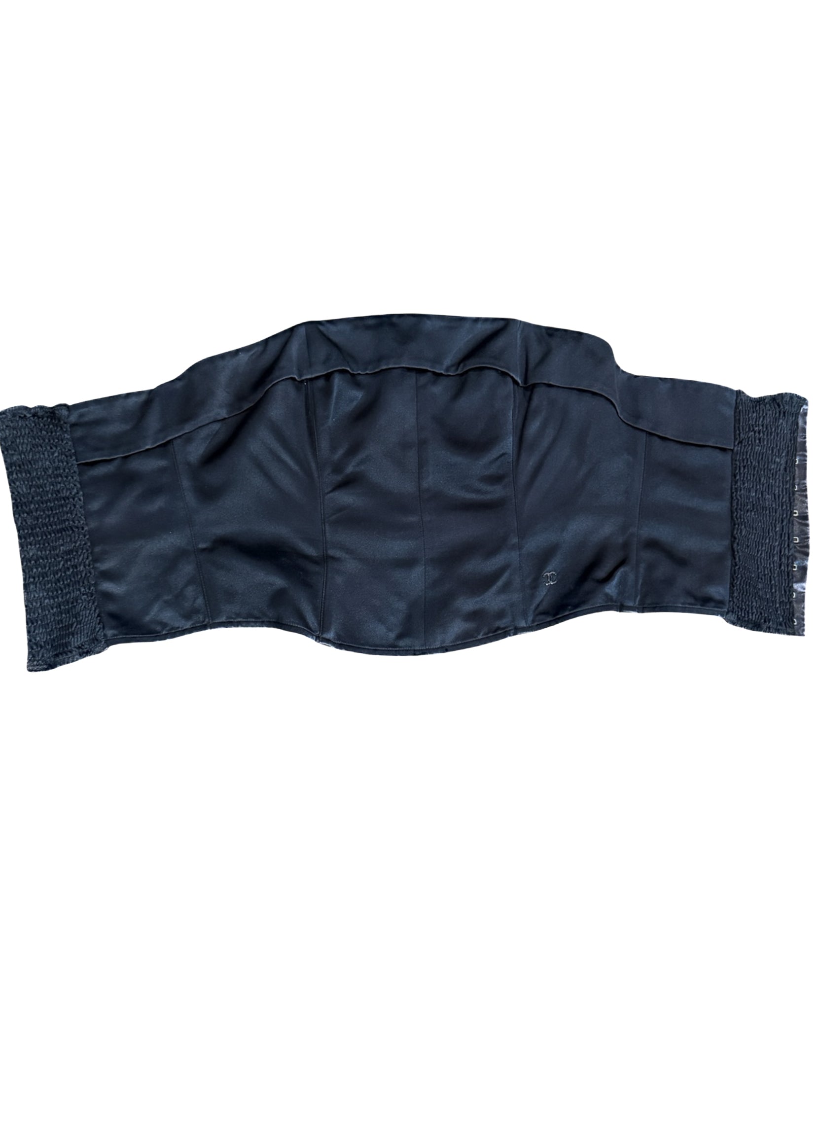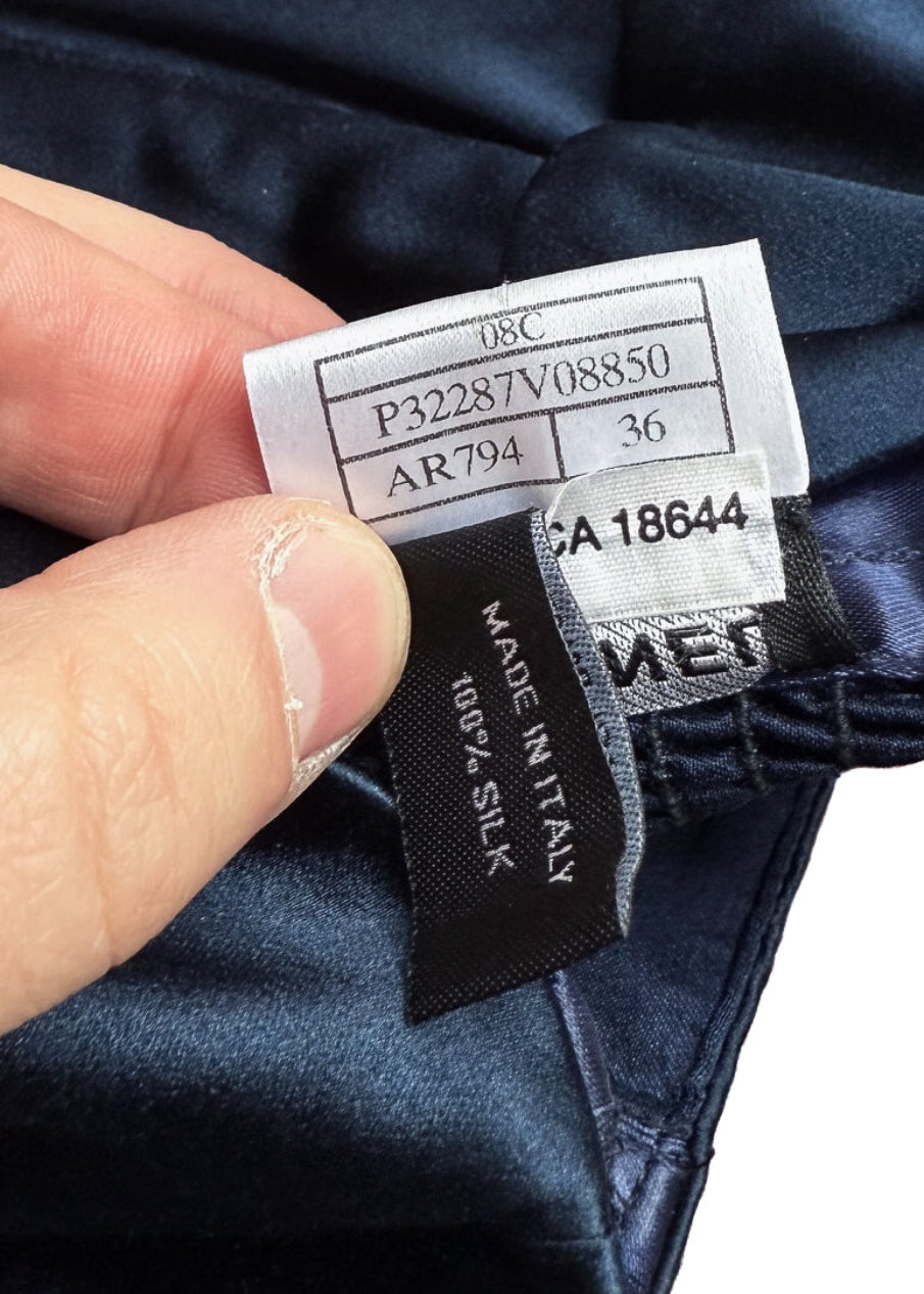 De la collection croisière 2008. Conçu avec une structure sans bretelles. Extérieur en satin de soie bleu marine, lisse et lumineux. Baleines internes sur toute la doublure pour le maintien. Fermeture par agrafes sur des panneaux arrière élastiques froncés. Ligne de bas arrondie. Petit logo CC ton sur ton discret à l’avant inférieur. Entièrement doublé. Fait en Italie.