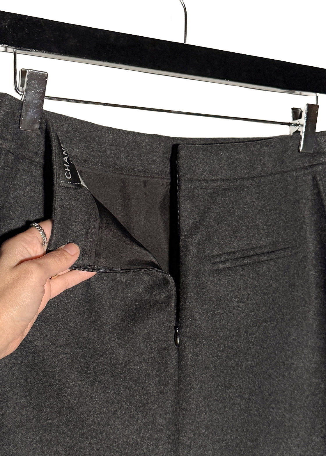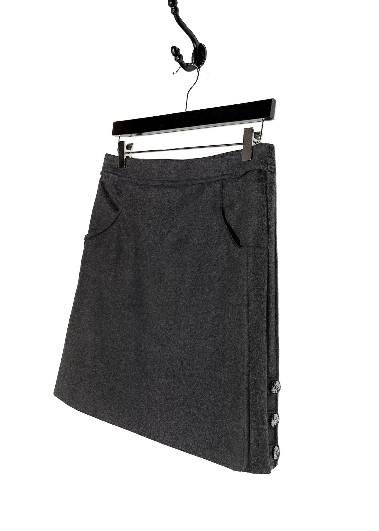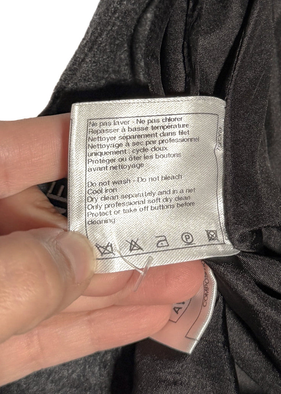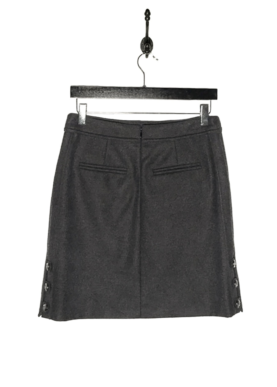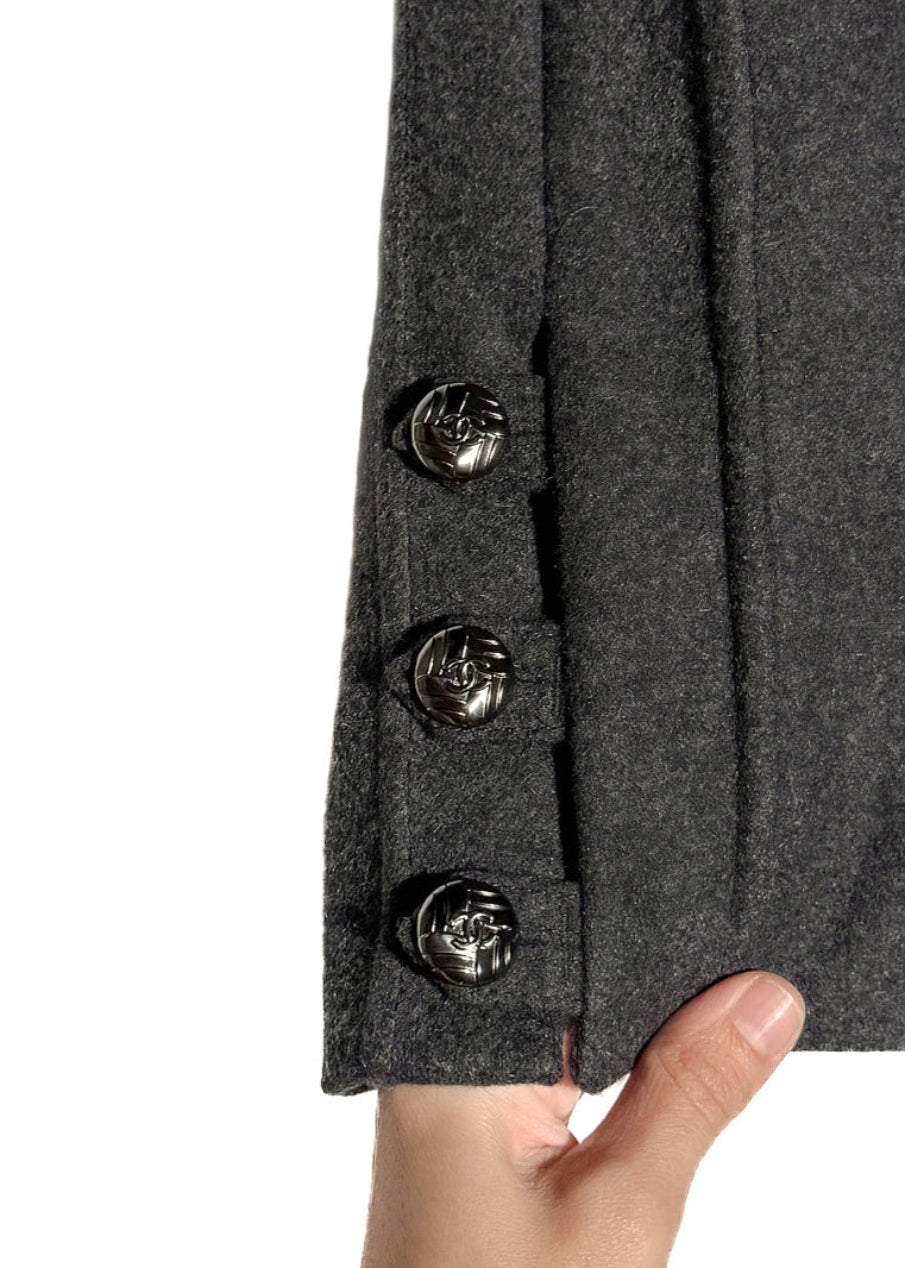 Issue de la collection Automne Hiver 2011. Tissu flanelle gris anthracite en mélange de laine et angora. Poches fendues sur les côtés à l’avant et poches passepoilées décoratives à l’arrière. Ornée de boutons fonctionnels logo CC ton canon de fusil le long des deux côtés. Fermeture zippée dissimulée à l’arrière. Entièrement doublée. Faite en Italie.