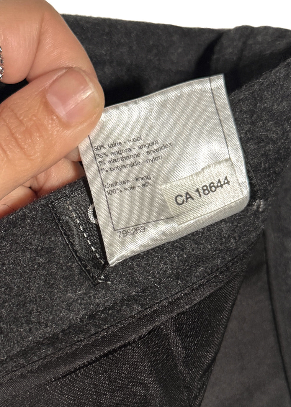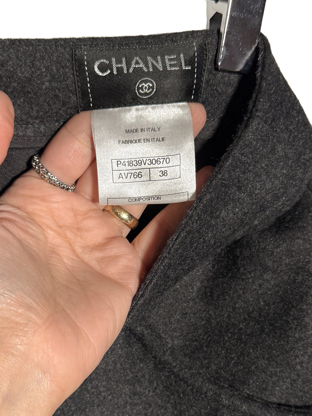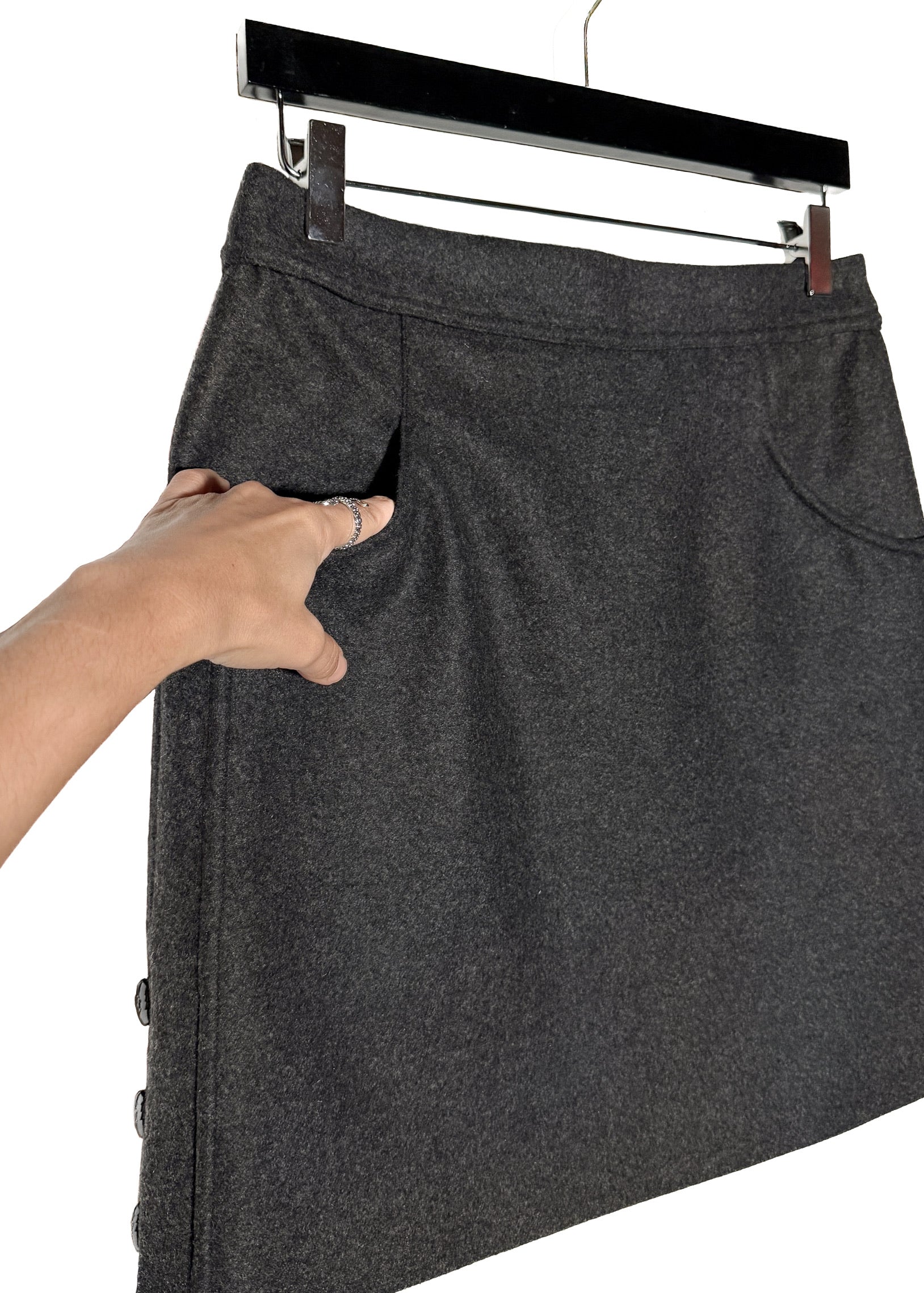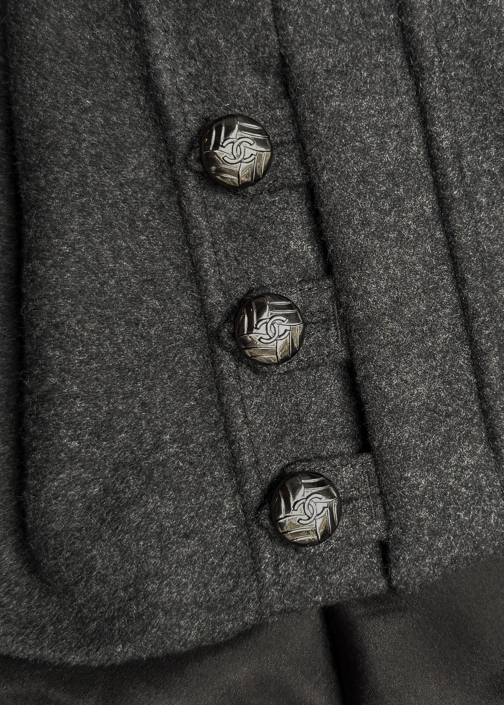 Issue de la collection Automne Hiver 2011. Tissu flanelle gris anthracite en mélange de laine et angora. Poches fendues sur les côtés à l’avant et poches passepoilées décoratives à l’arrière. Ornée de boutons fonctionnels logo CC ton canon de fusil le long des deux côtés. Fermeture zippée dissimulée à l’arrière. Entièrement doublée. Faite en Italie.
