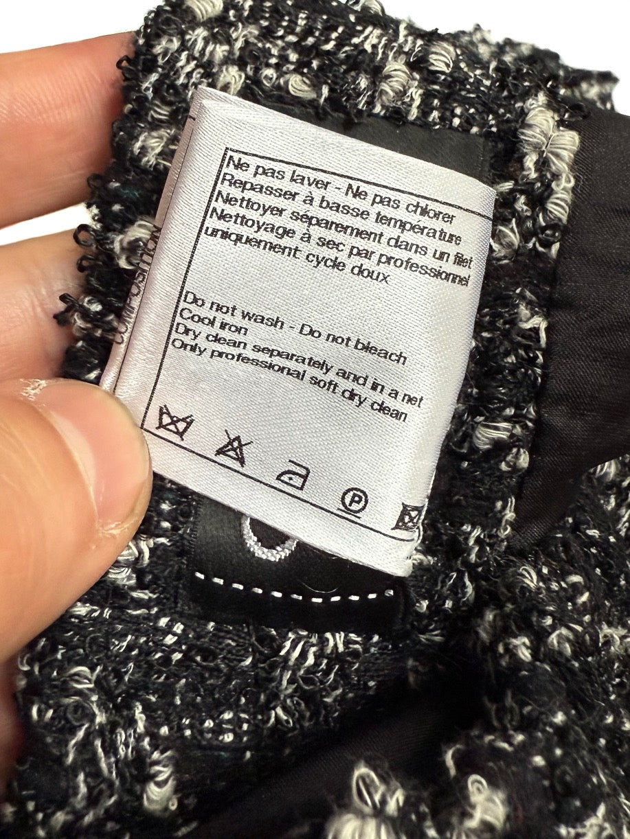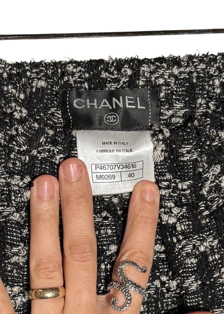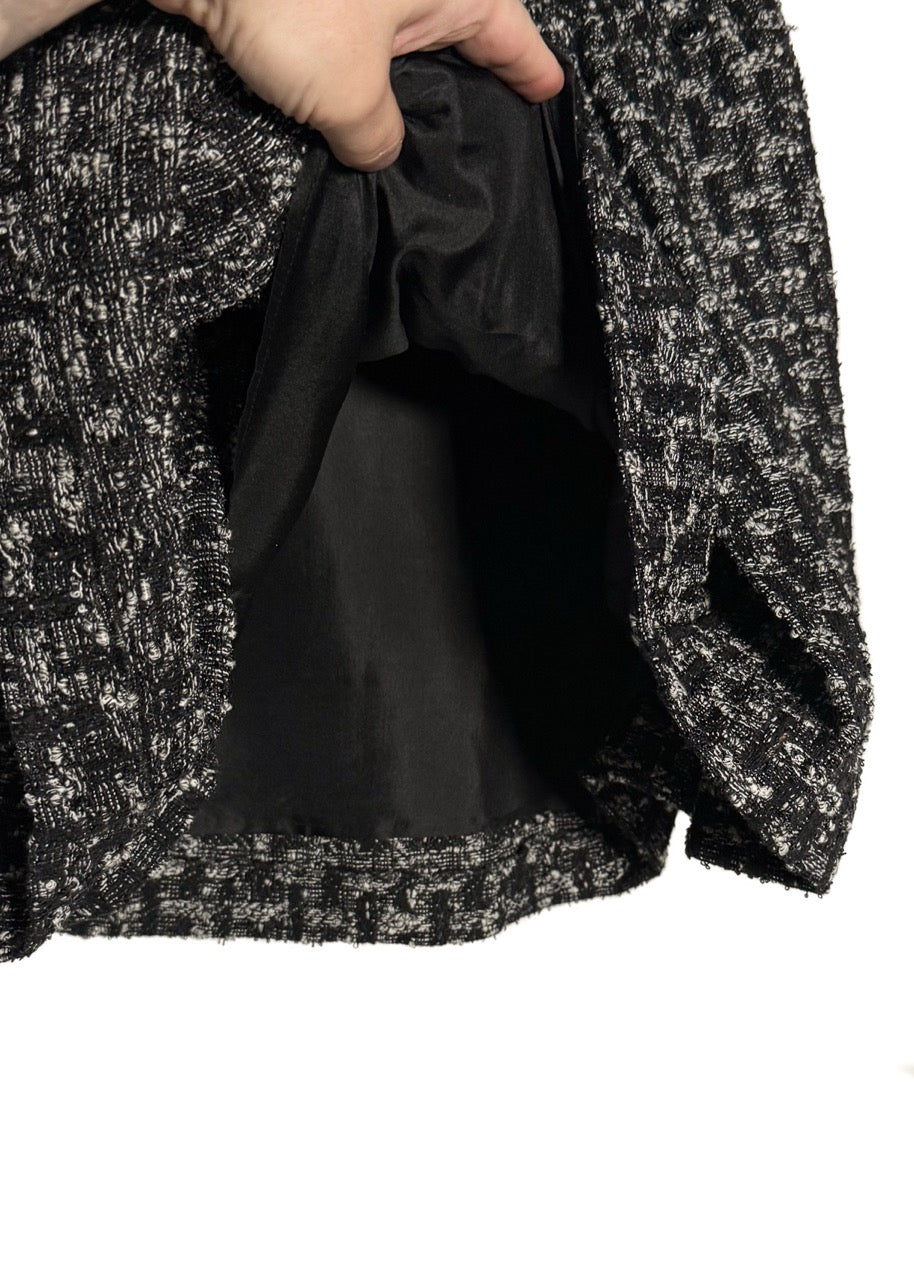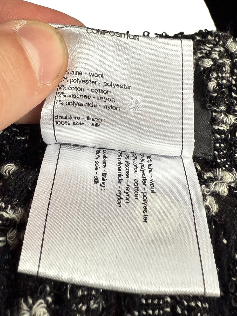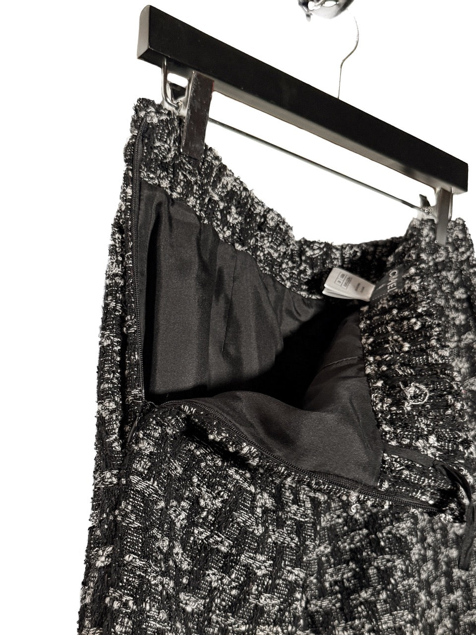 De la collection Pré-Automne 2013, une capsule saisonnière proposée entre les collections principales. Tweed texturé noir et blanc à motif carreaux intégral, rehaussé de fils multicolores discrets tissés dans l’ensemble. Présente des plis, une taille élastiquée et une fermeture zippée sur le côté. Bouton noir griffé CC à l’avant gauche avec poches prises dans la couture. La poche droite n’a pas été ouverte. Entièrement doublée de soie noire. Faite en Italie.
