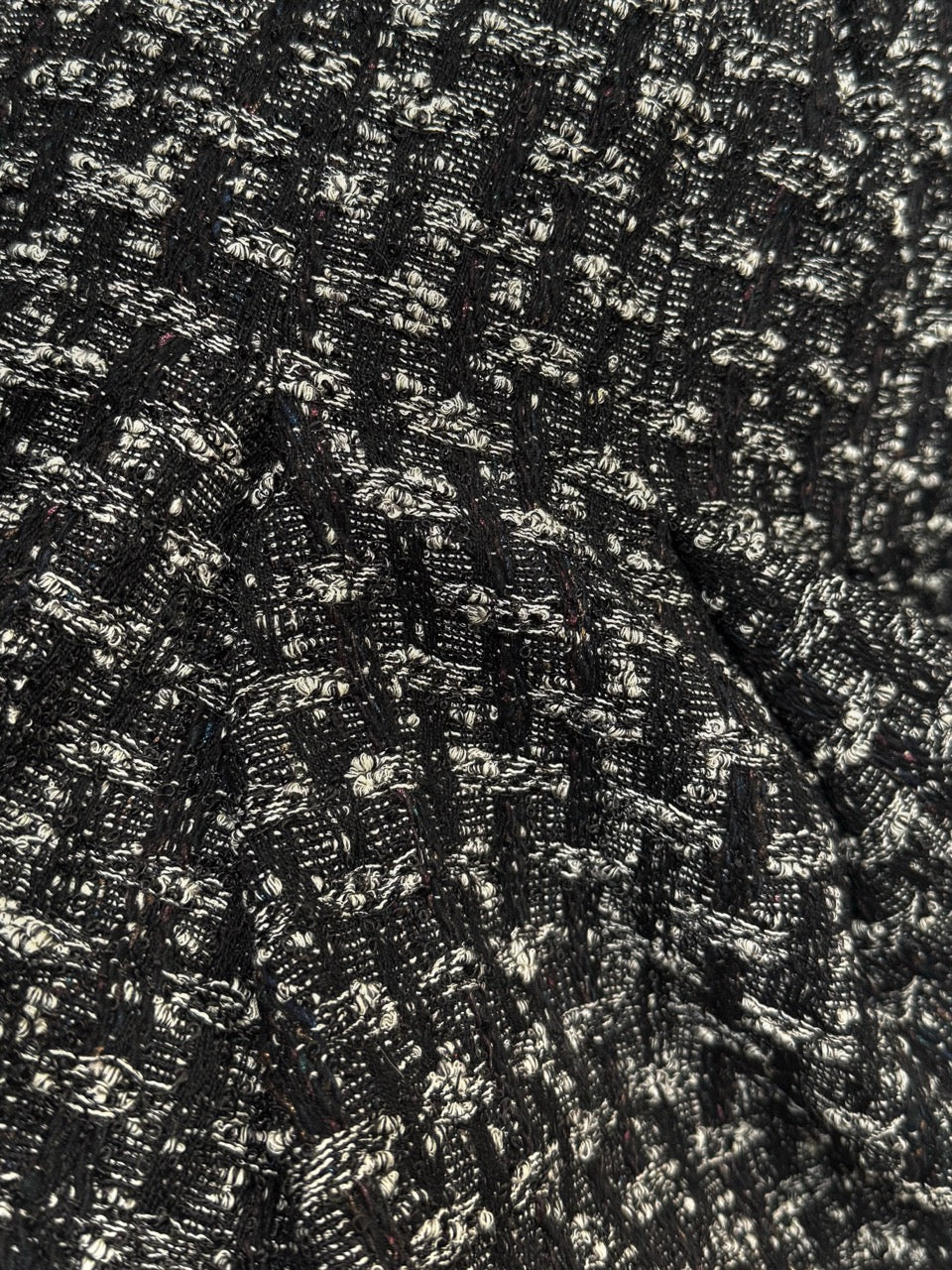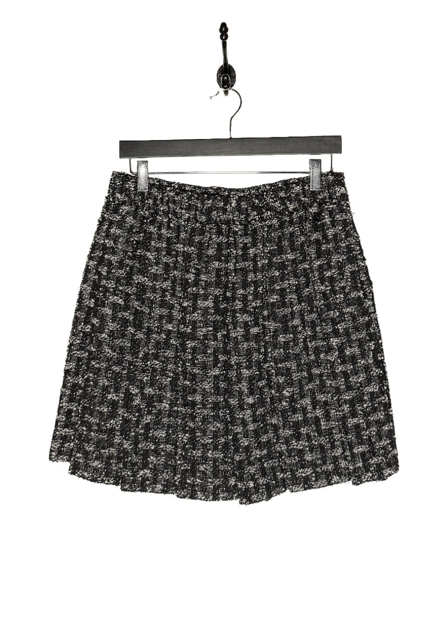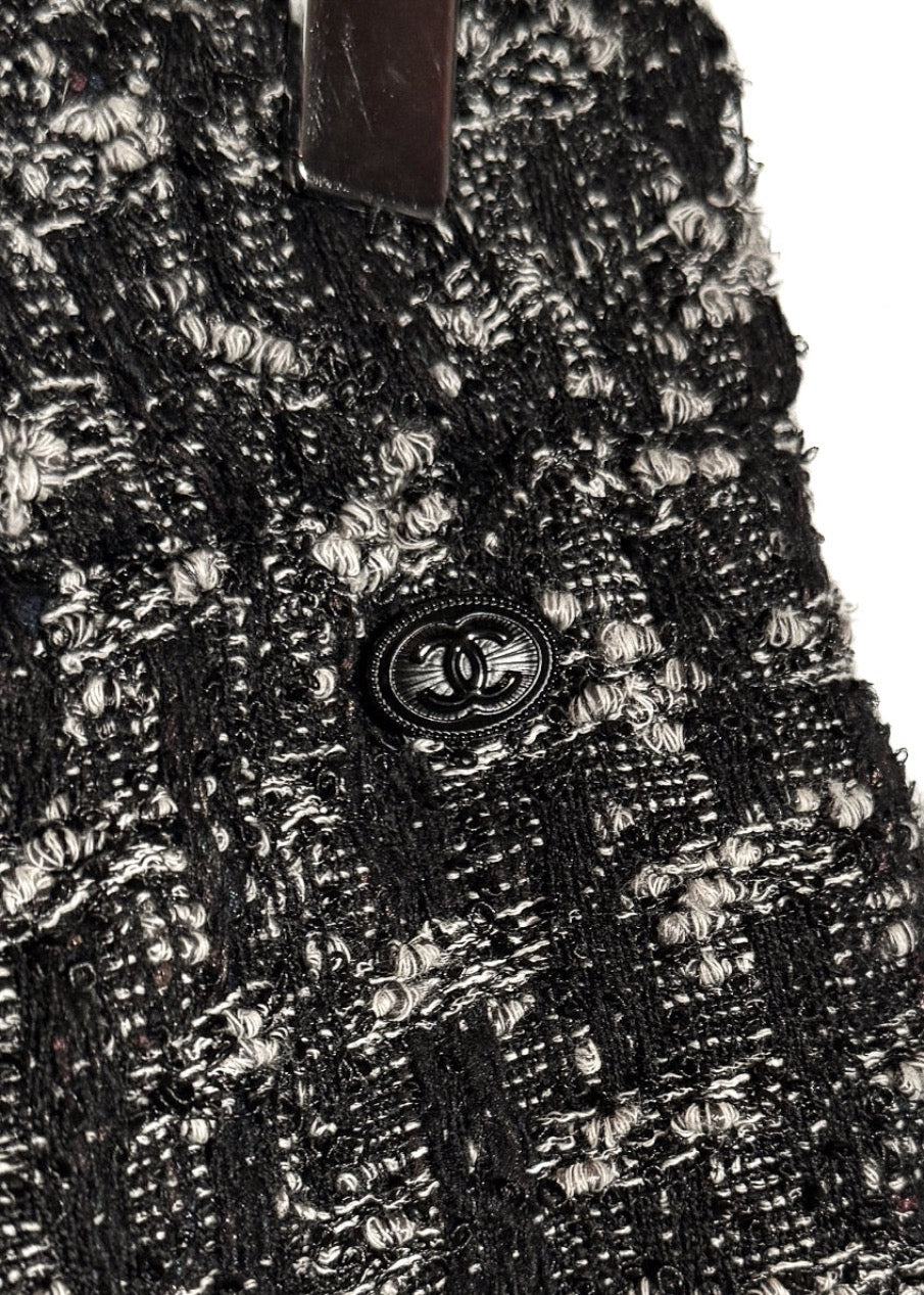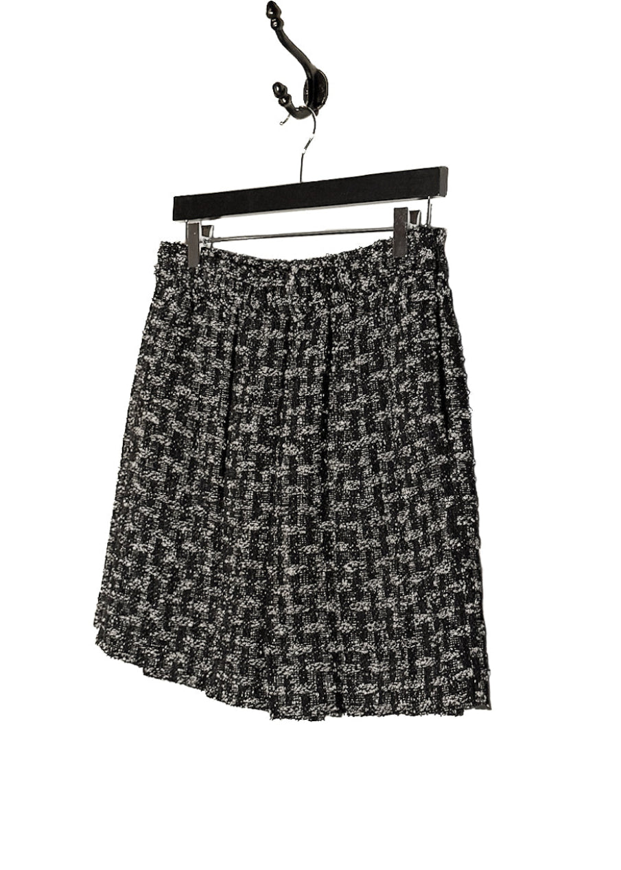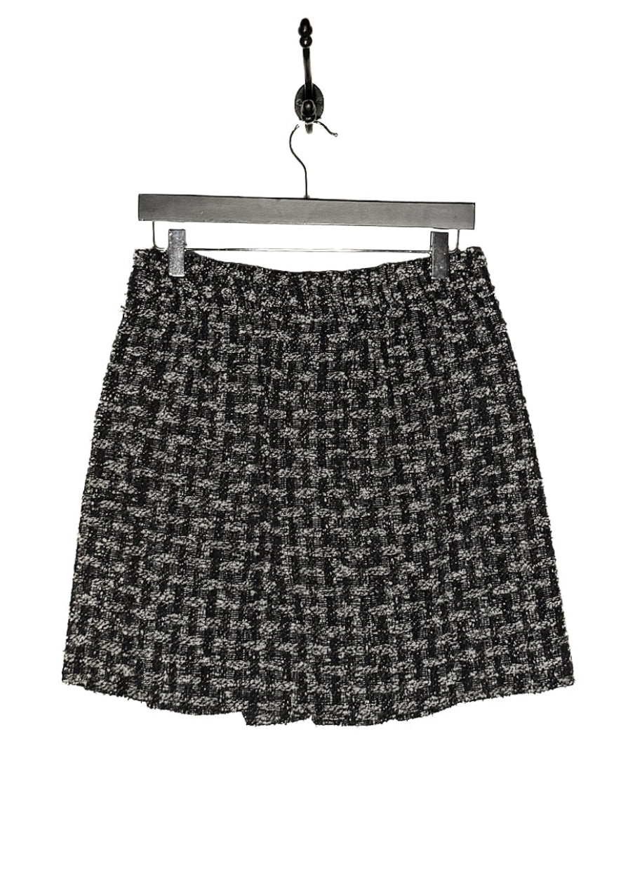 De la collection Pré-Automne 2013, une capsule saisonnière proposée entre les collections principales. Tweed texturé noir et blanc à motif carreaux intégral, rehaussé de fils multicolores discrets tissés dans l’ensemble. Présente des plis, une taille élastiquée et une fermeture zippée sur le côté. Bouton noir griffé CC à l’avant gauche avec poches prises dans la couture. La poche droite n’a pas été ouverte. Entièrement doublée de soie noire. Faite en Italie.