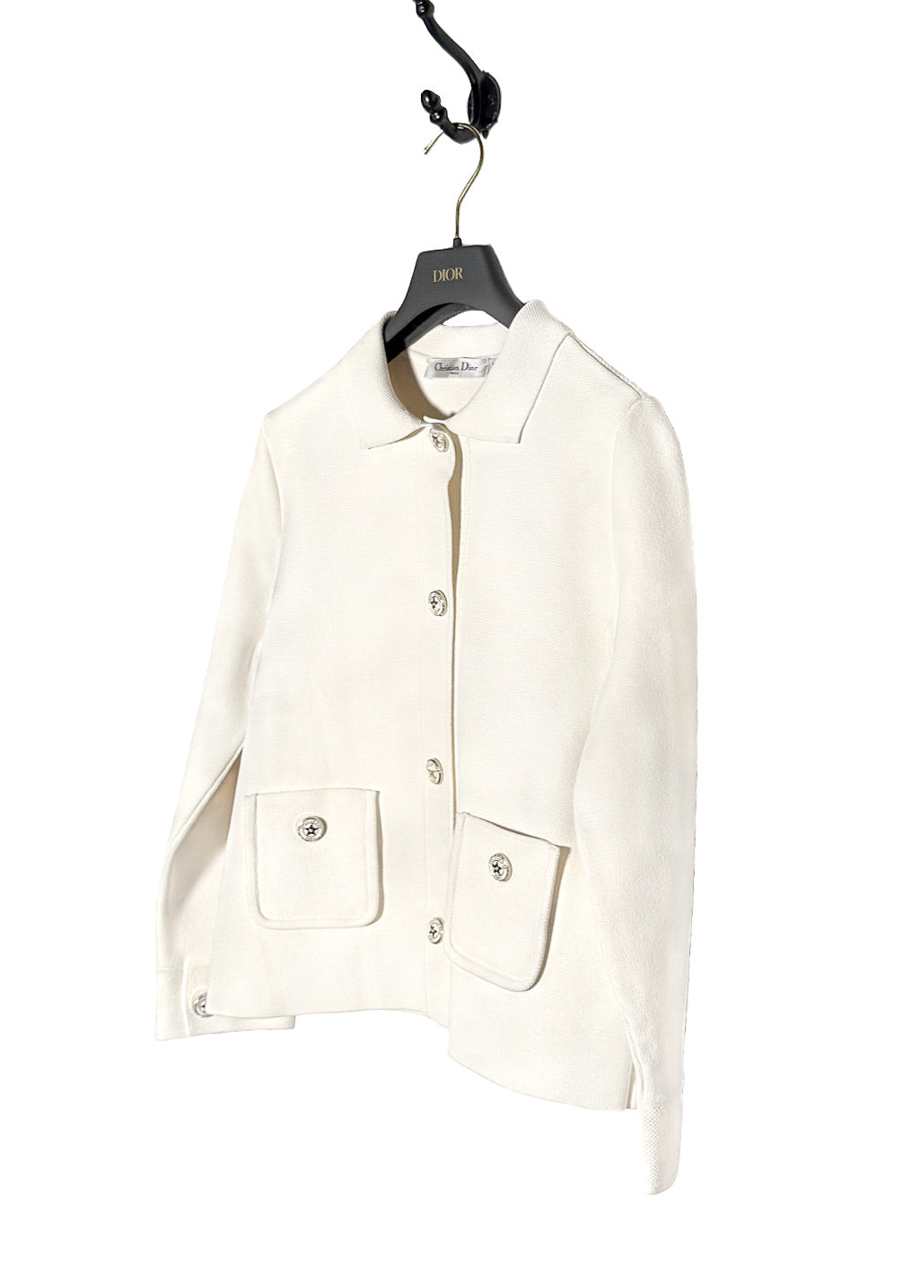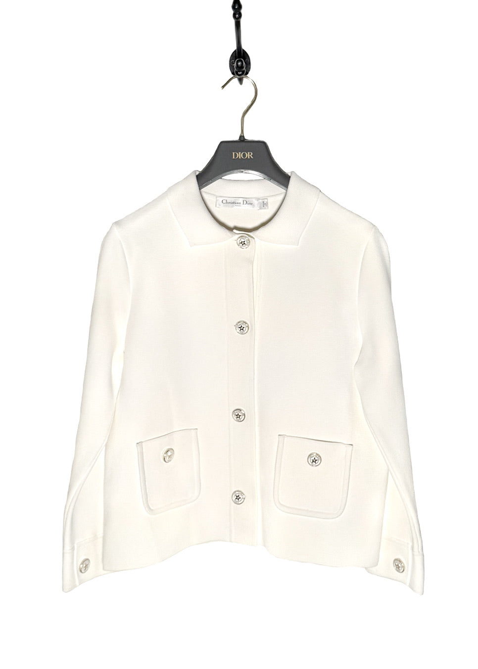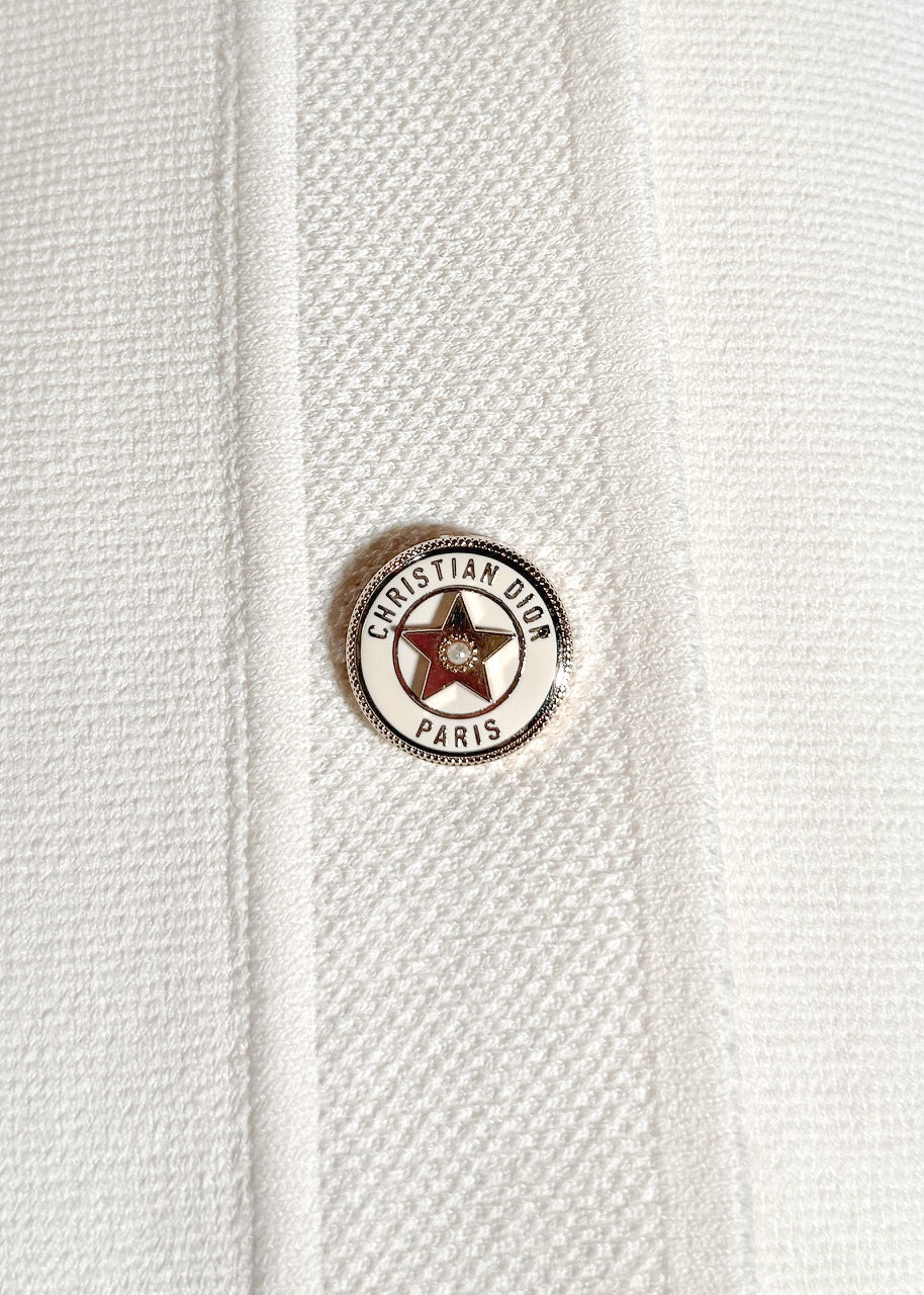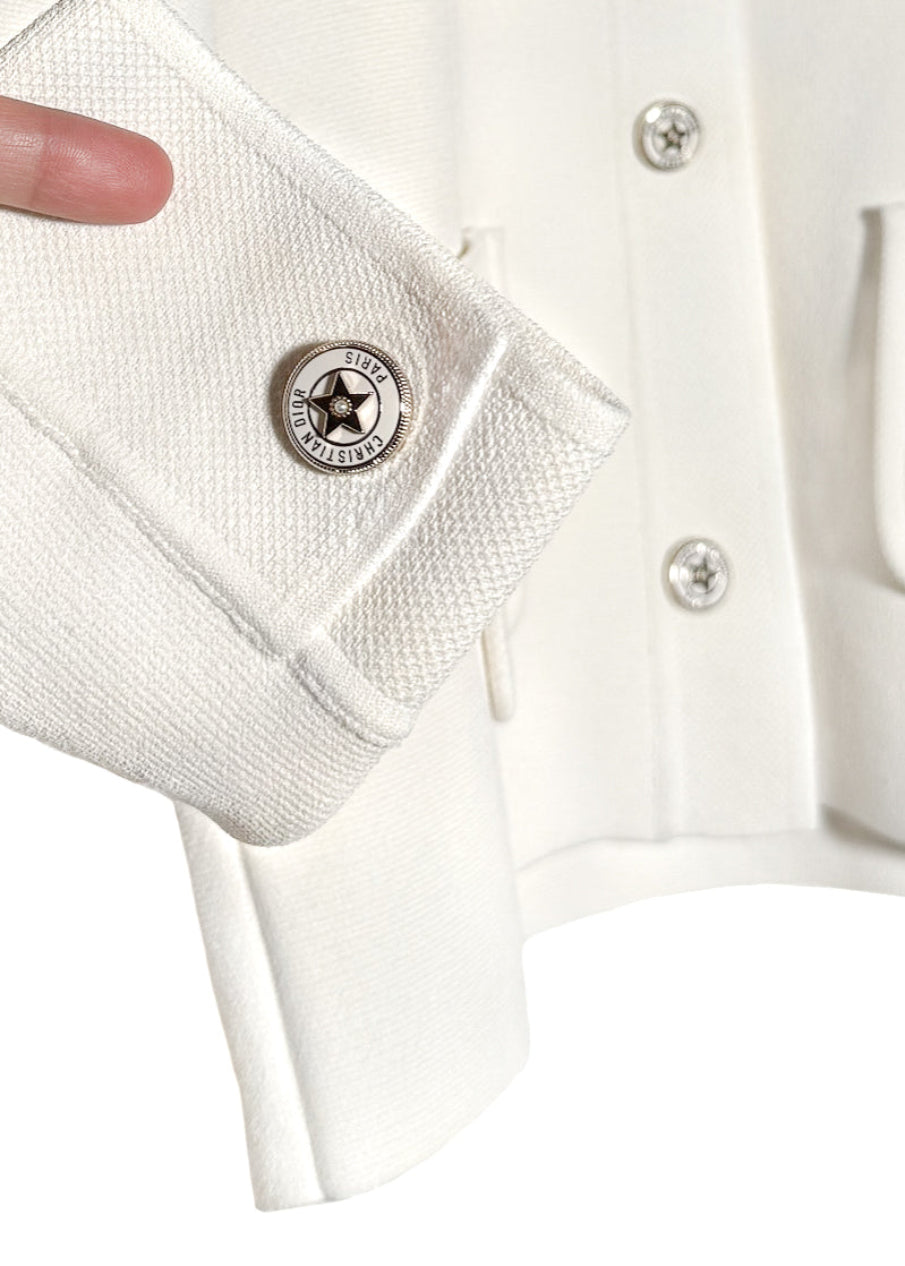 Maille technique texturée. Maille épaisse et compacte. Coupe courte avec col classique. Boutons en émail blanc ornés d'une étoile dorée avec perle et du logo Christian Dior Paris. Fermeture boutonnée sur le devant. Deux poches plaquées boutonnées sur le devant. Manches longues avec poignets boutonnés. Fabriqué en Italie.