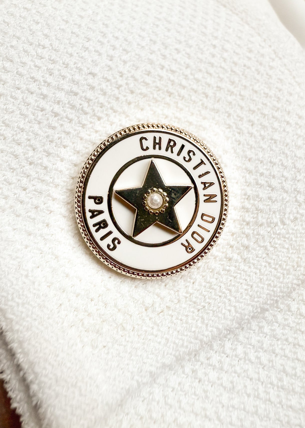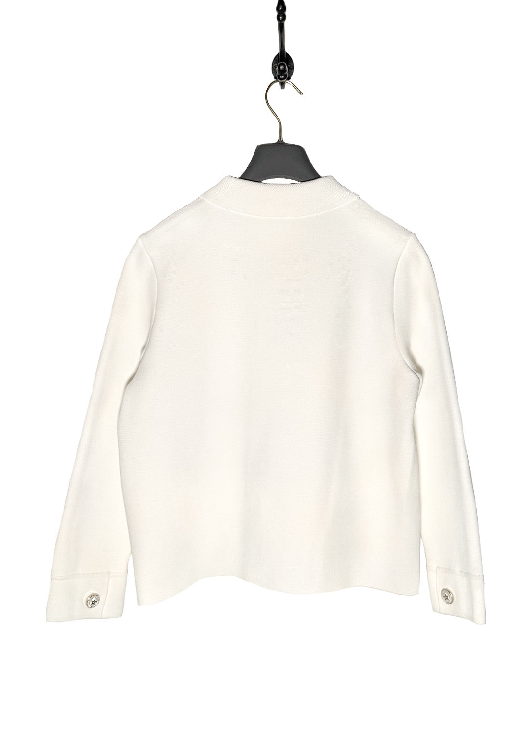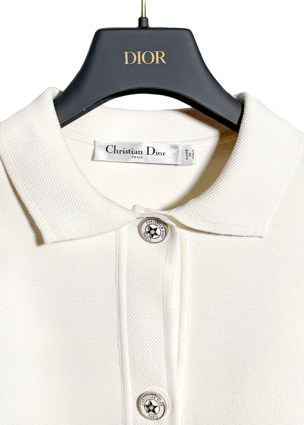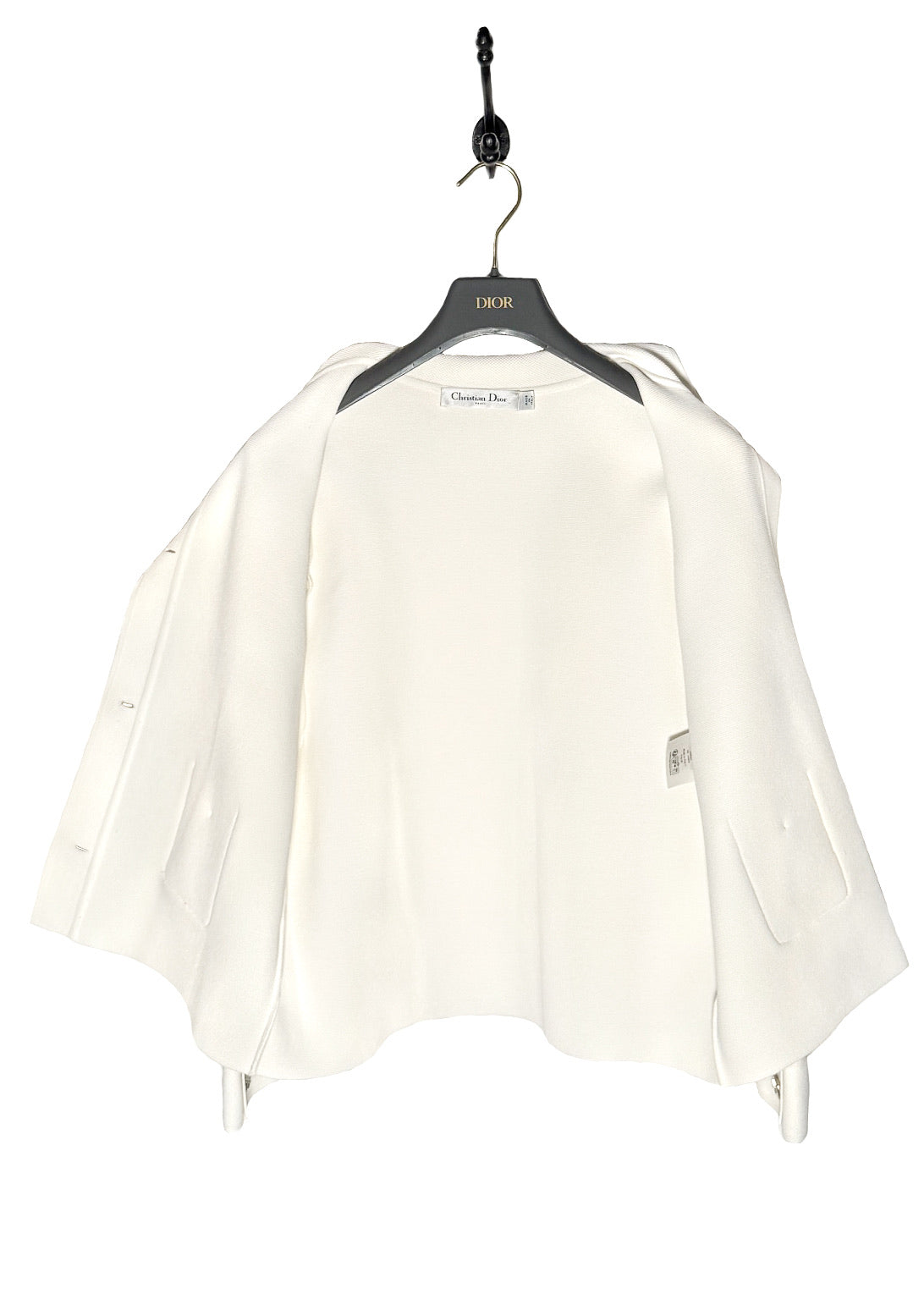 Maille technique texturée. Maille épaisse et compacte. Coupe courte avec col classique. Boutons en émail blanc ornés d'une étoile dorée avec perle et du logo Christian Dior Paris. Fermeture boutonnée sur le devant. Deux poches plaquées boutonnées sur le devant. Manches longues avec poignets boutonnés. Fabriqué en Italie.