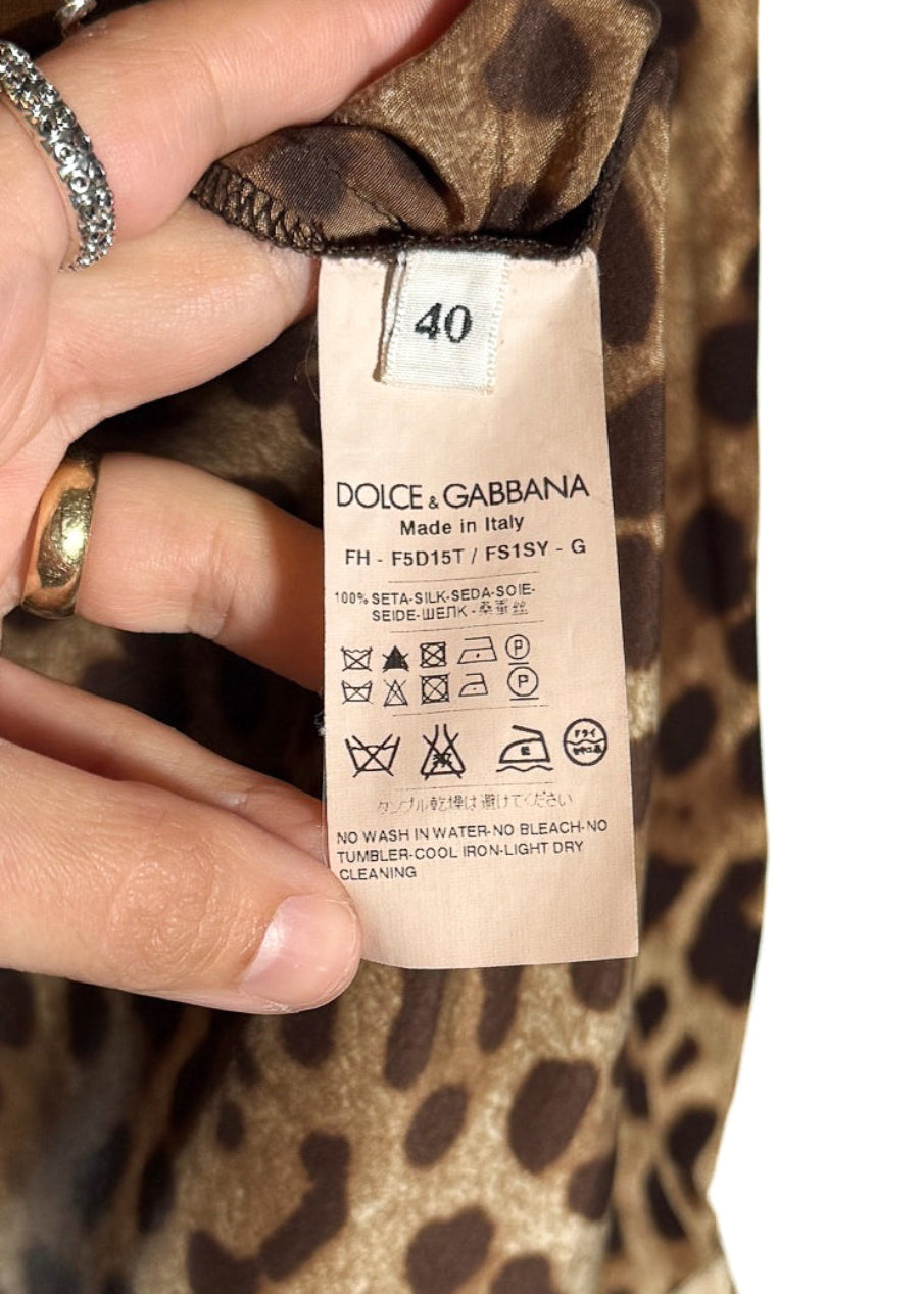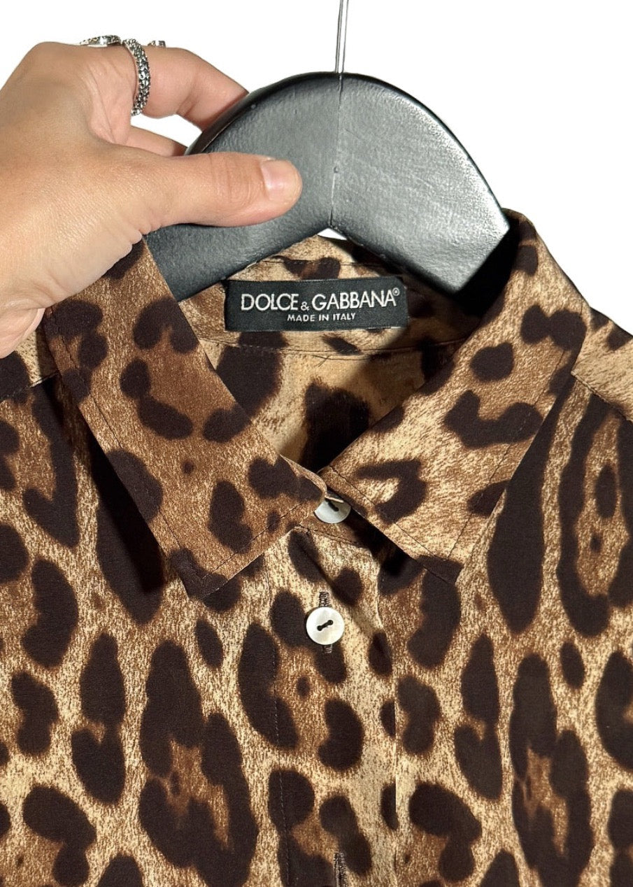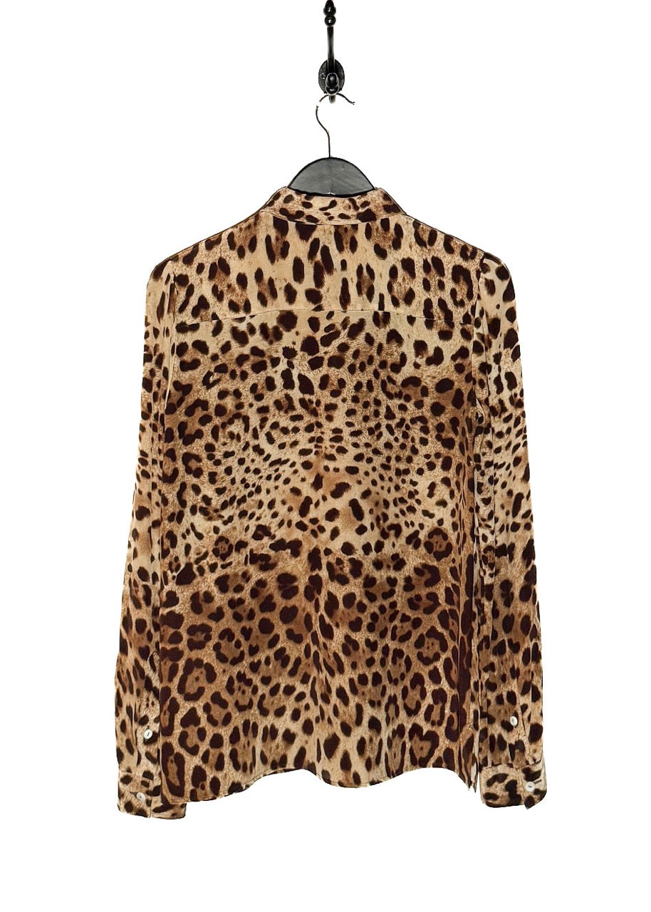 Chemisier en soie à manches longues, entièrement orné d'un imprimé léopard. Col classique en pointe, fermeture boutonnée sur le devant avec boutons en nacre gravés et poignets boutonnés. Fabriqué en Italie.