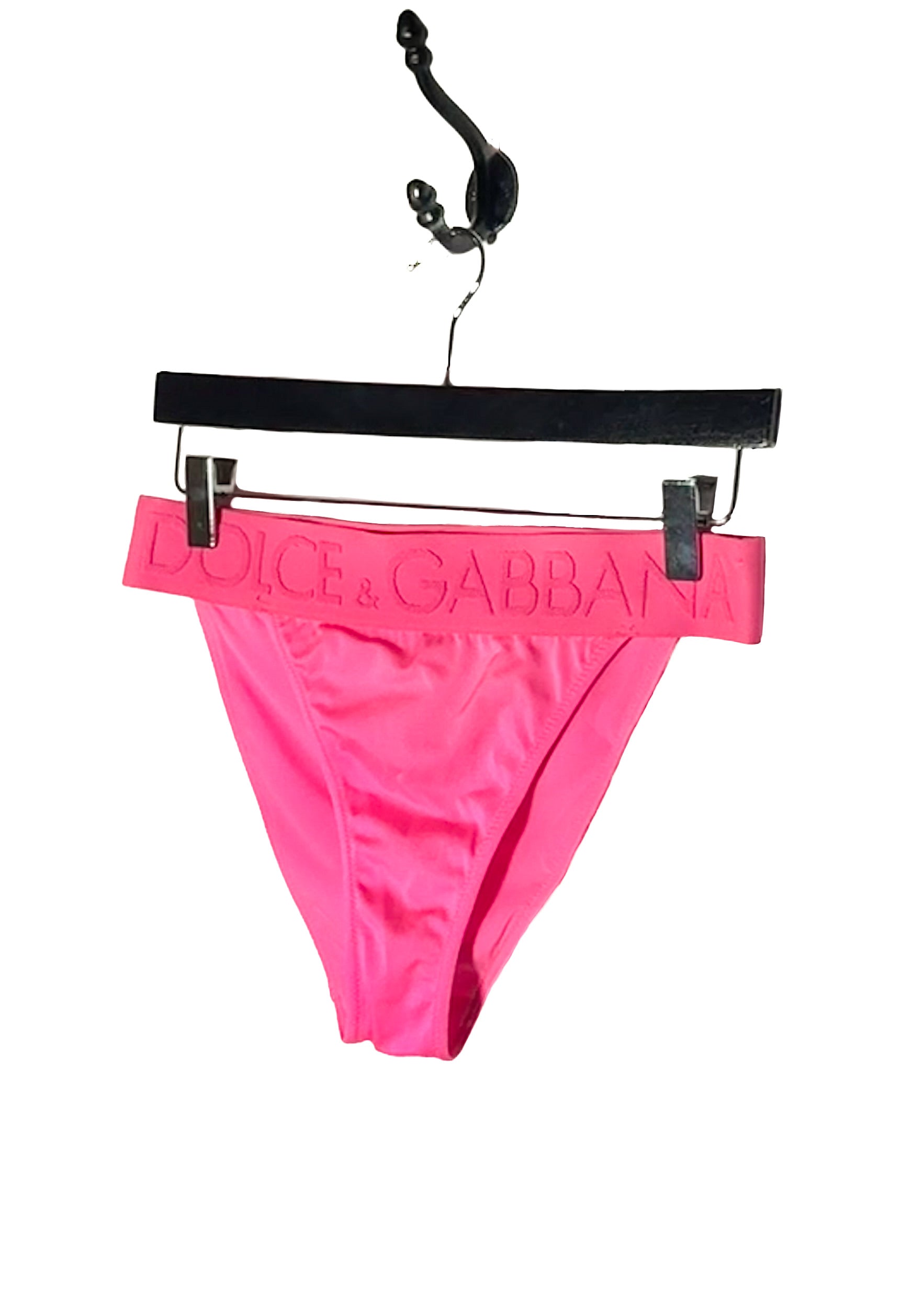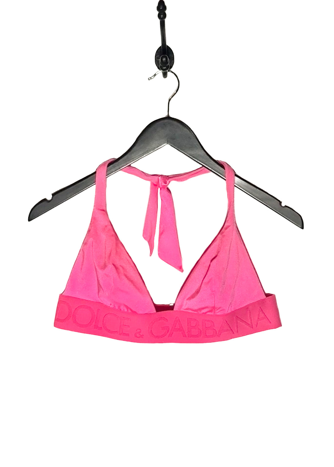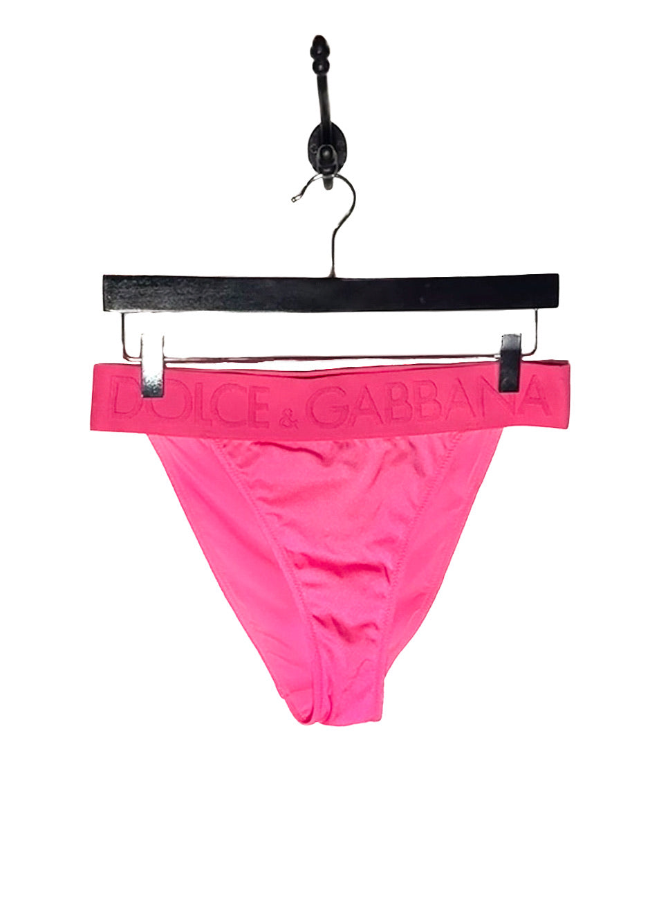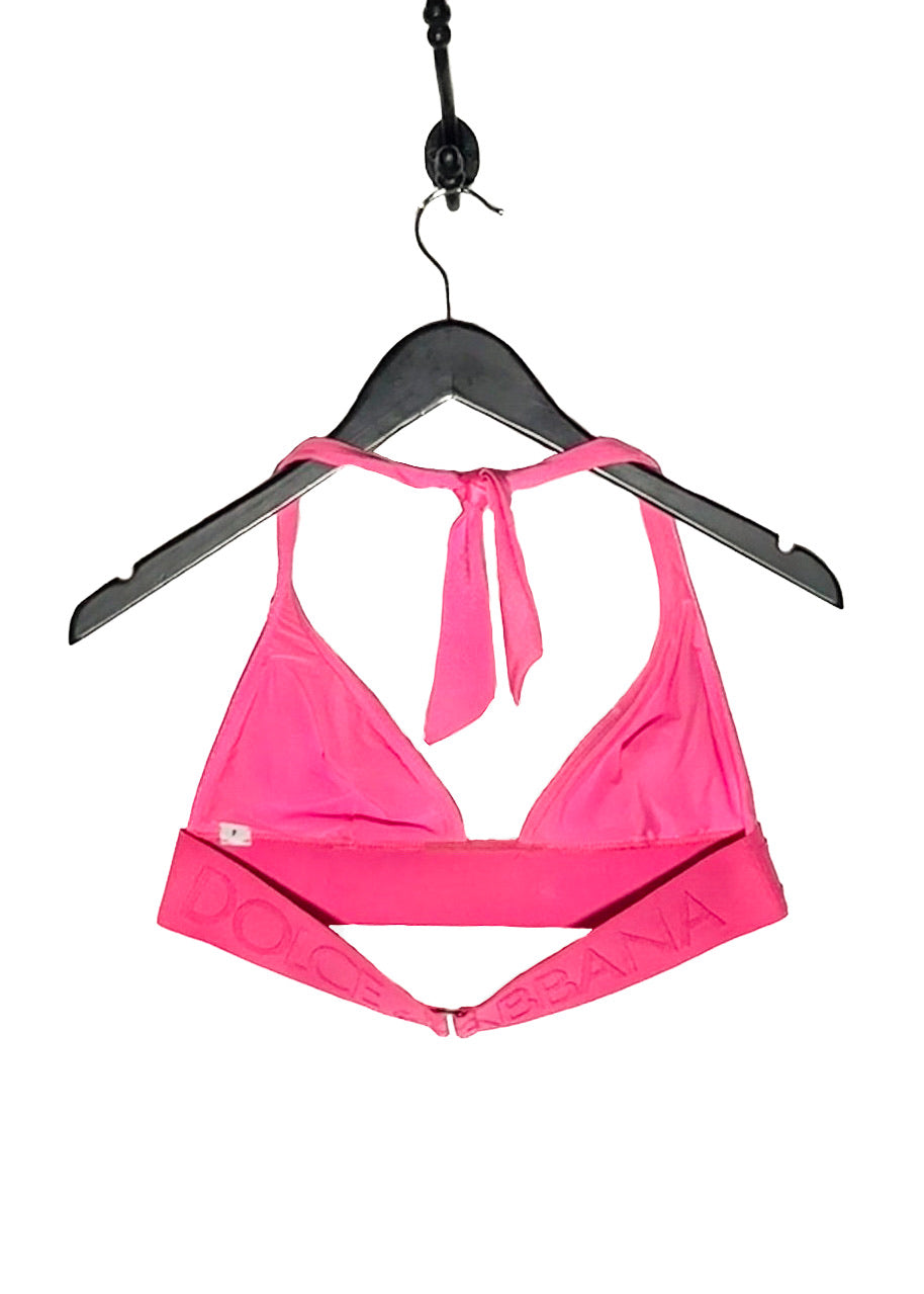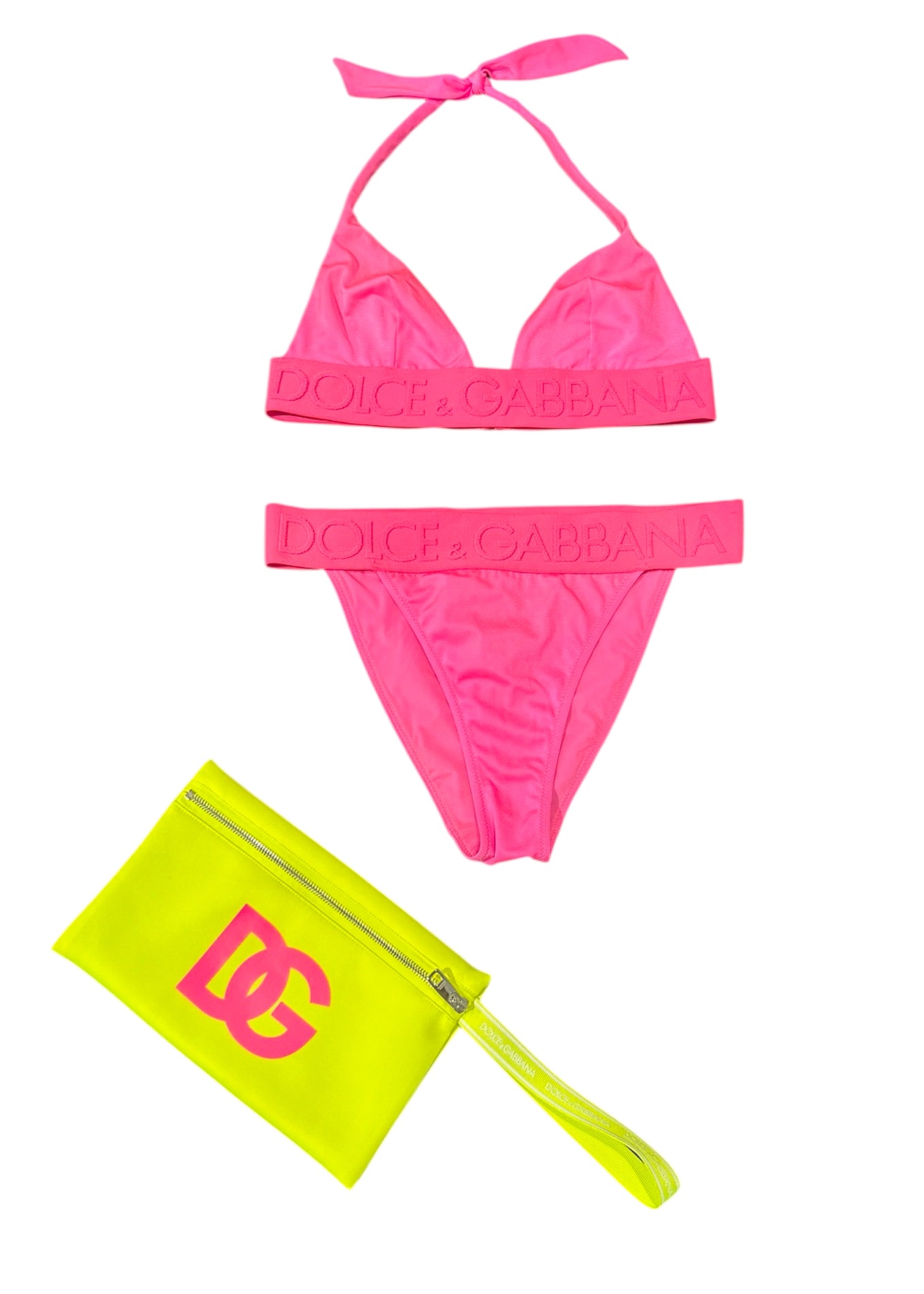Haut de bikini triangle rose avec large bande élastique ton sur ton ornée du logo jacquard Dolce & Gabbana rose. Bretelles réglables à nouer autour du cou. Fermeture au dos par fermoir Dolce & Gabbana argenté gravé. Bas de bikini assorti avec la même large ceinture élastique. Livré avec une pochette zippée Dolce & Gabbana jaune fluo ornée du logo DG rose vif contrastant et d'une tirette argentée gravée du logo. Fabriqué en Italie.