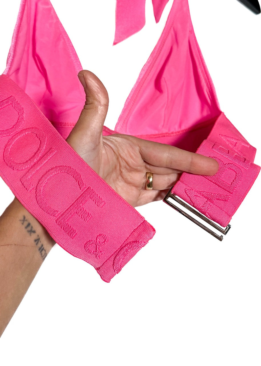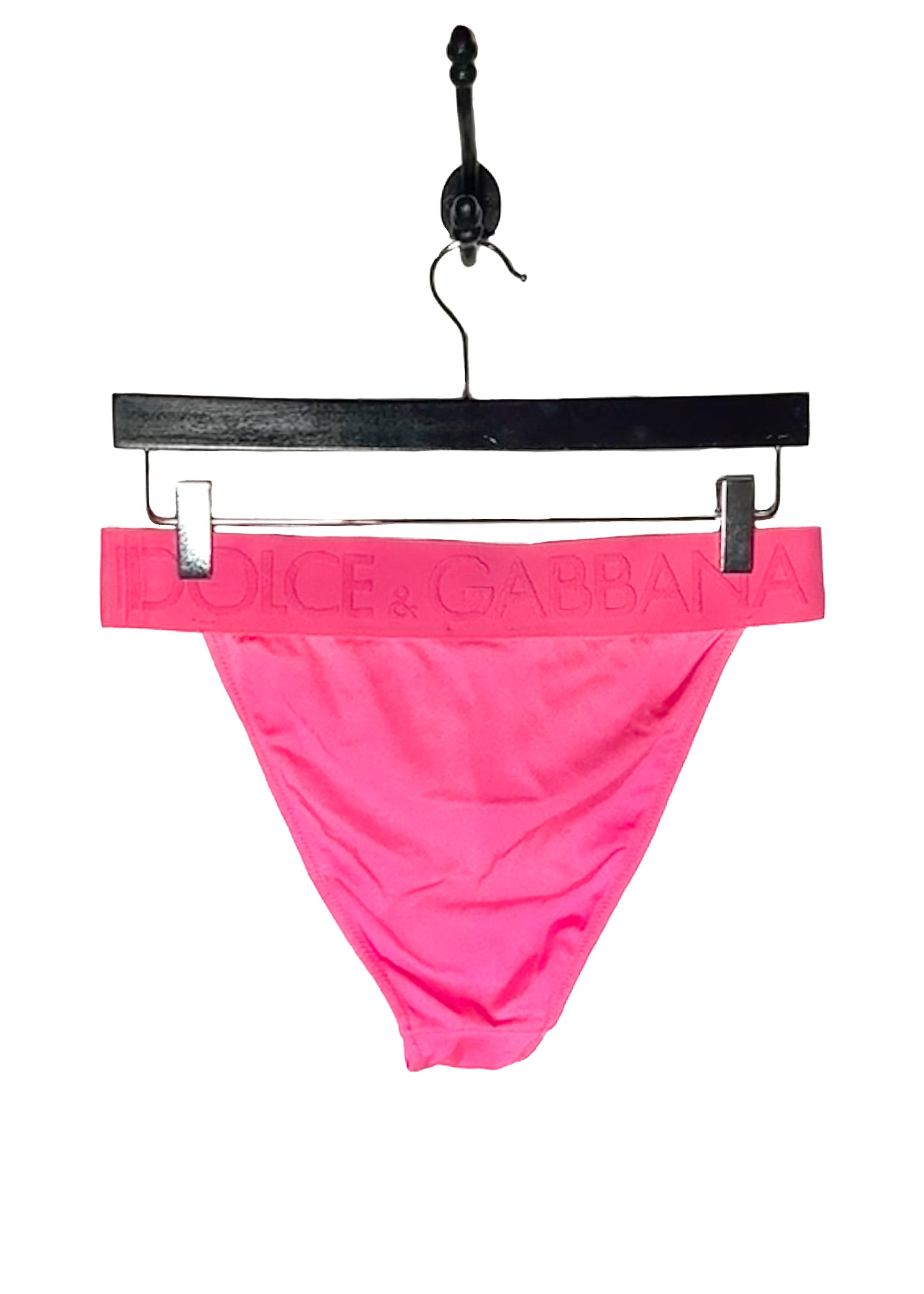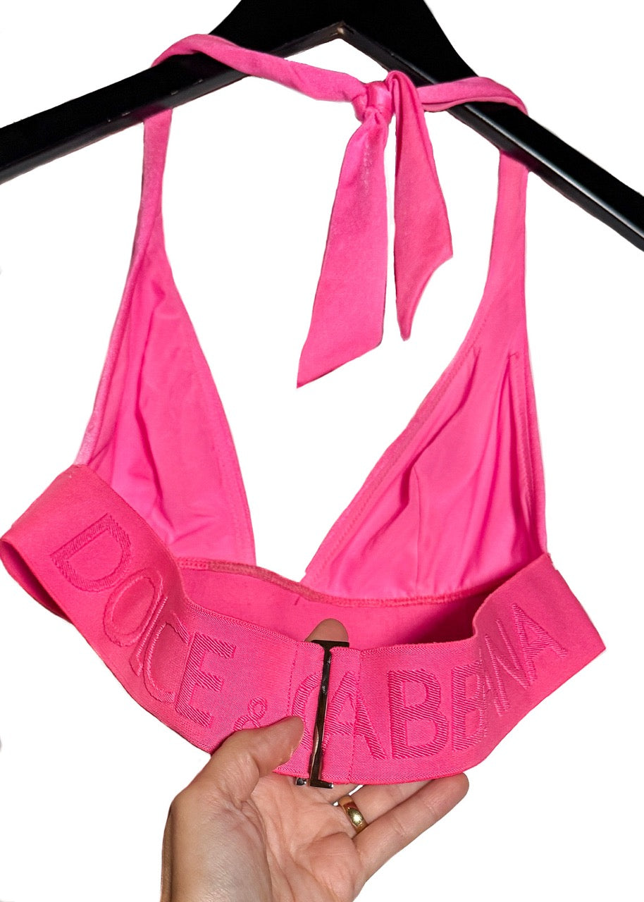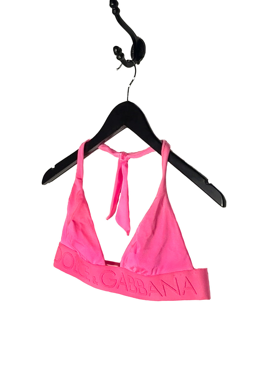 Haut de bikini triangle rose avec large bande élastique ton sur ton ornée du logo jacquard Dolce & Gabbana rose. Bretelles réglables à nouer autour du cou. Fermeture au dos par fermoir Dolce & Gabbana argenté gravé. Bas de bikini assorti avec la même large ceinture élastique. Livré avec une pochette zippée Dolce & Gabbana jaune fluo ornée du logo DG rose vif contrastant et d'une tirette argentée gravée du logo. Fabriqué en Italie.