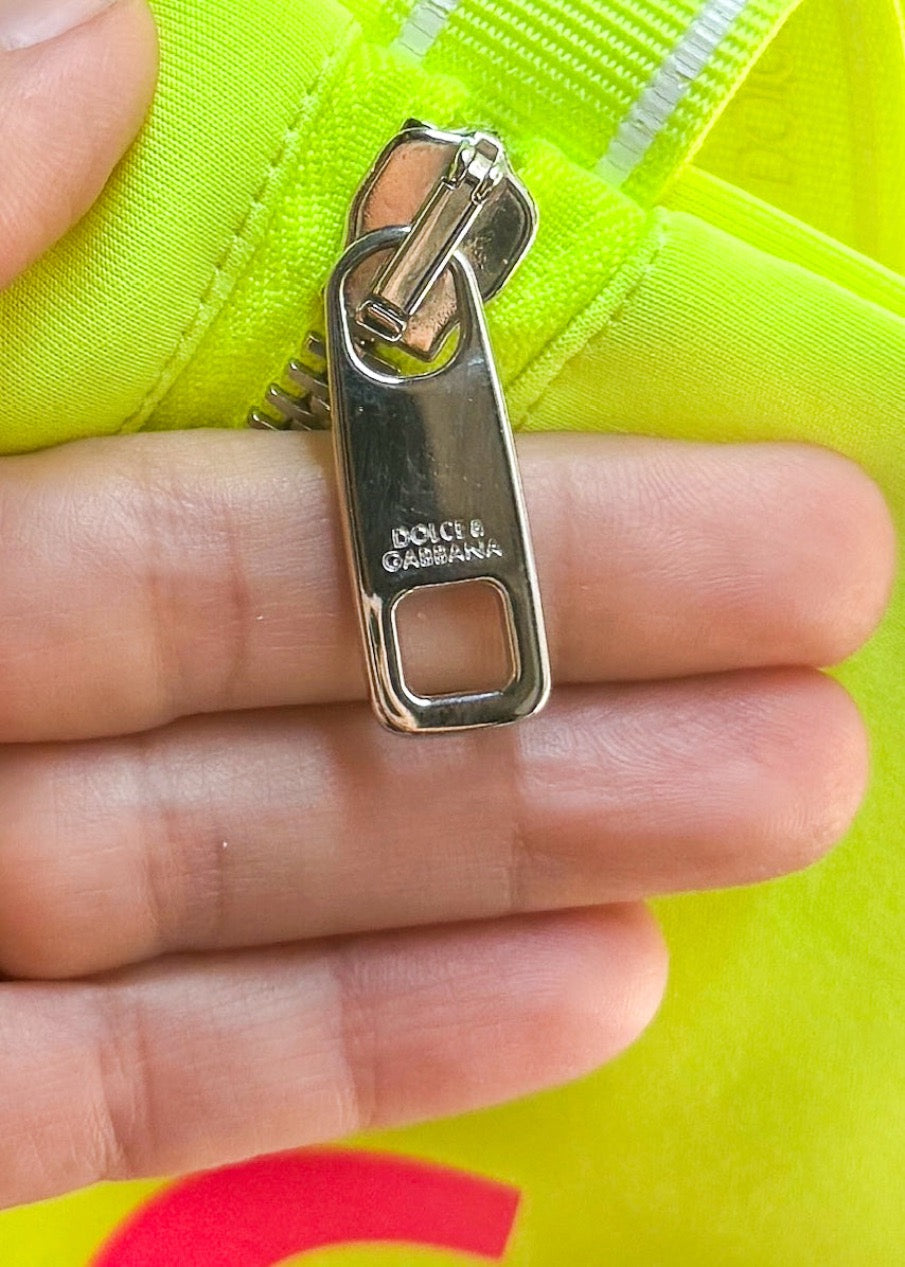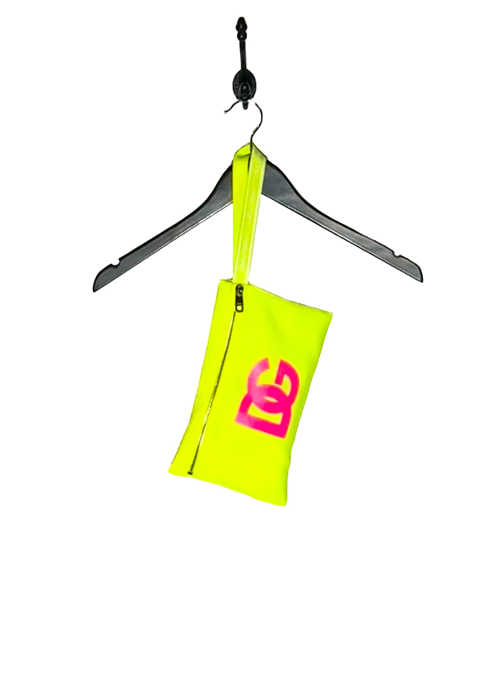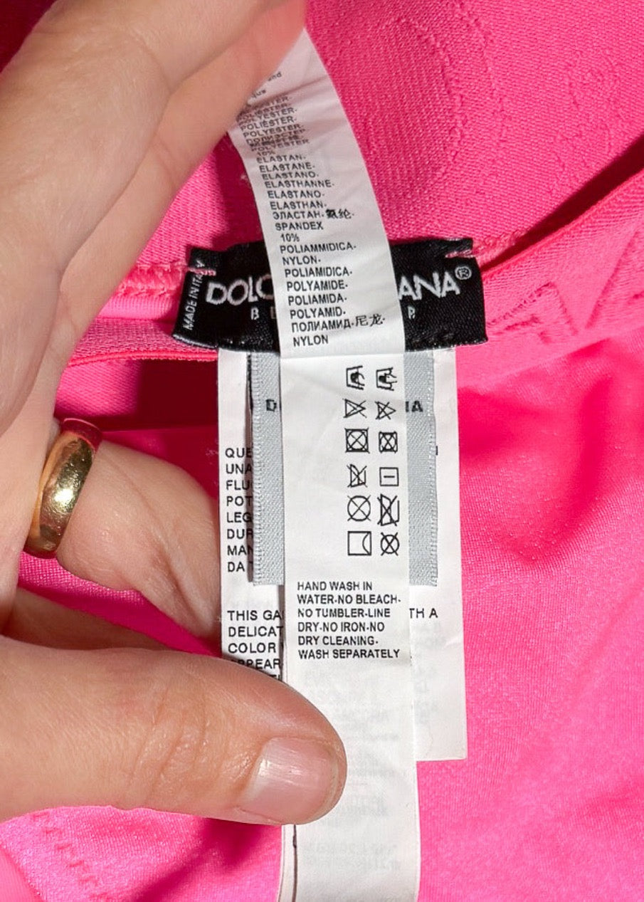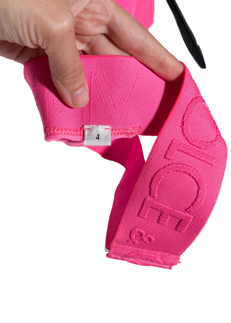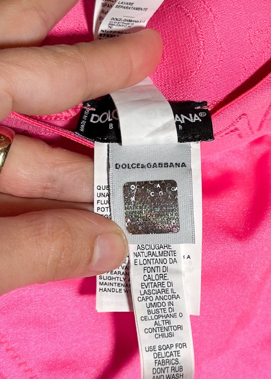 Haut de bikini triangle rose avec large bande élastique ton sur ton ornée du logo jacquard Dolce & Gabbana rose. Bretelles réglables à nouer autour du cou. Fermeture au dos par fermoir Dolce & Gabbana argenté gravé. Bas de bikini assorti avec la même large ceinture élastique. Livré avec une pochette zippée Dolce & Gabbana jaune fluo ornée du logo DG rose vif contrastant et d'une tirette argentée gravée du logo. Fabriqué en Italie.