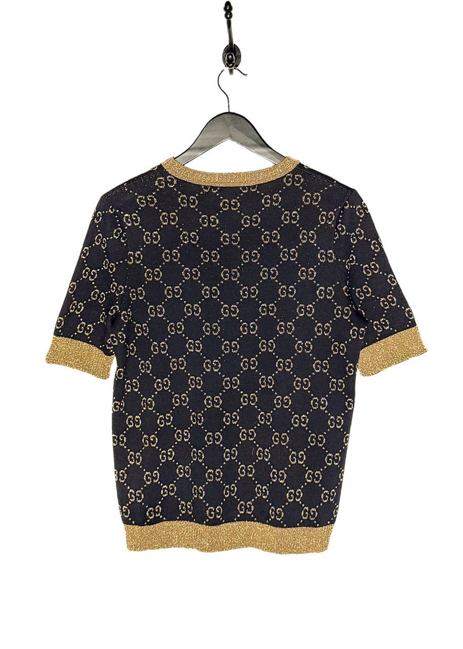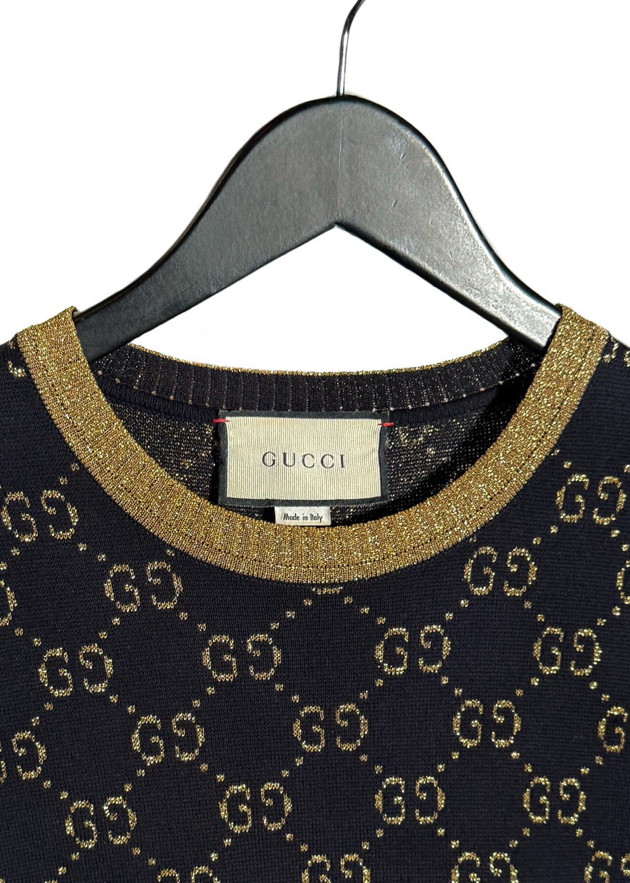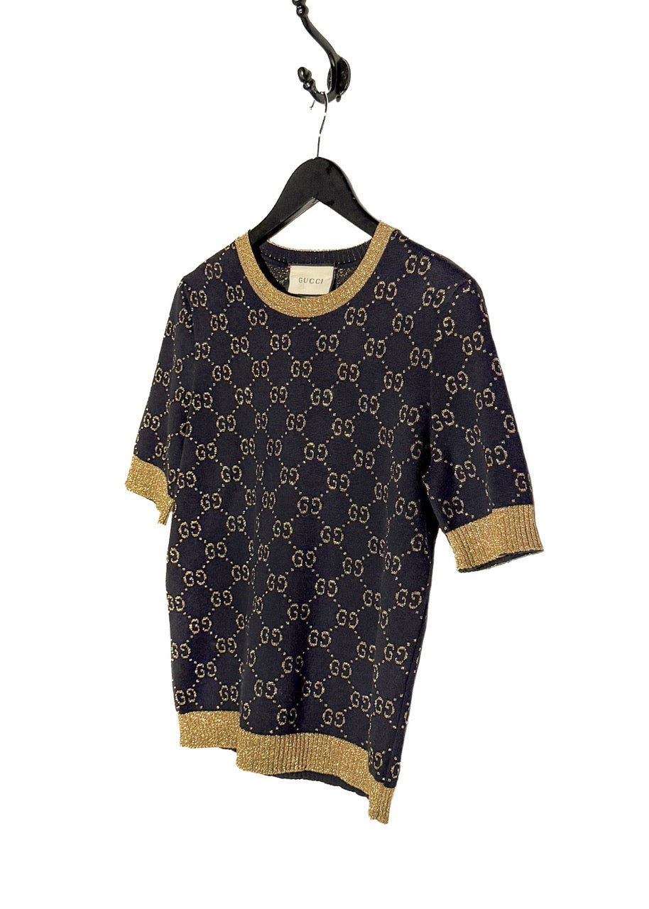 Motif monogramme GG intégral en fil doré métallisé sur fond bleu marine profond. Encolure ras du cou, poignets et ourlet côtelés avec finitions en lamé doré scintillant. Coupe ajustée à manches courtes. Fait en Italie.
