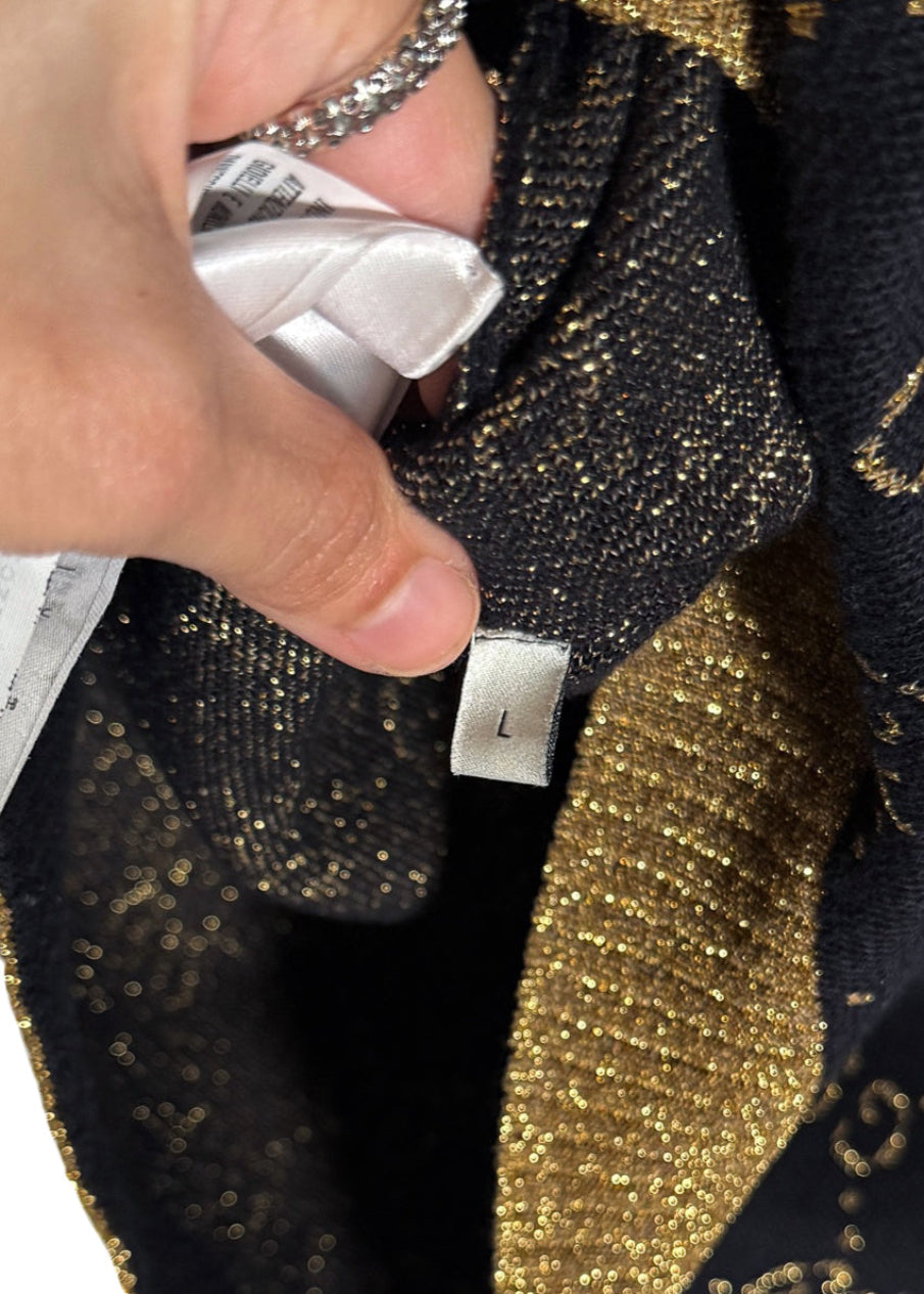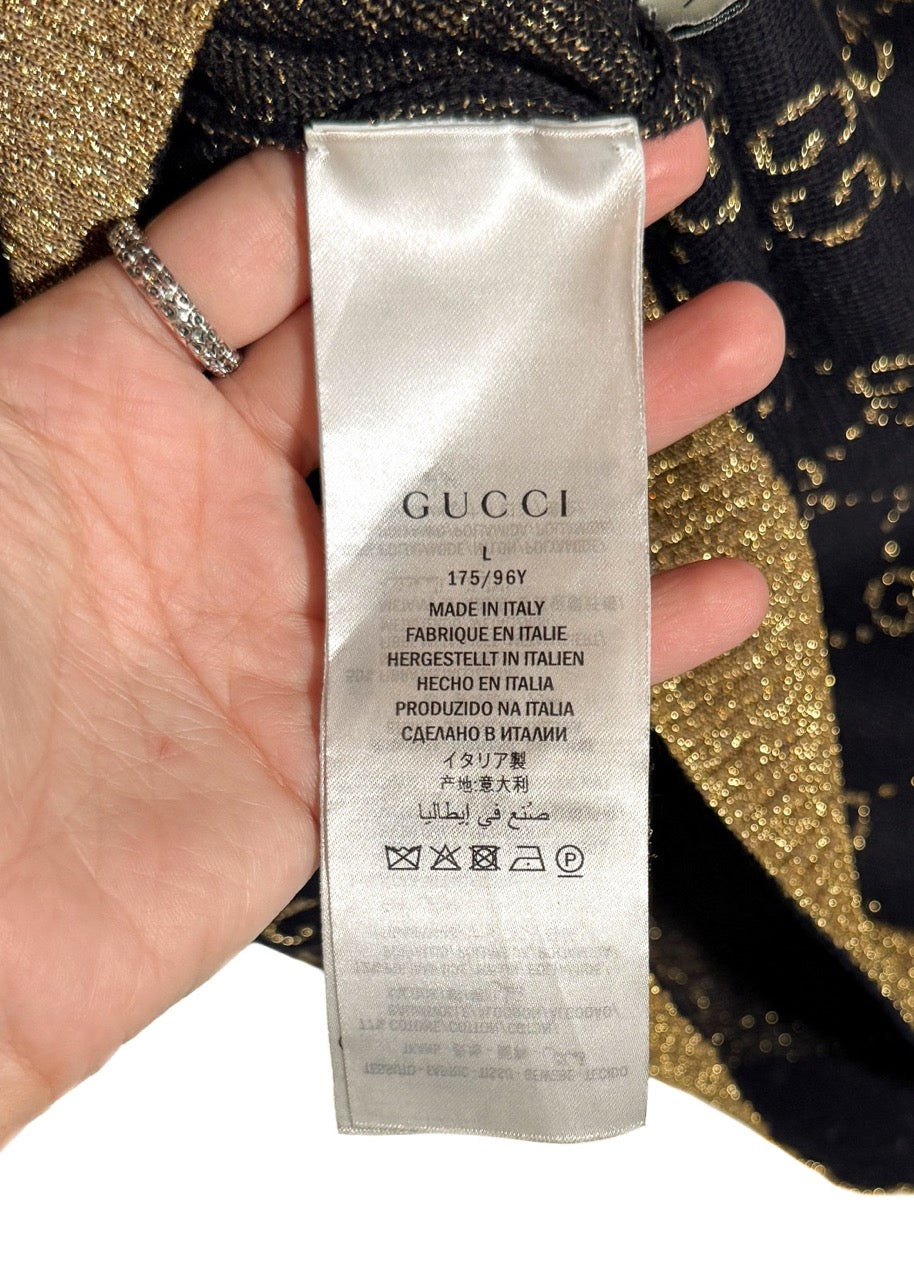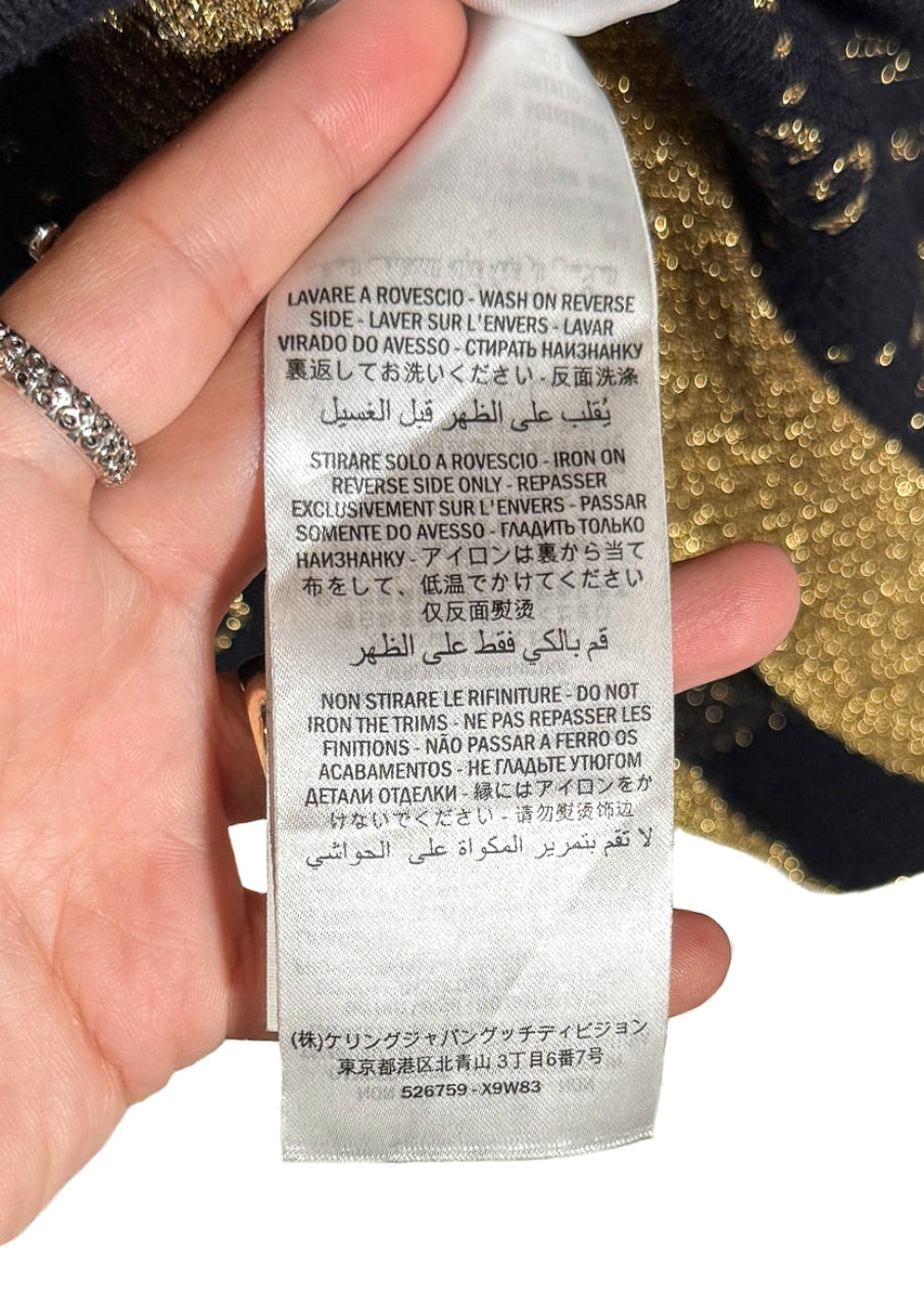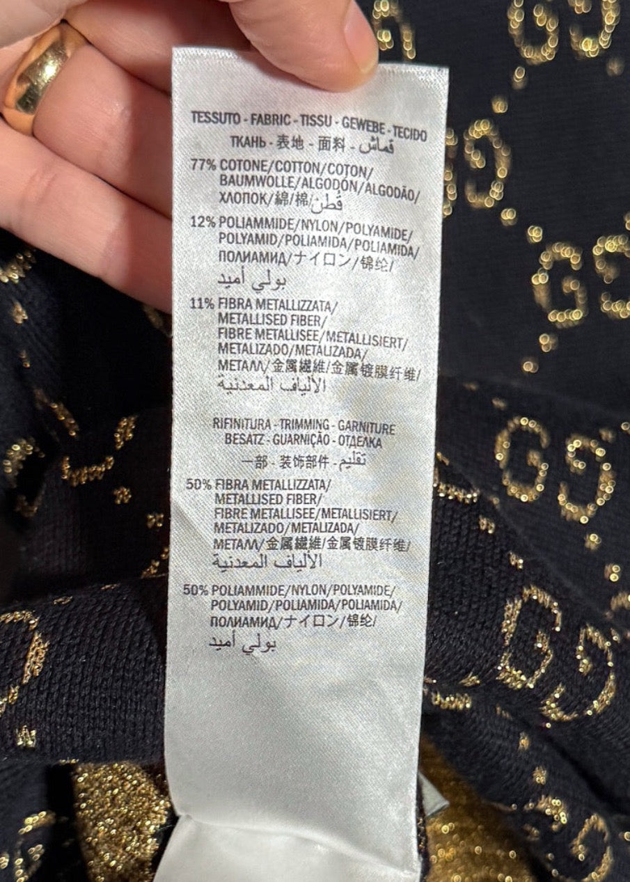 Motif monogramme GG intégral en fil doré métallisé sur fond bleu marine profond. Encolure ras du cou, poignets et ourlet côtelés avec finitions en lamé doré scintillant. Coupe ajustée à manches courtes. Fait en Italie.