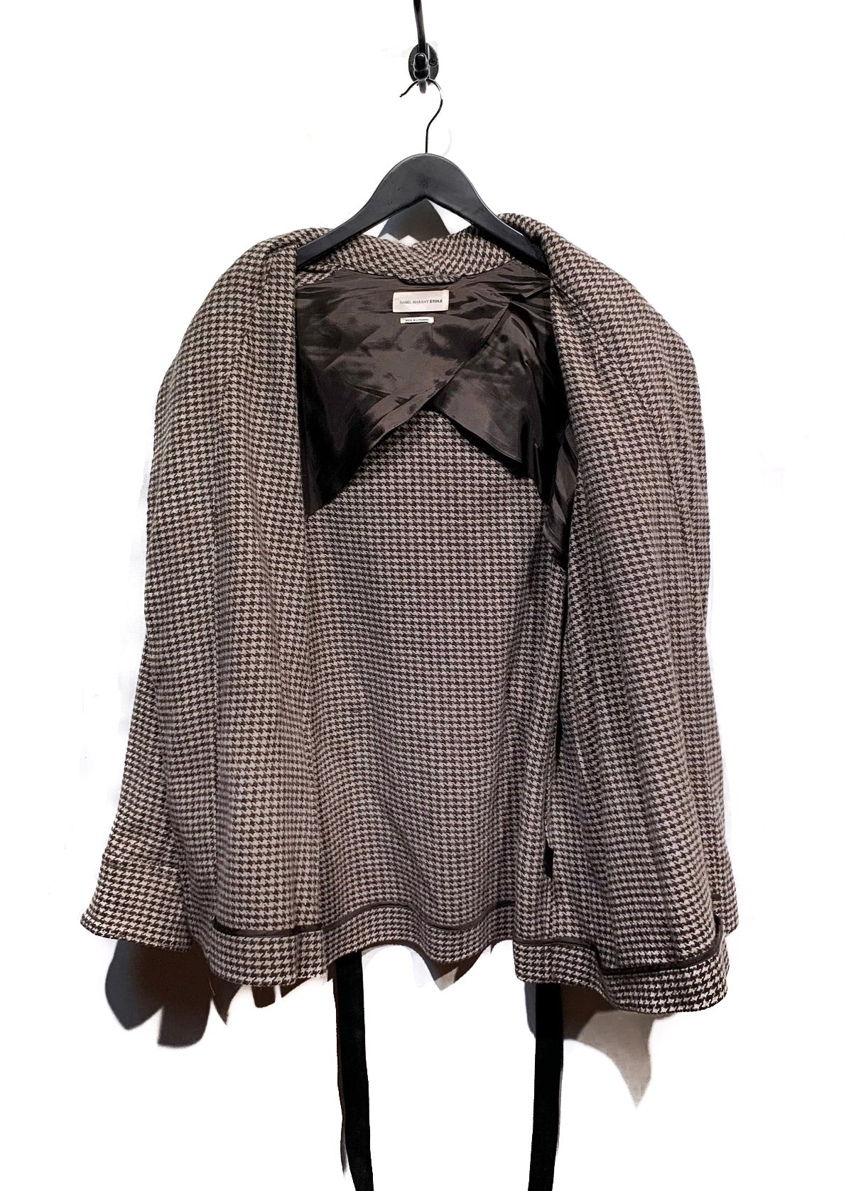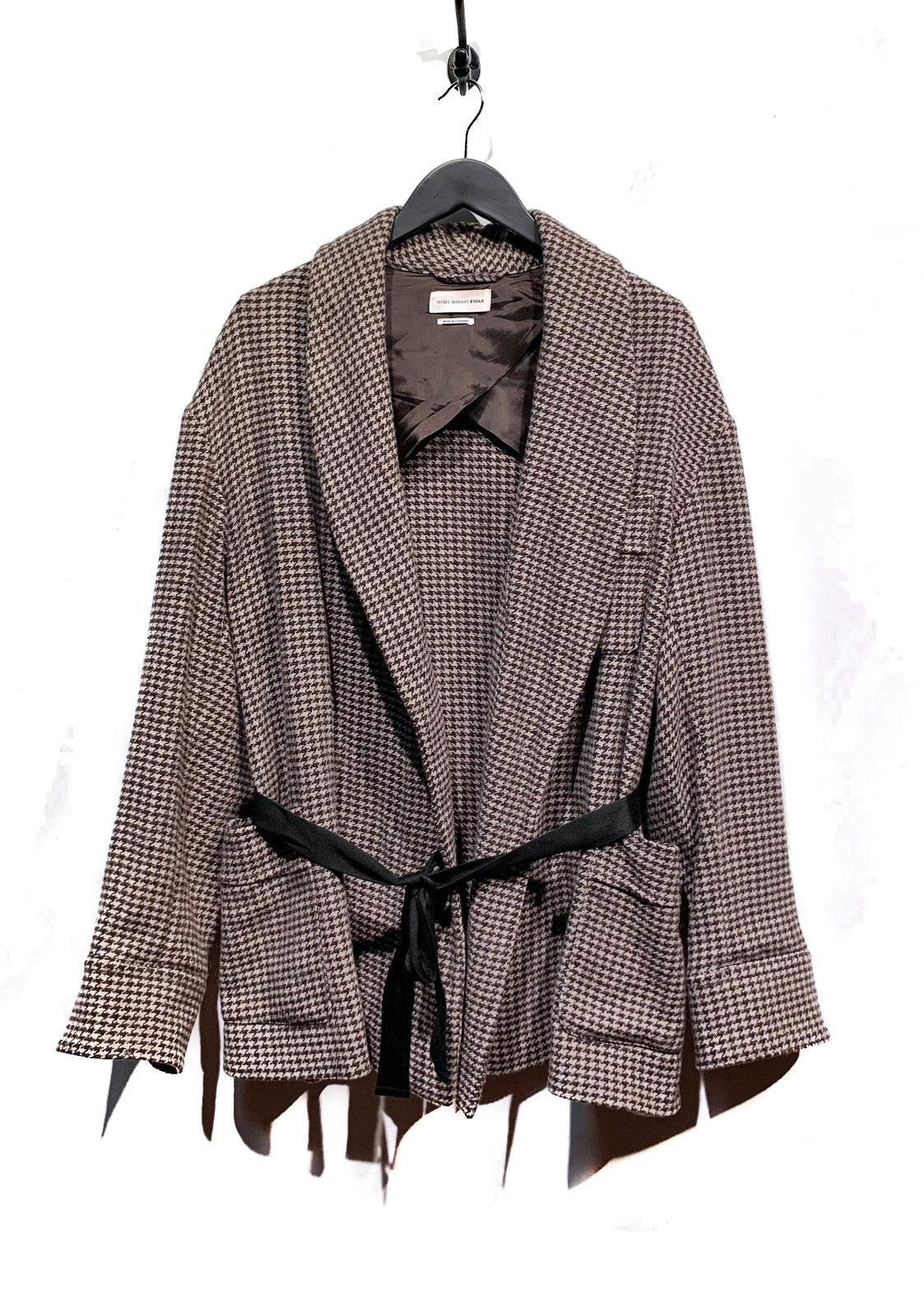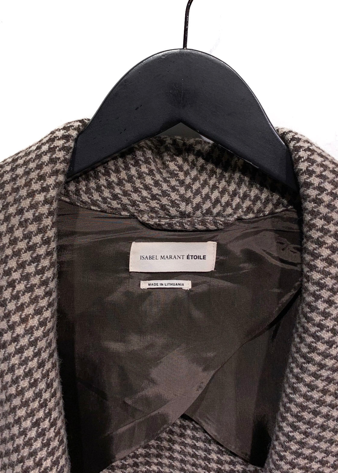 Blazer en laine Isabel Marant Etoile pied-de-poule marron beige. Laine mélangée. Fermeture à ruban noir à nouer. Deux poches plaquées à la taille et une poche poitrine. Manches longues. Poignets fendus. Non doublé. Fabriqué en Lituanie.