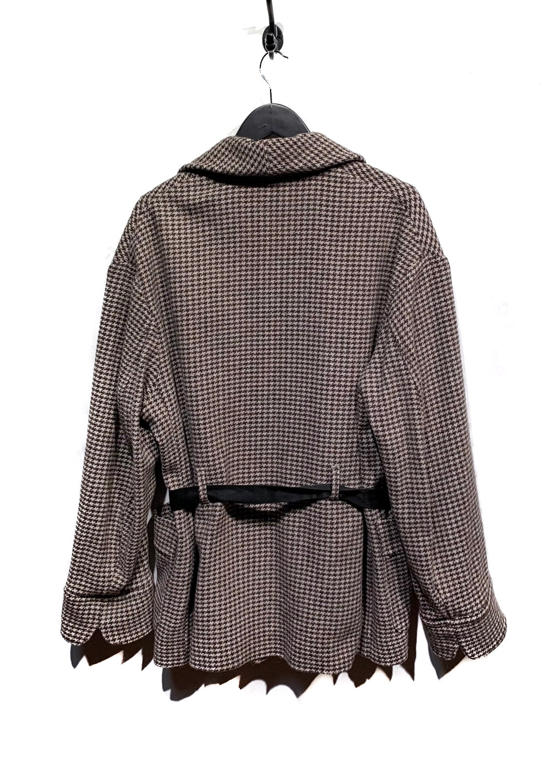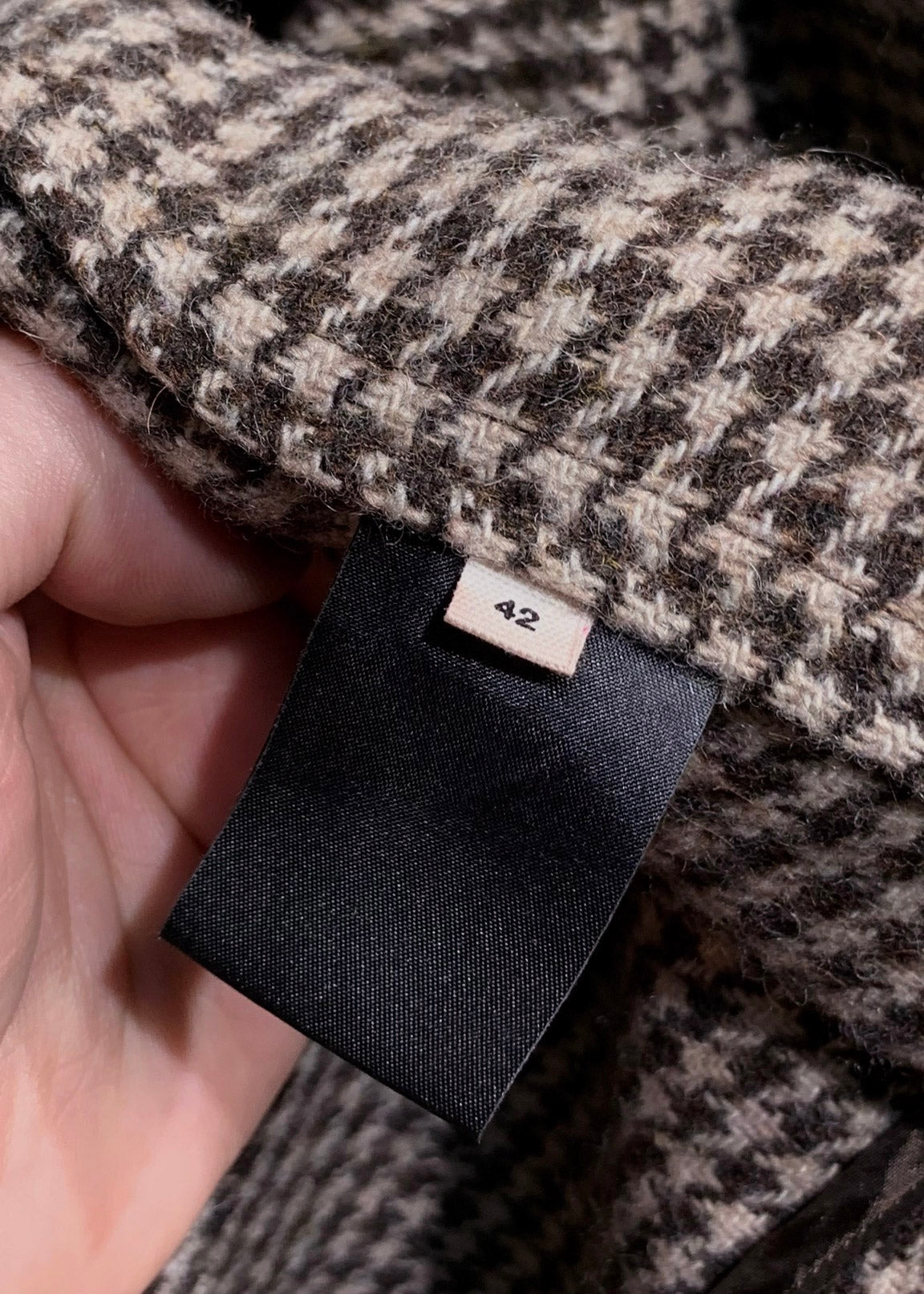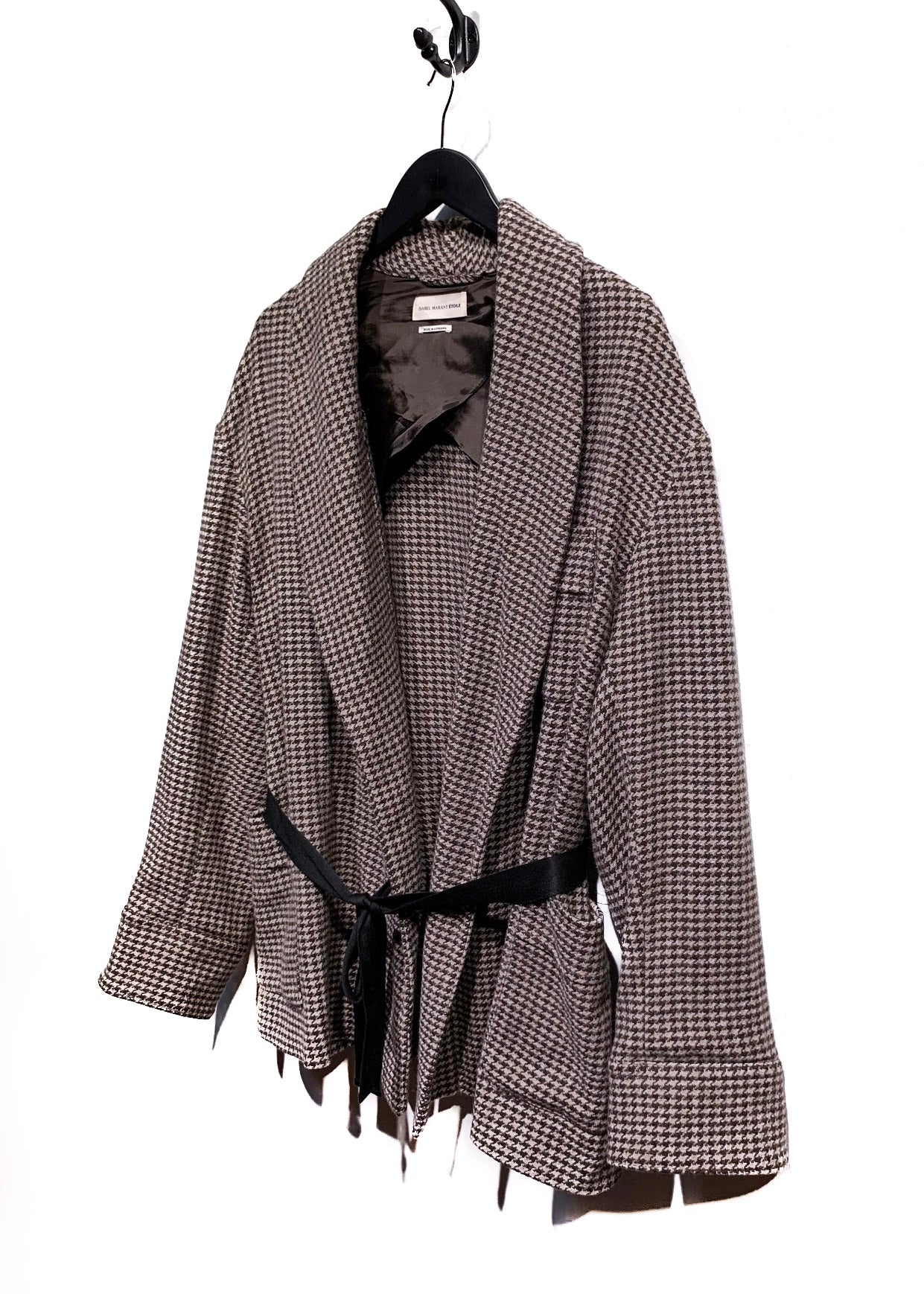 Blazer en laine Isabel Marant Etoile pied-de-poule marron beige. Laine mélangée. Fermeture à ruban noir à nouer. Deux poches plaquées à la taille et une poche poitrine. Manches longues. Poignets fendus. Non doublé. Fabriqué en Lituanie.