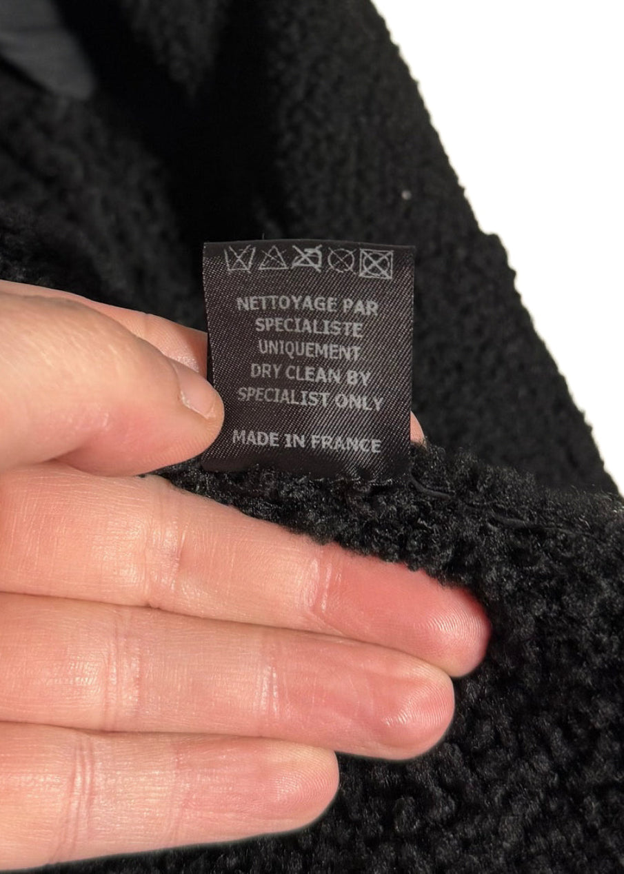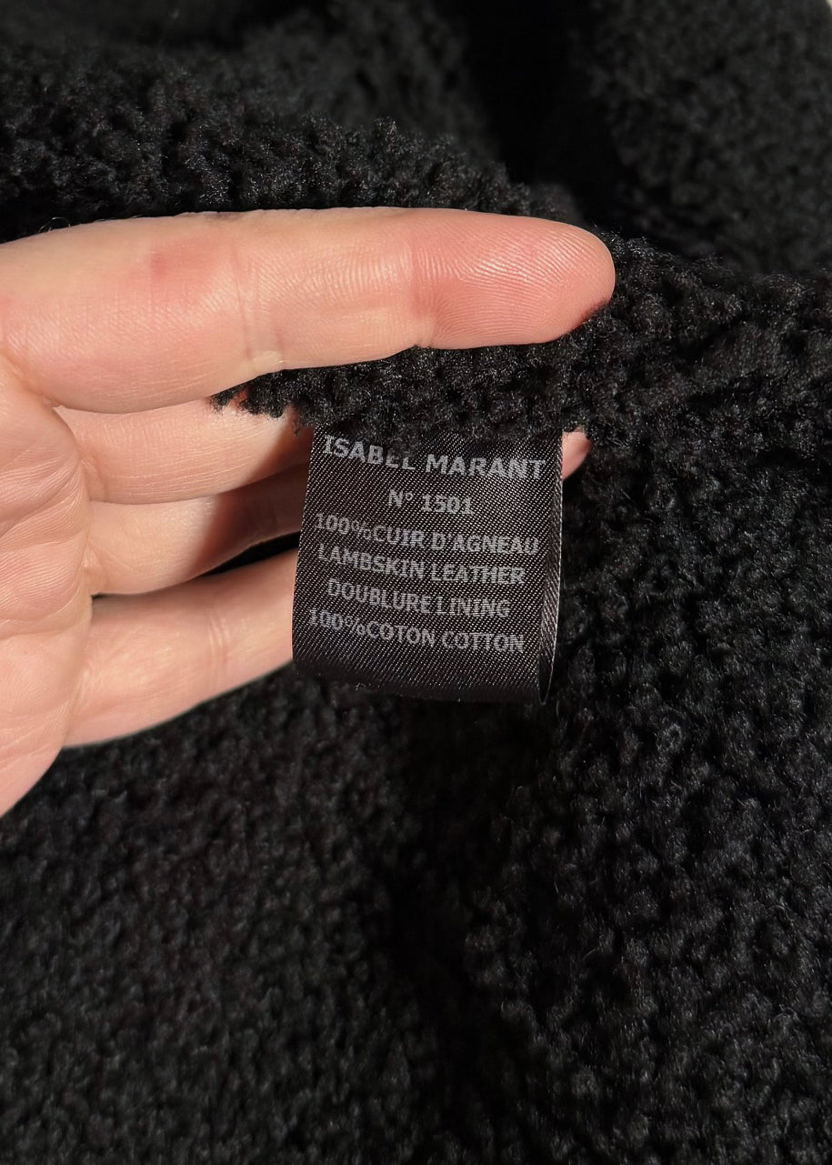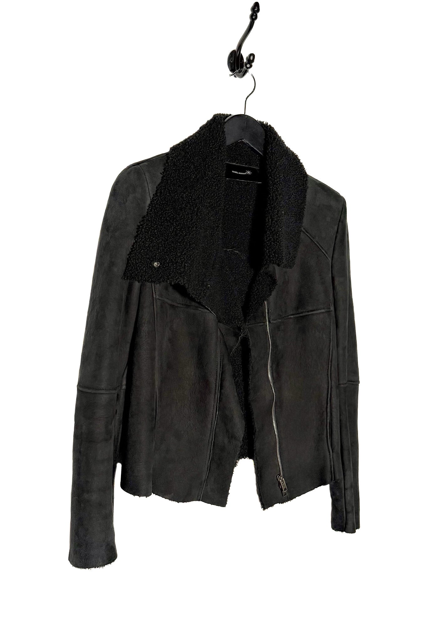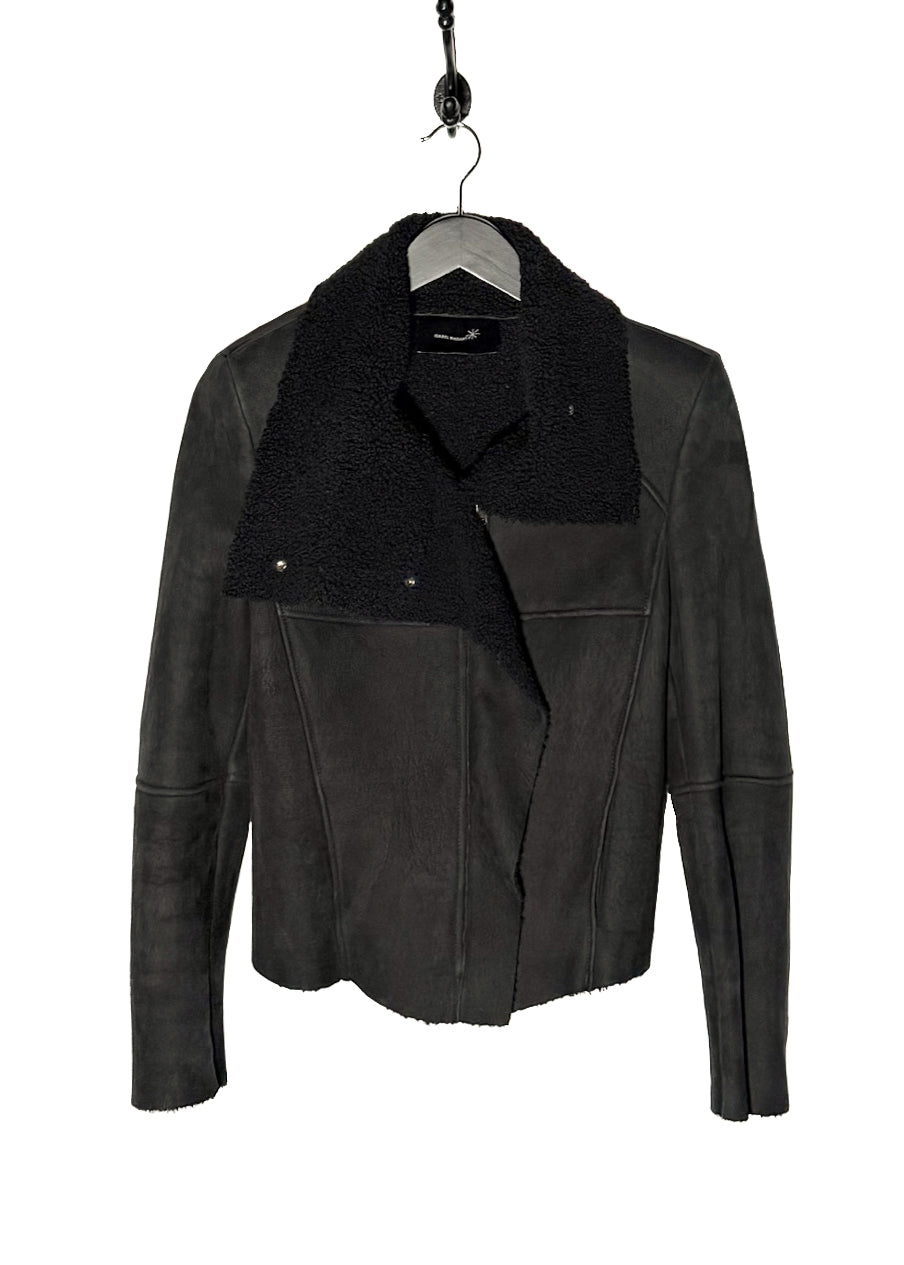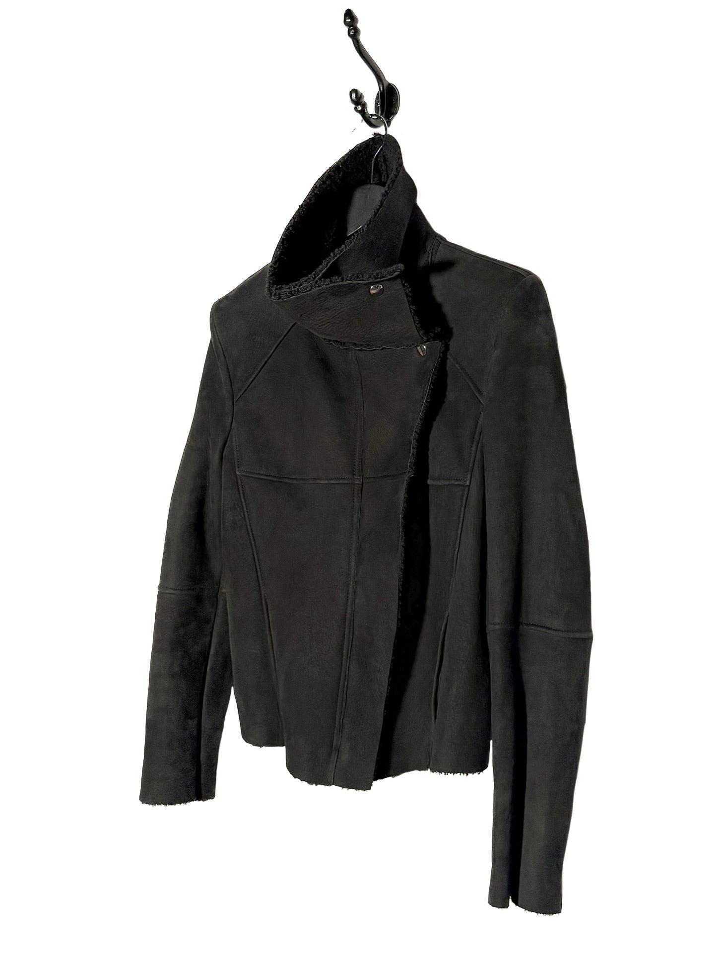 Short black lambskin shearling jacket. Fitted silhouette. Asymmetric zip-front closure. Fully shearling-lined interior. Wide shearling shawl collar with snap-button closure. Paneled leather construction with raw-cut hem. Long sleeves with zip cuffs. Two (2) front slit pockets. Shoulder padded (that can easily be removed). Made in France.