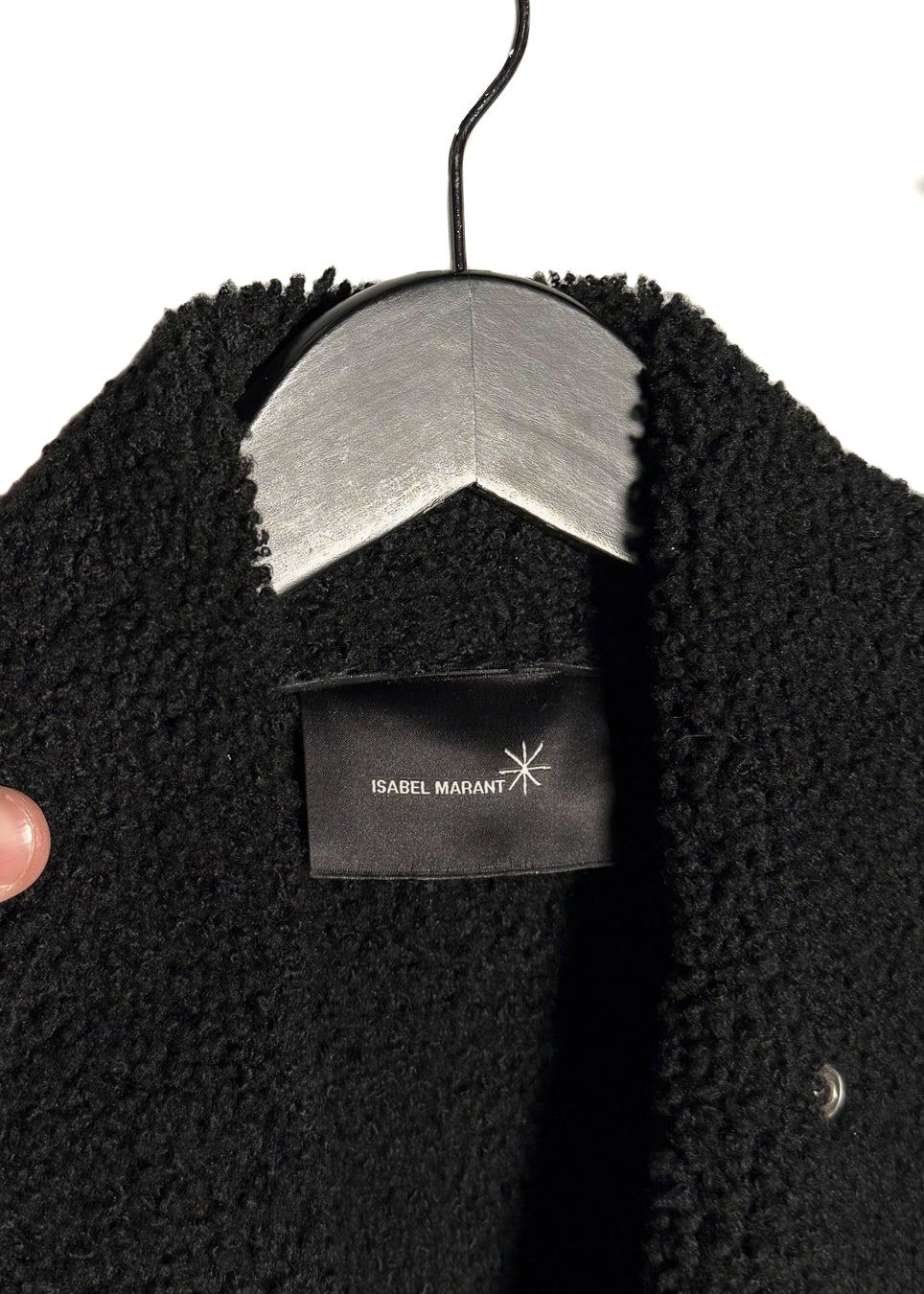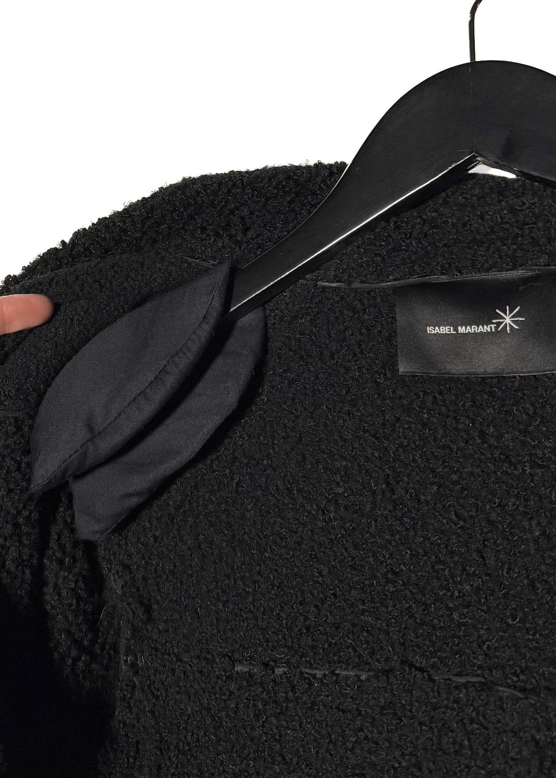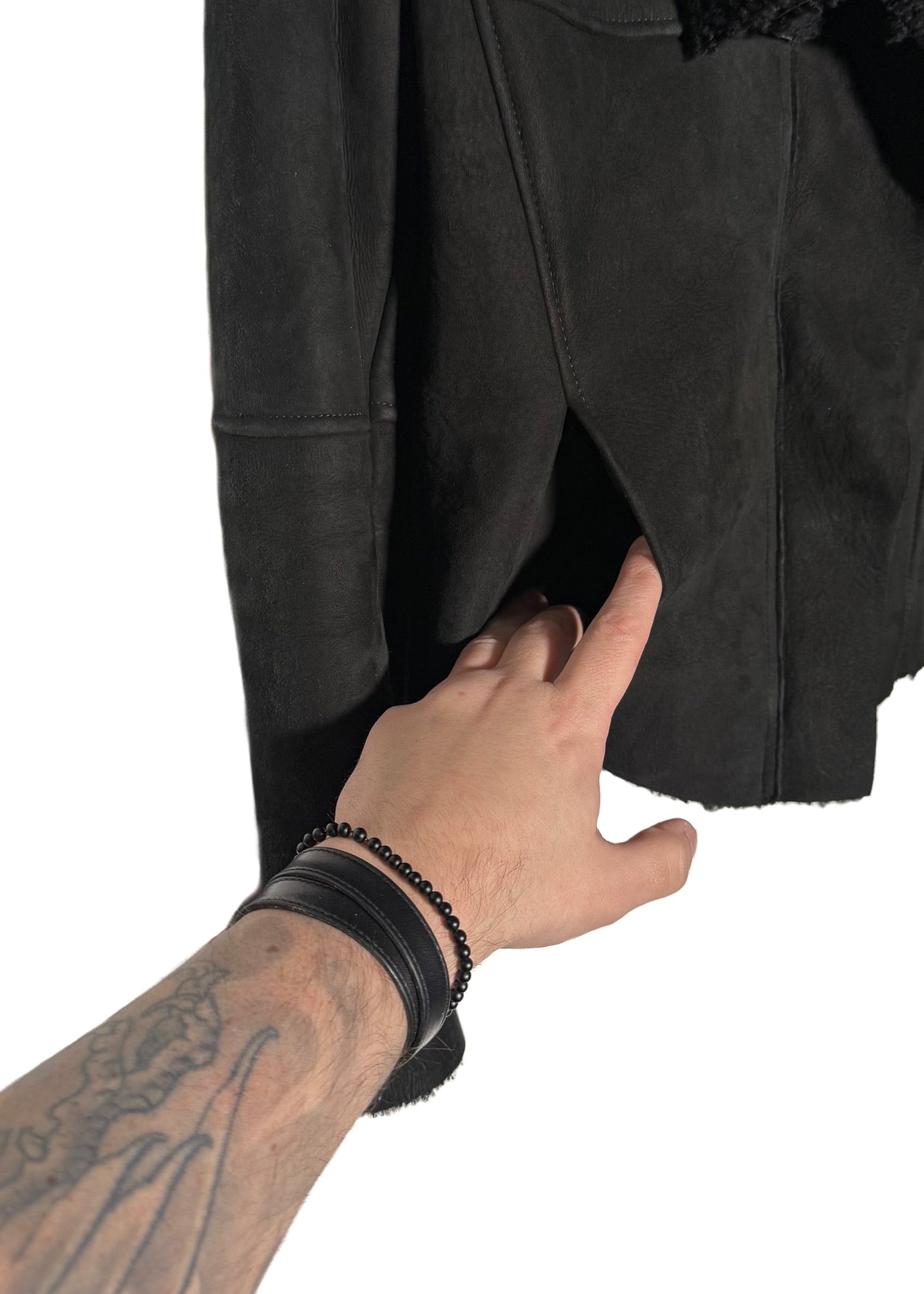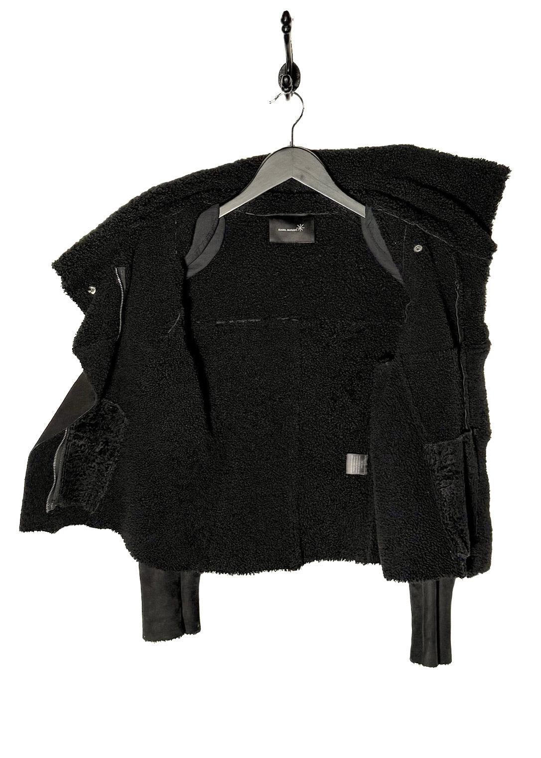 Short black lambskin shearling jacket. Fitted silhouette. Asymmetric zip-front closure. Fully shearling-lined interior. Wide shearling shawl collar with snap-button closure. Paneled leather construction with raw-cut hem. Long sleeves with zip cuffs. Two (2) front slit pockets. Shoulder padded (that can easily be removed). Made in France.