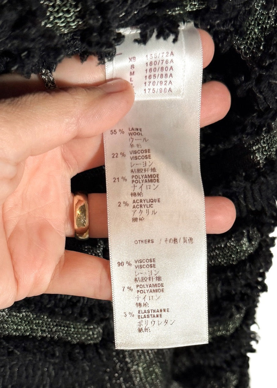 Design à manches longues avec rayures verticales texturées en laine noire et grise ornées de franges. Base en mesh transparente créant un effet semi-transparent. Encolure ras du cou noire. Coupe ajustée. Fait en Italie.