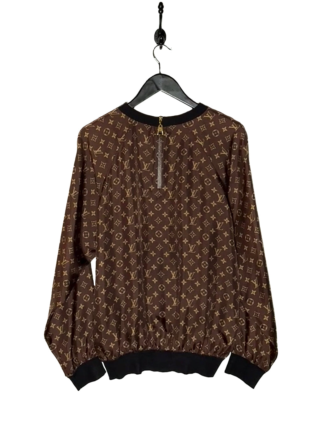 Pull sport Louis Vuitton 2021 en soie Monogram marron. Confectionné en soie avec un motif monogram marron intégral. Encolure ras du cou avec bord-côte en V. Manches longues et bords-côtes au col, aux poignets et à l'ourlet. Demi-zip au dos avec tirette monogrammée. Finitions dorées siglées. Coupe décontractée. Fabriqué en Italie.