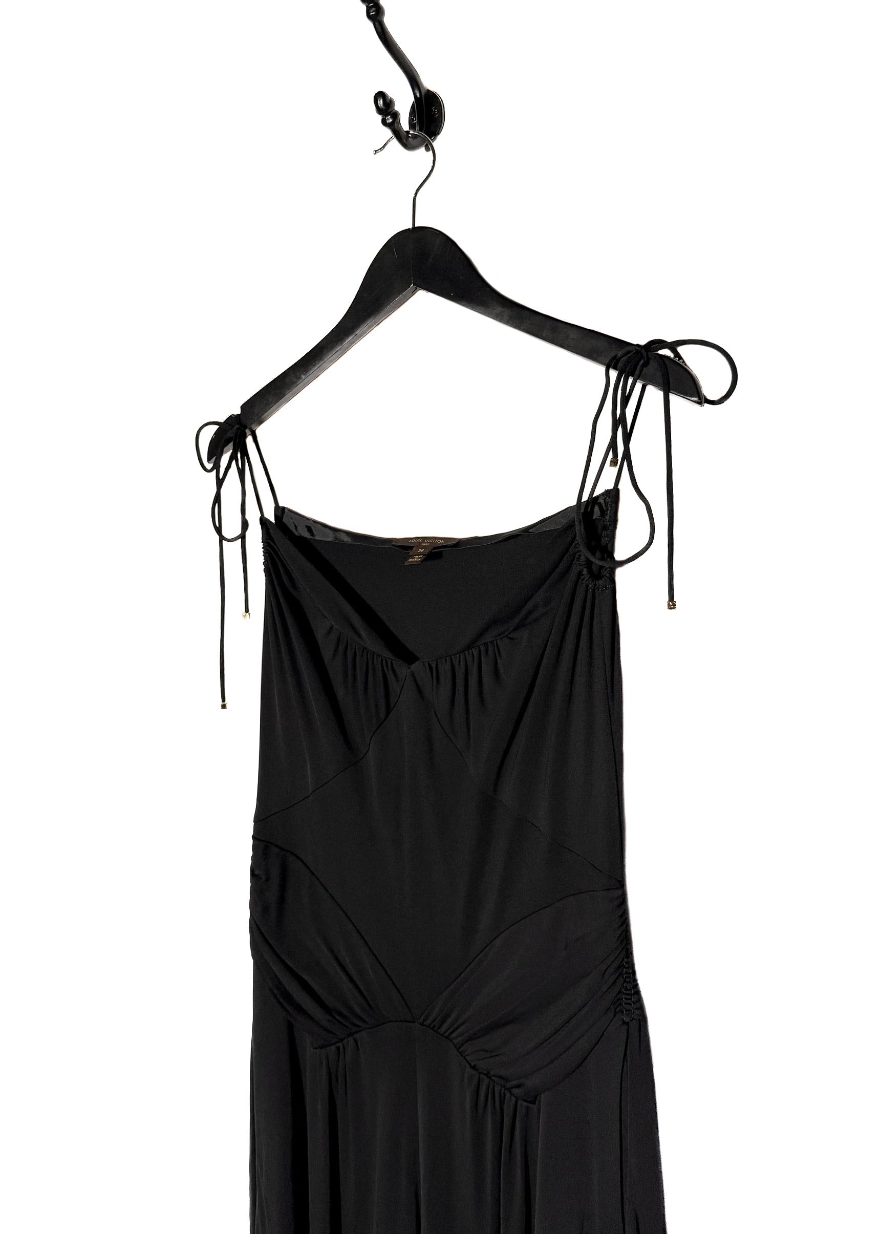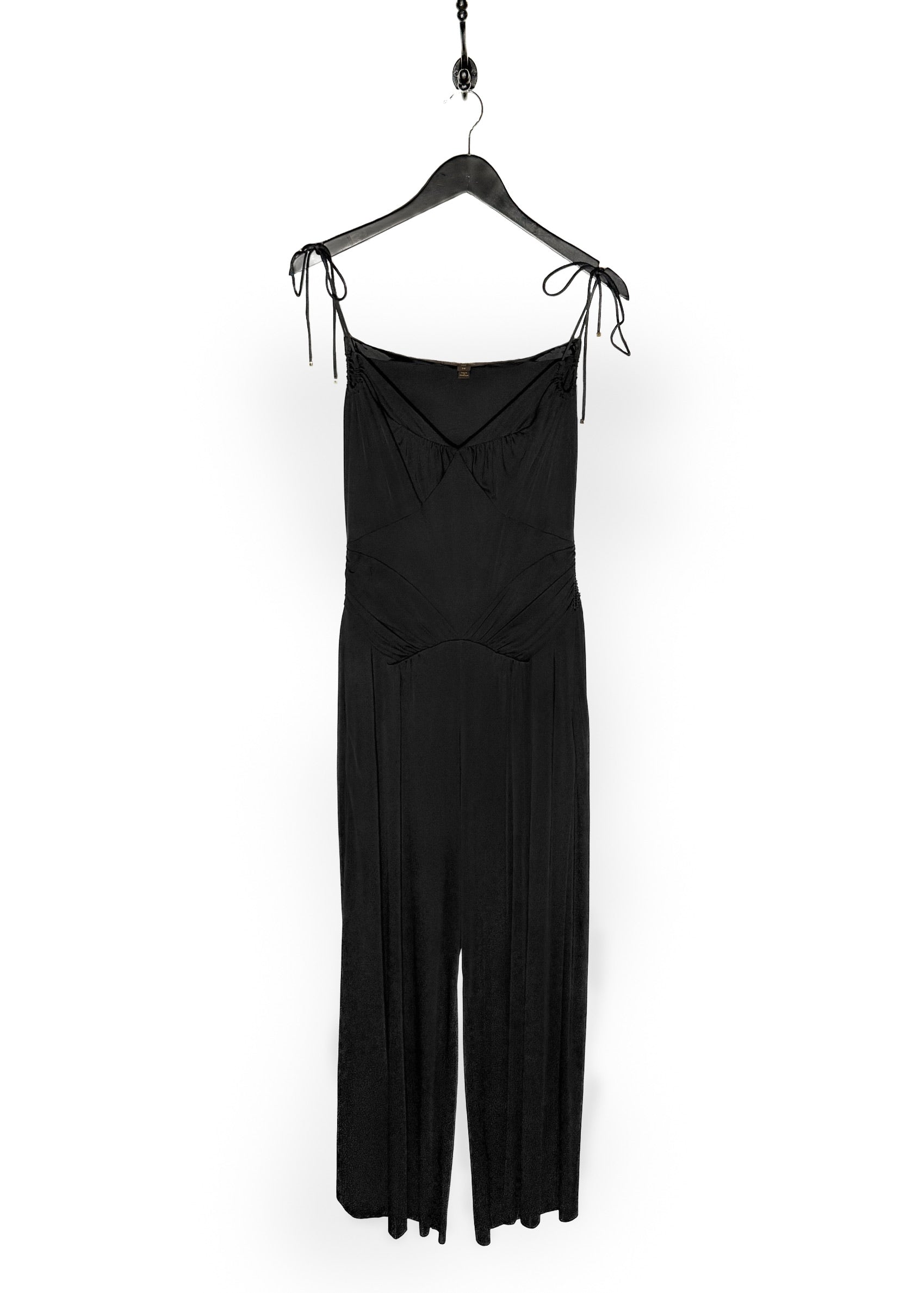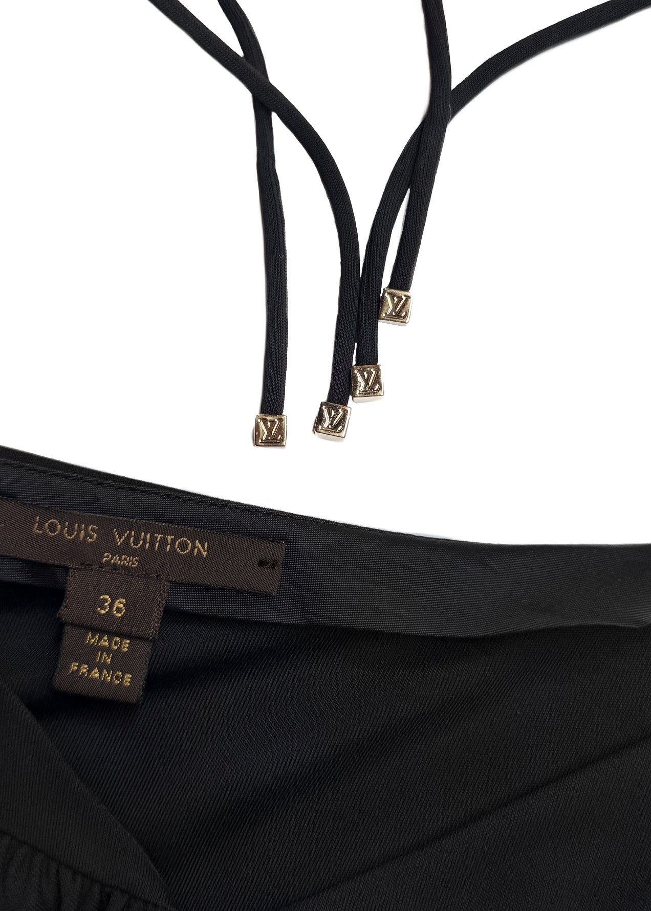 Dotée de fines bretelles à nouer aux épaules, ornées de cubes LV en métal doré. Détail drapé froncé à la taille. Viscose noire légère. Silhouette ajustée à jambes larges. Poches fendues sur les côtés. Faite en France.