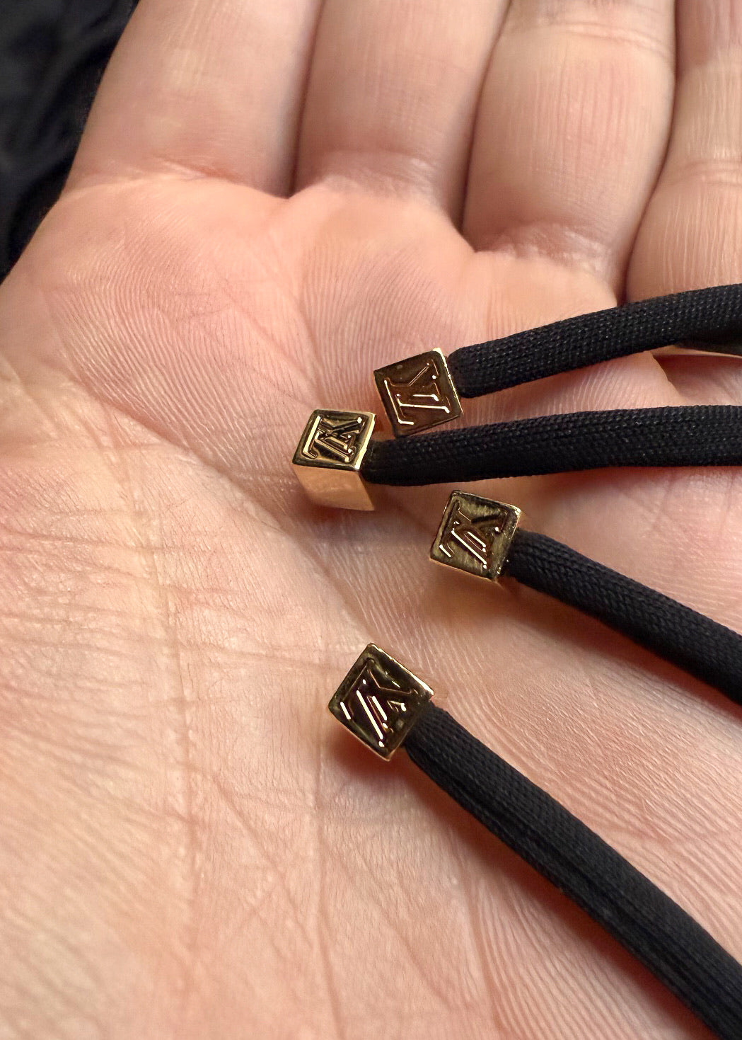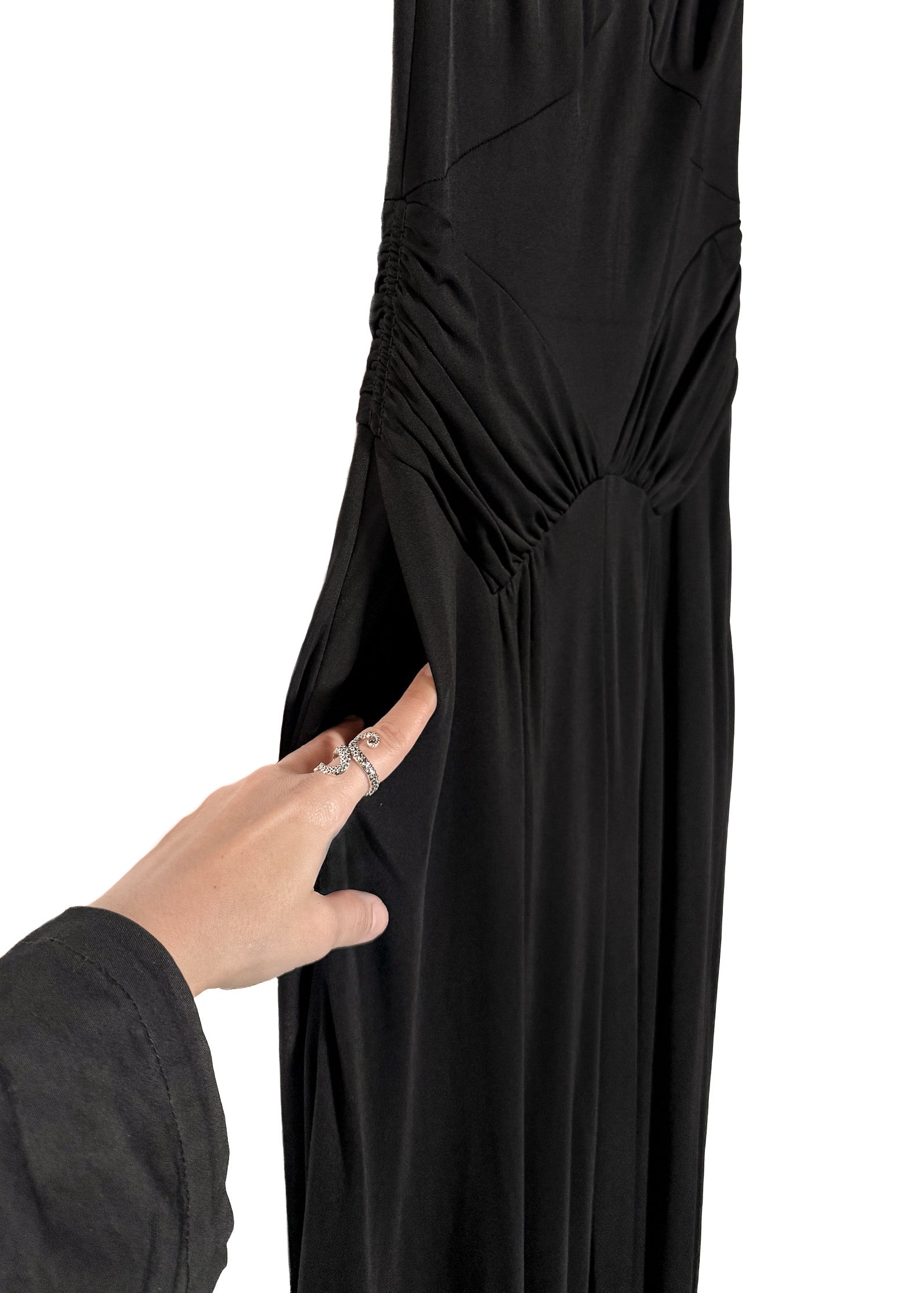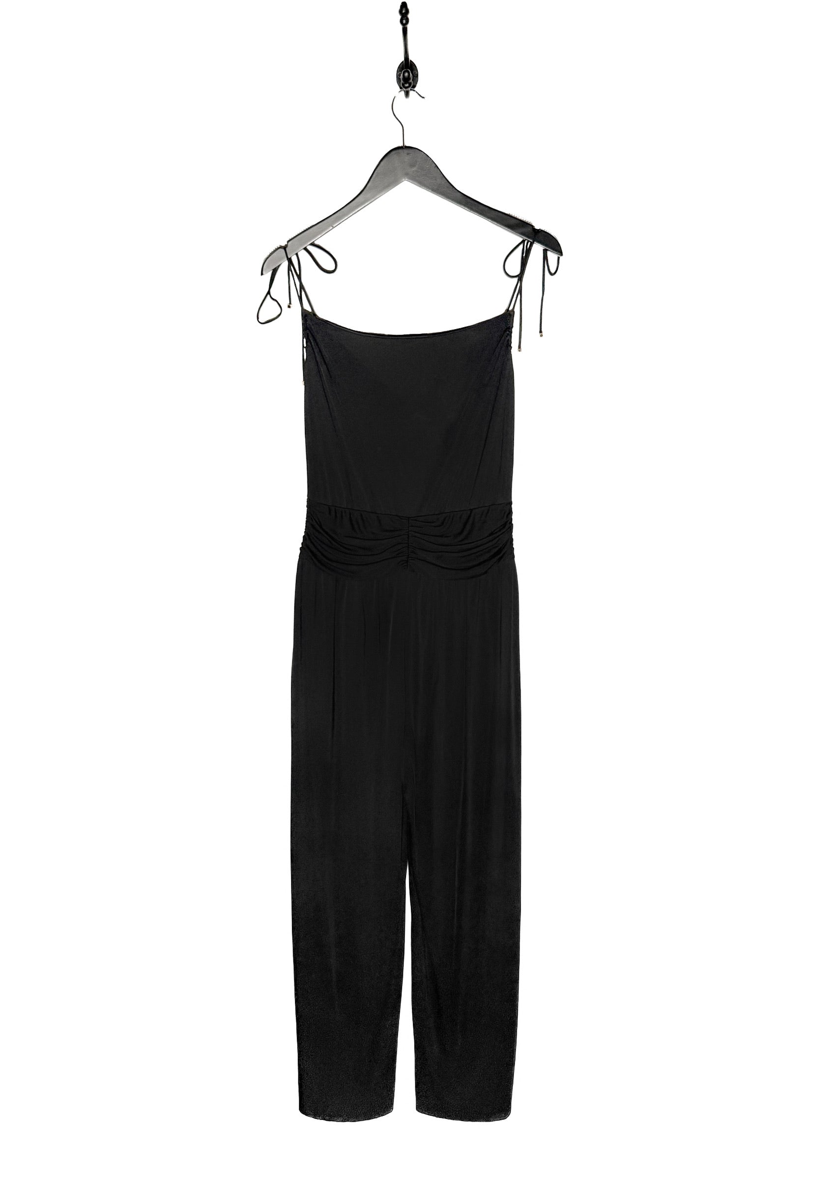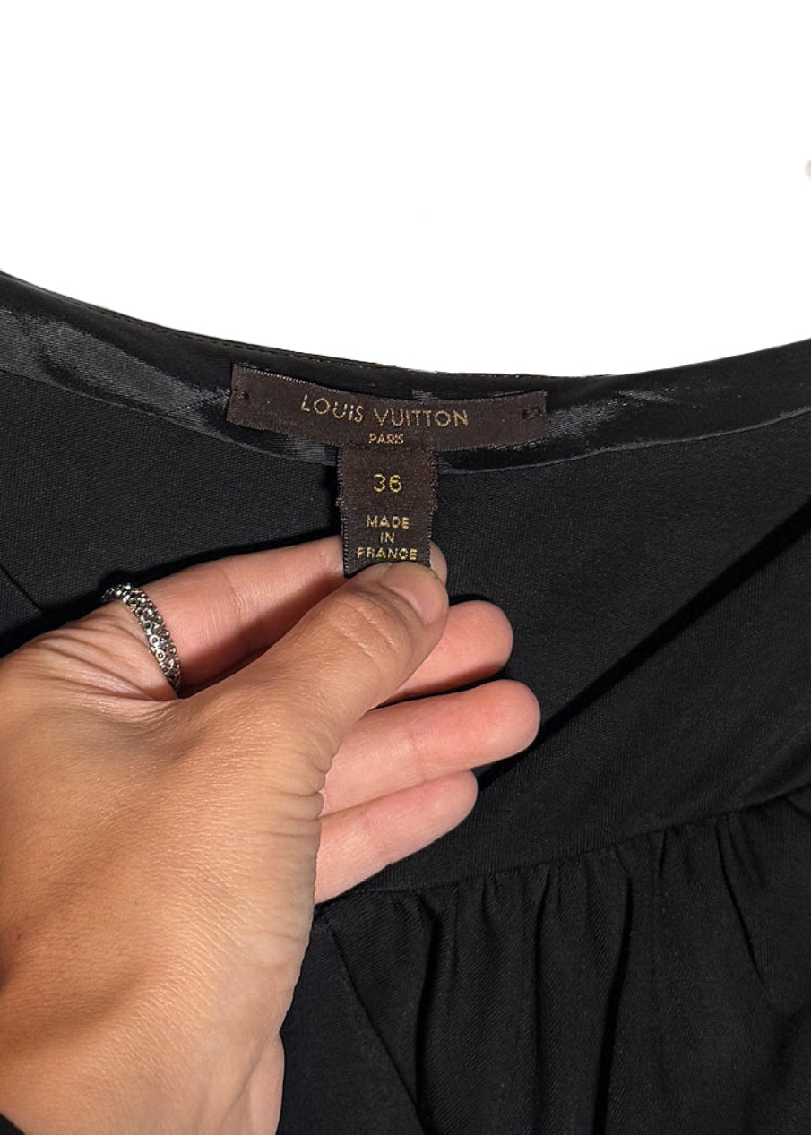 Dotée de fines bretelles à nouer aux épaules, ornées de cubes LV en métal doré. Détail drapé froncé à la taille. Viscose noire légère. Silhouette ajustée à jambes larges. Poches fendues sur les côtés. Faite en France.