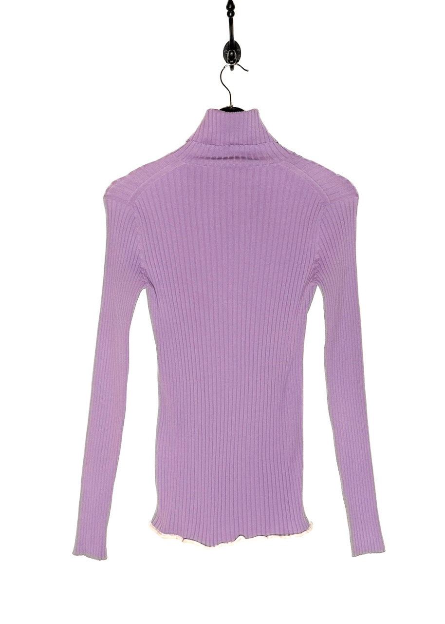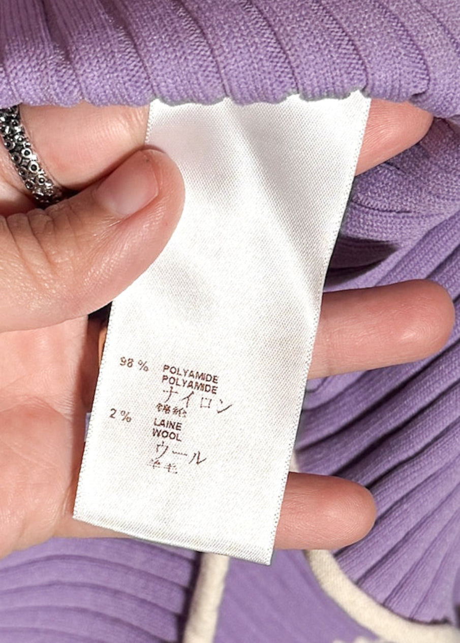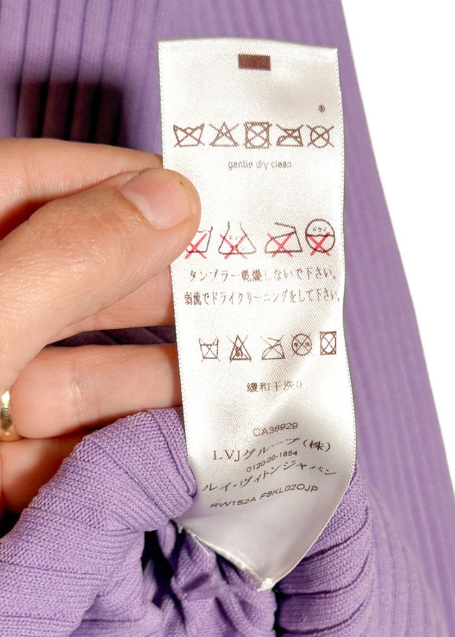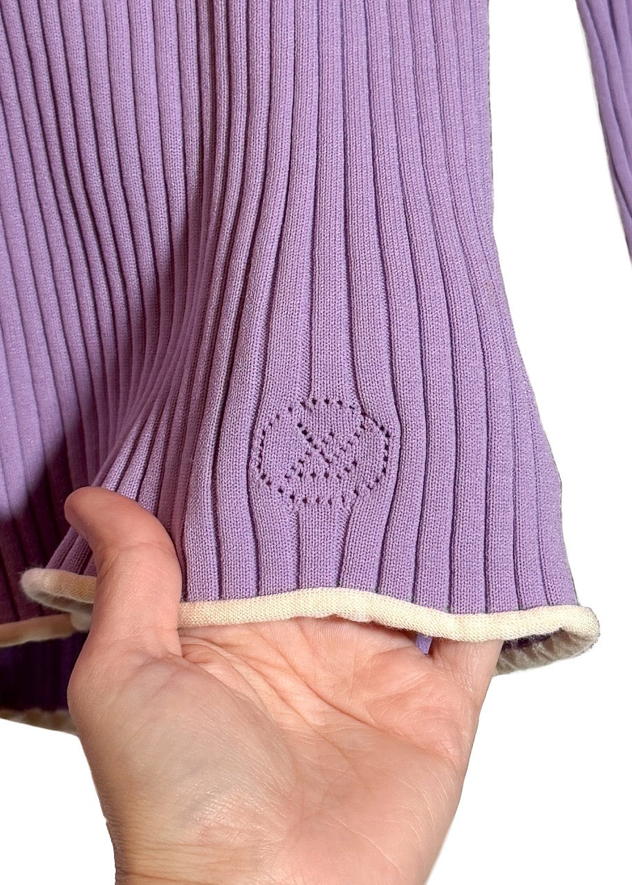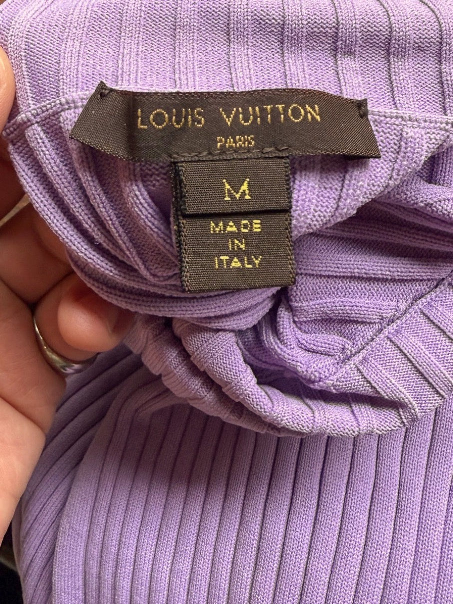 De la collection Automne Hiver 2015. Maille fine côtelée à la coupe ajustée et col roulé replié. Teinte lavande violette. Finition ivoire au bas. Logo LV Cercle ajouré sur l’ourlet avant. Manches longues. Fait en Italie.