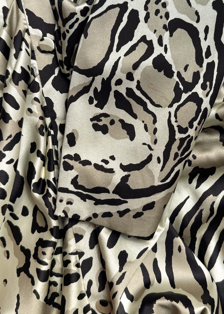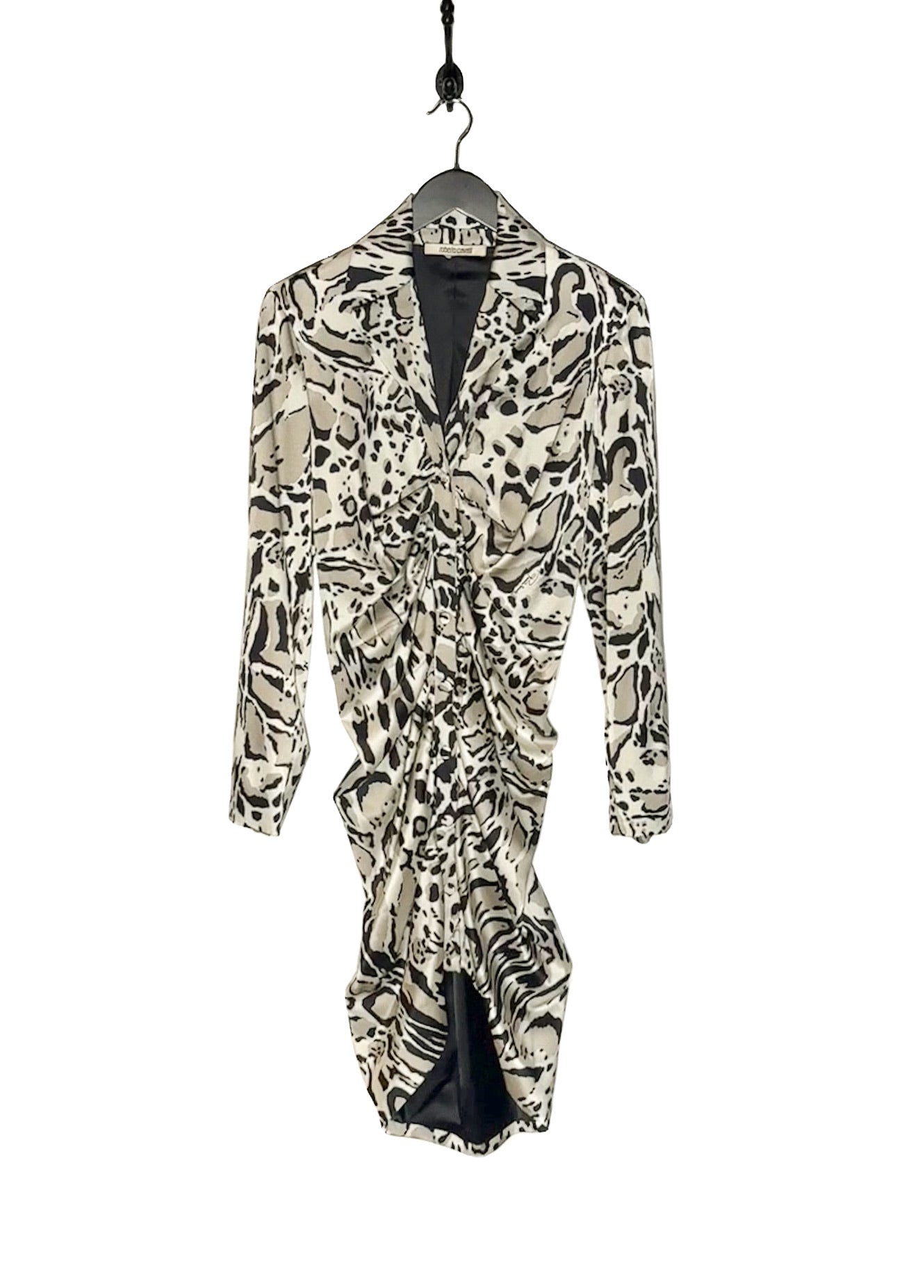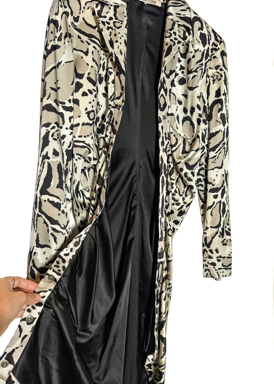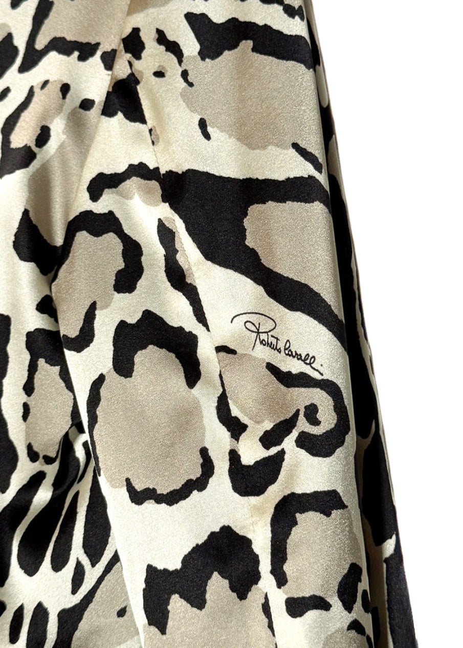 Robe-chemise Roberto Cavalli en satin de soie ivoire à imprimé animalier. Robe midi en satin de soie. Col chemise à revers crantés. Manches longues. Fermeture par boutons-pression. Motif à imprimé animalier avec signatures intégrées de Roberto Cavalli. Effet drapé et froncé. Doublure noire. La teinte ivoire peut paraître légèrement verdâtre selon l’éclairage. Étiquettes retirées par le propriétaire précédent.