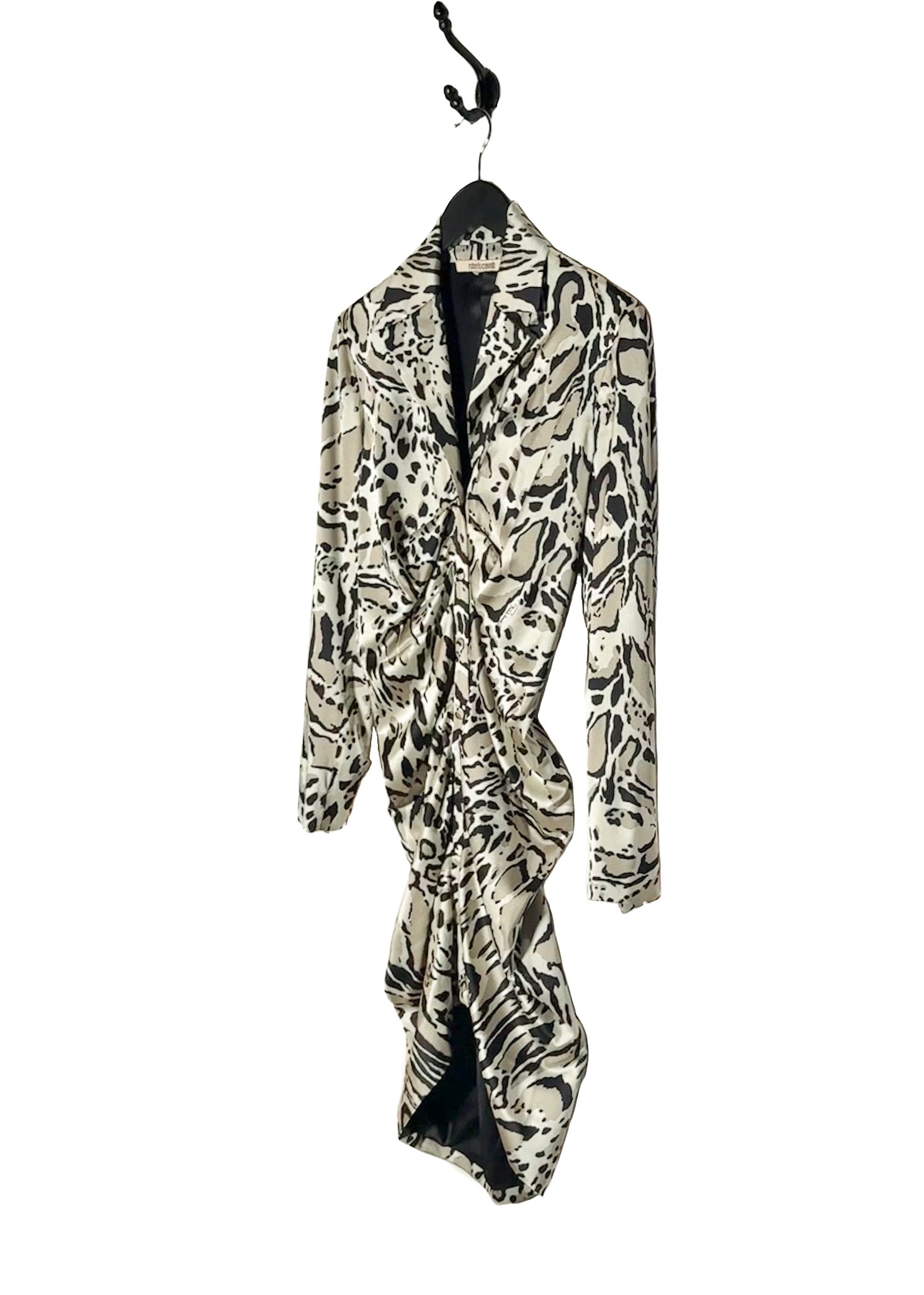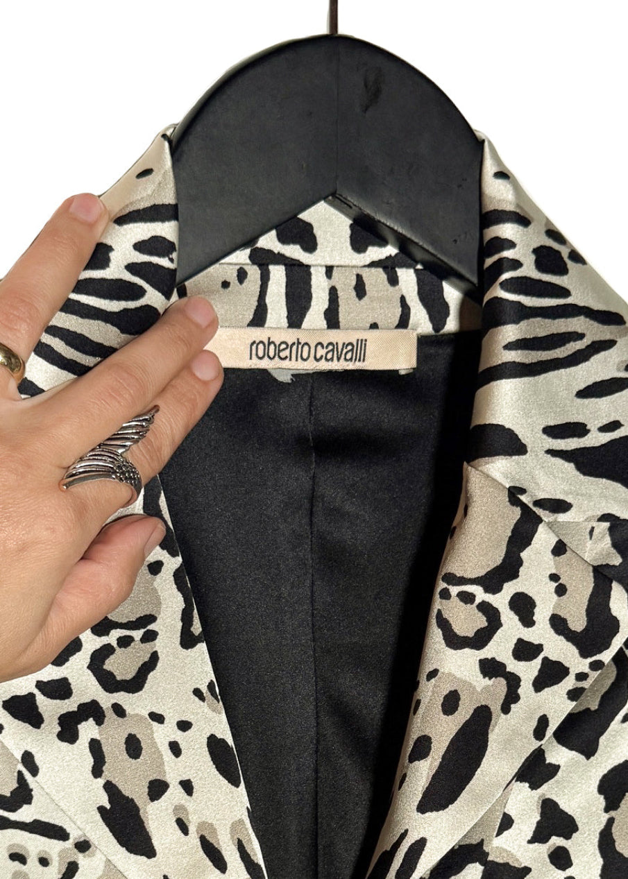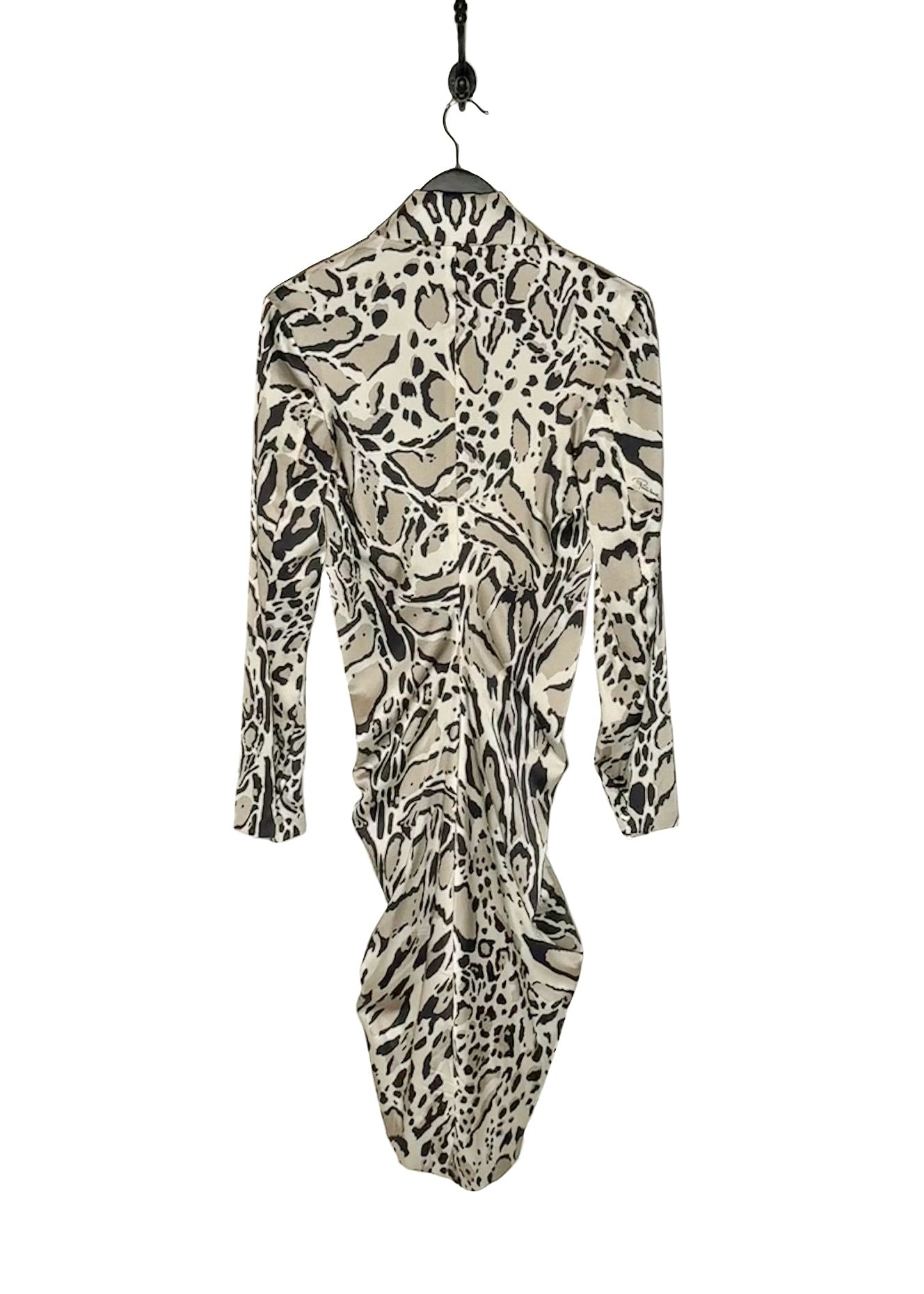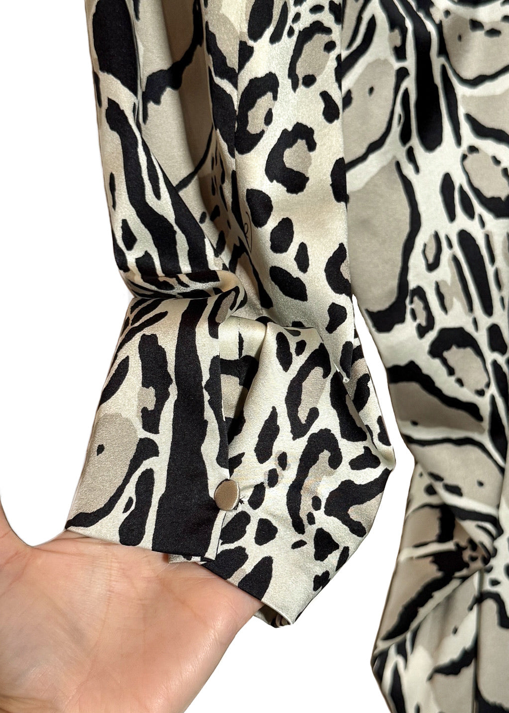 Robe-chemise Roberto Cavalli en satin de soie ivoire à imprimé animalier. Robe midi en satin de soie. Col chemise à revers crantés. Manches longues. Fermeture par boutons-pression. Motif à imprimé animalier avec signatures intégrées de Roberto Cavalli. Effet drapé et froncé. Doublure noire. La teinte ivoire peut paraître légèrement verdâtre selon l’éclairage. Étiquettes retirées par le propriétaire précédent.