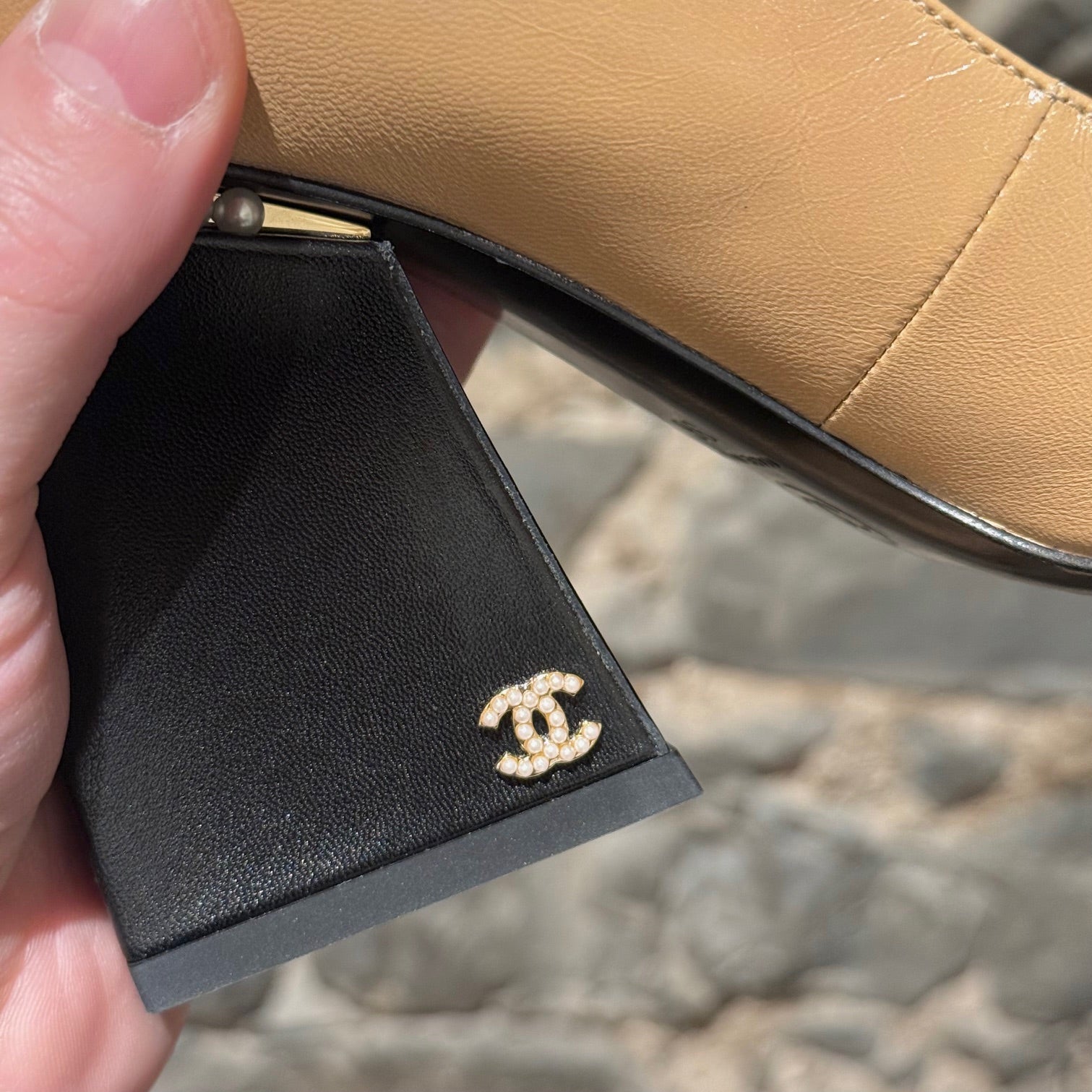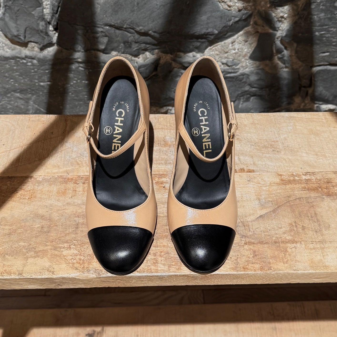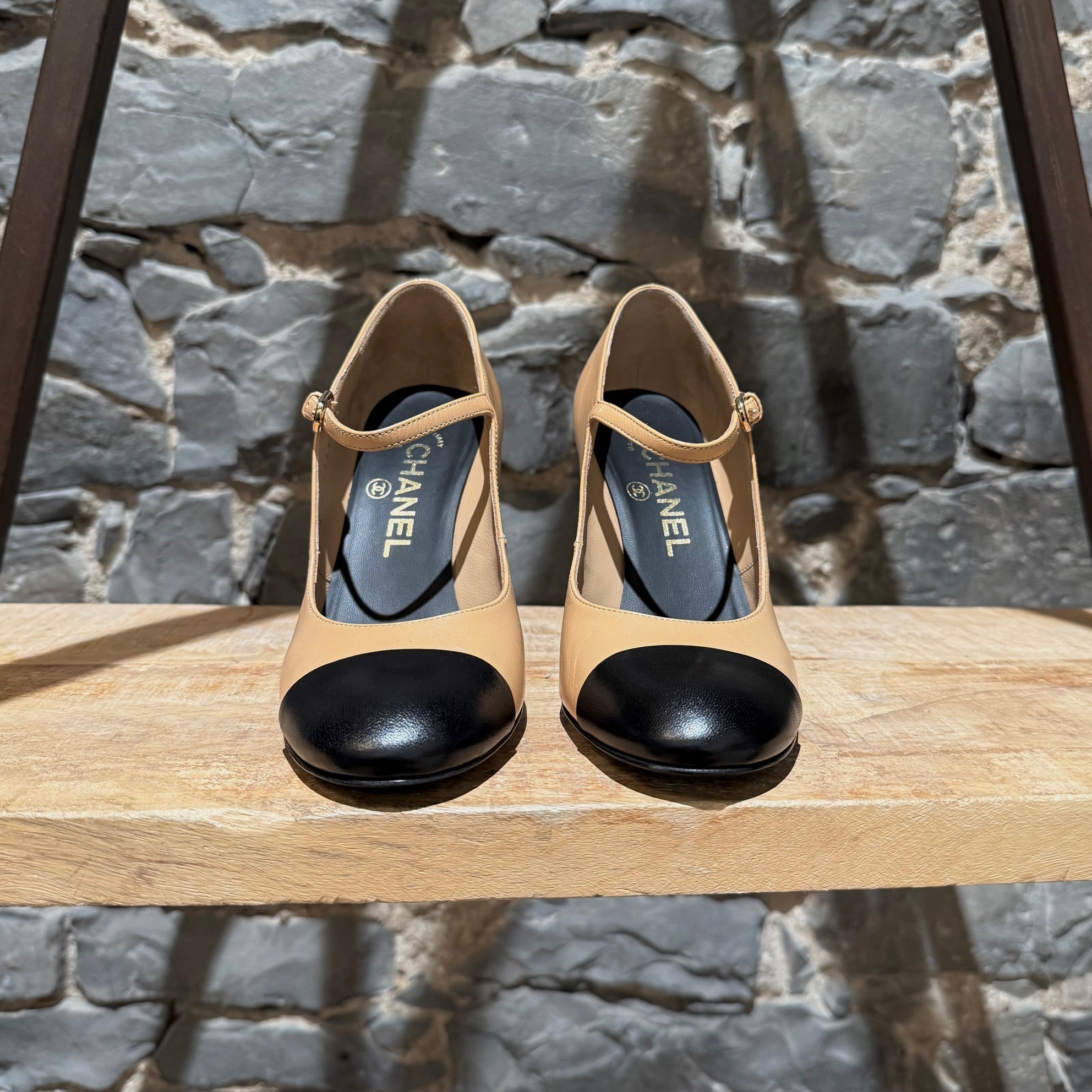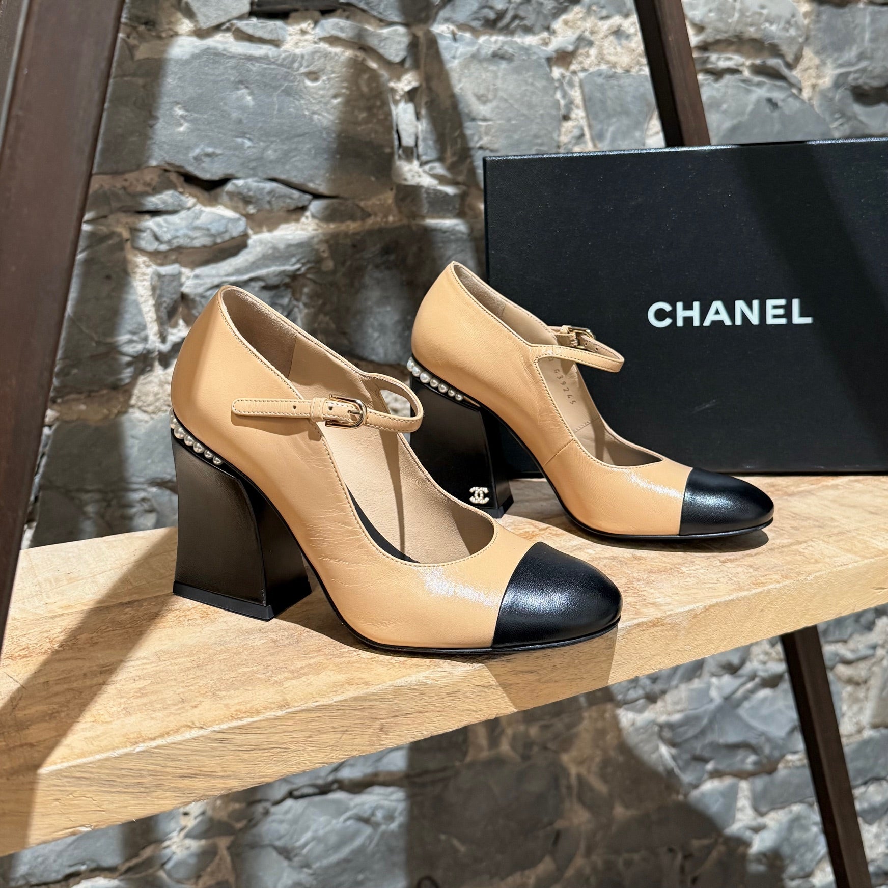 De la collection 2022. Silhouette Mary Jane avec talon bloc et bout arrondi. Cuir beige avec contraste bout noir. Rangée de perles à l’arrière du talon et logo CC avec détail de micro perles au talon intérieur. Bride ajustable avec boucle en quincaillerie dorée. Semelle intérieure et semelle extérieure en cuir. Faits en Italie. Livrés avec boîte d’origine et sac poussière.