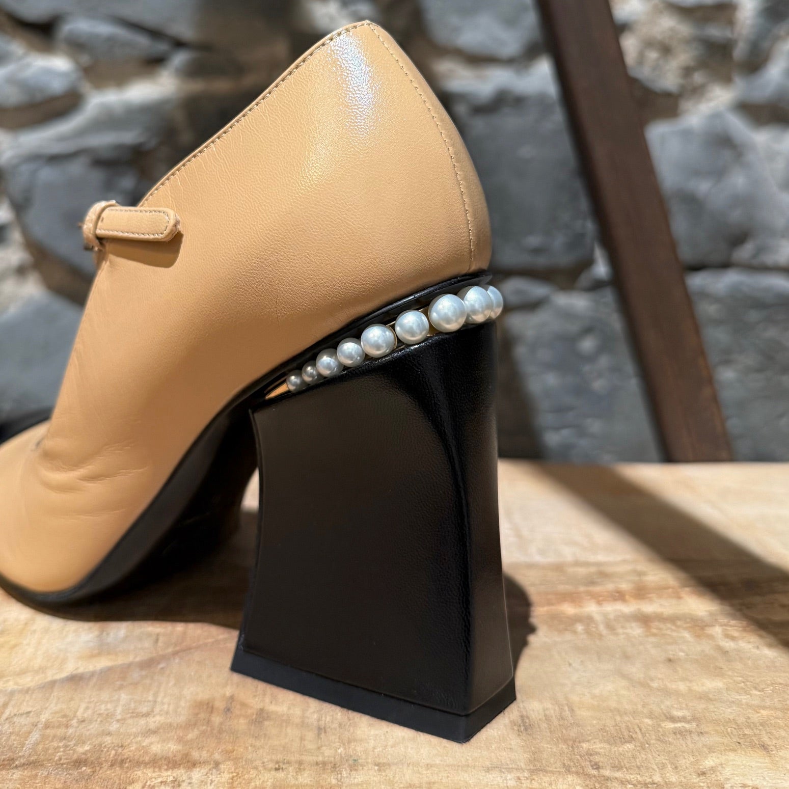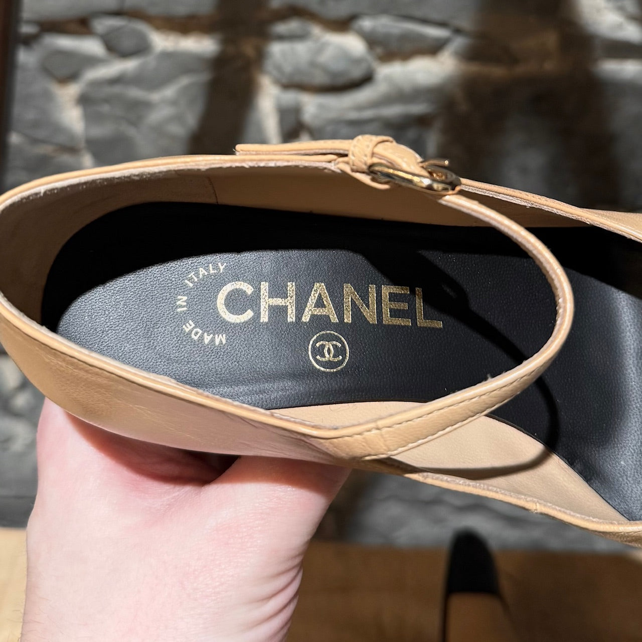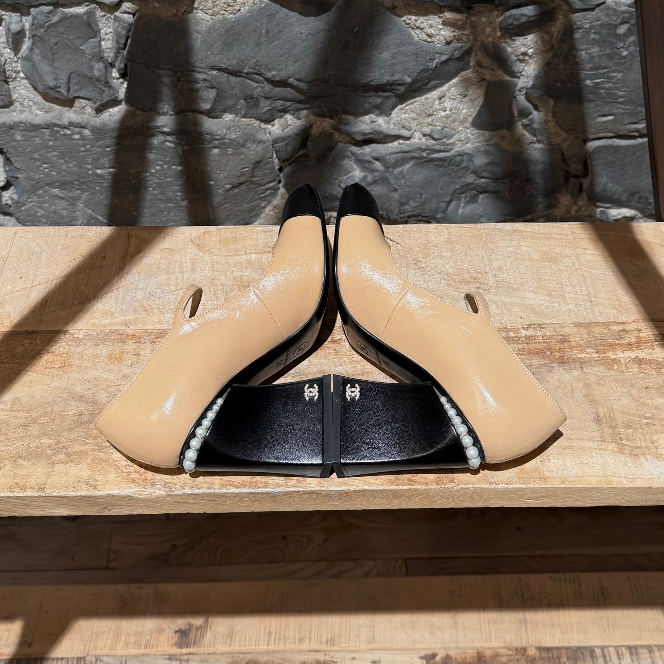 De la collection 2022. Silhouette Mary Jane avec talon bloc et bout arrondi. Cuir beige avec contraste bout noir. Rangée de perles à l’arrière du talon et logo CC avec détail de micro perles au talon intérieur. Bride ajustable avec boucle en quincaillerie dorée. Semelle intérieure et semelle extérieure en cuir. Faits en Italie. Livrés avec boîte d’origine et sac poussière.