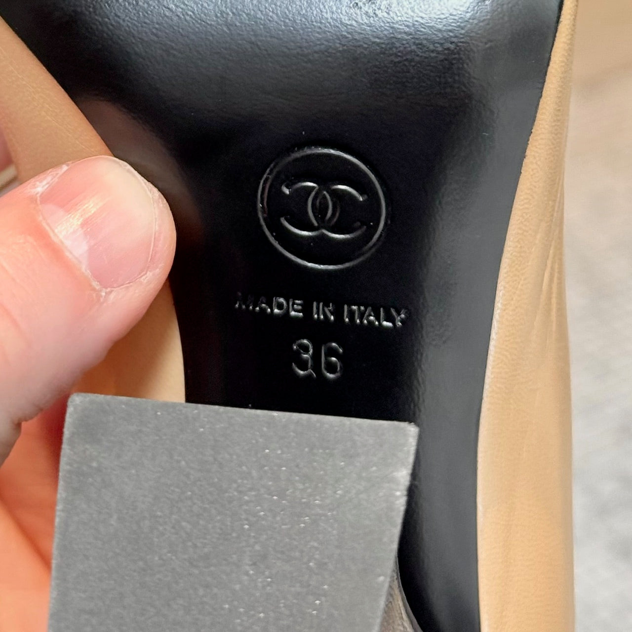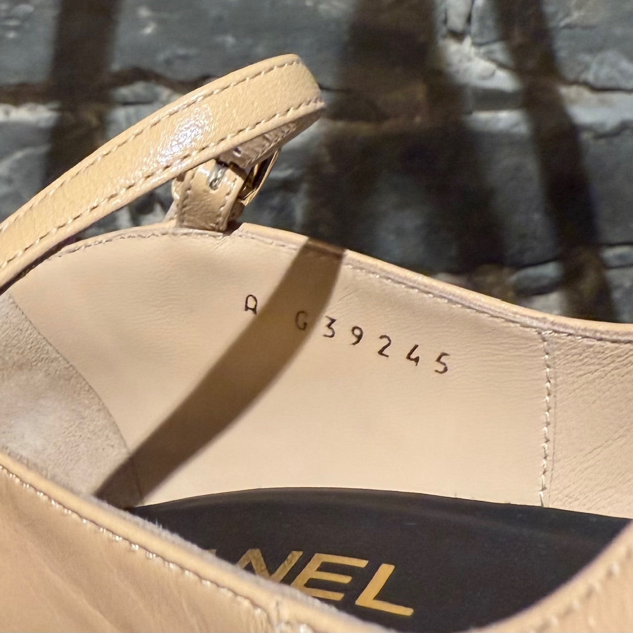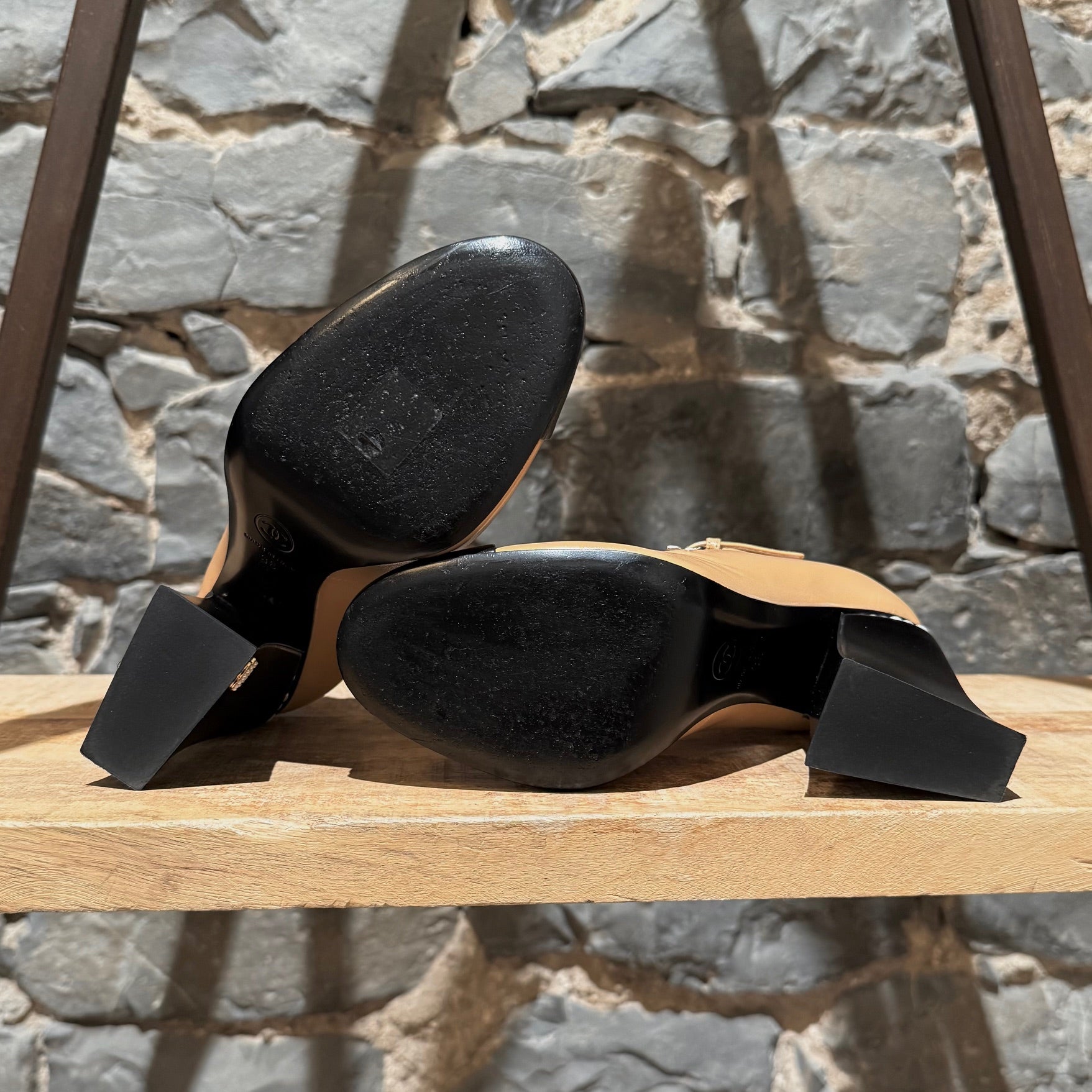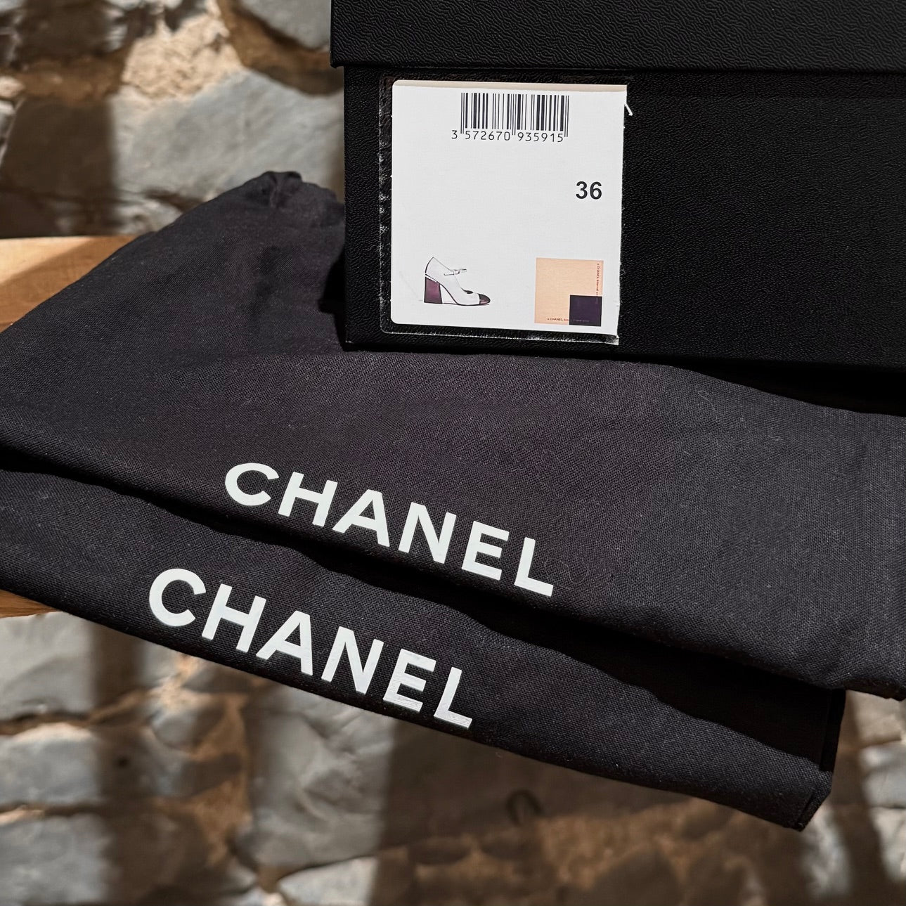 De la collection 2022. Silhouette Mary Jane avec talon bloc et bout arrondi. Cuir beige avec contraste bout noir. Rangée de perles à l’arrière du talon et logo CC avec détail de micro perles au talon intérieur. Bride ajustable avec boucle en quincaillerie dorée. Semelle intérieure et semelle extérieure en cuir. Faits en Italie. Livrés avec boîte d’origine et sac poussière.