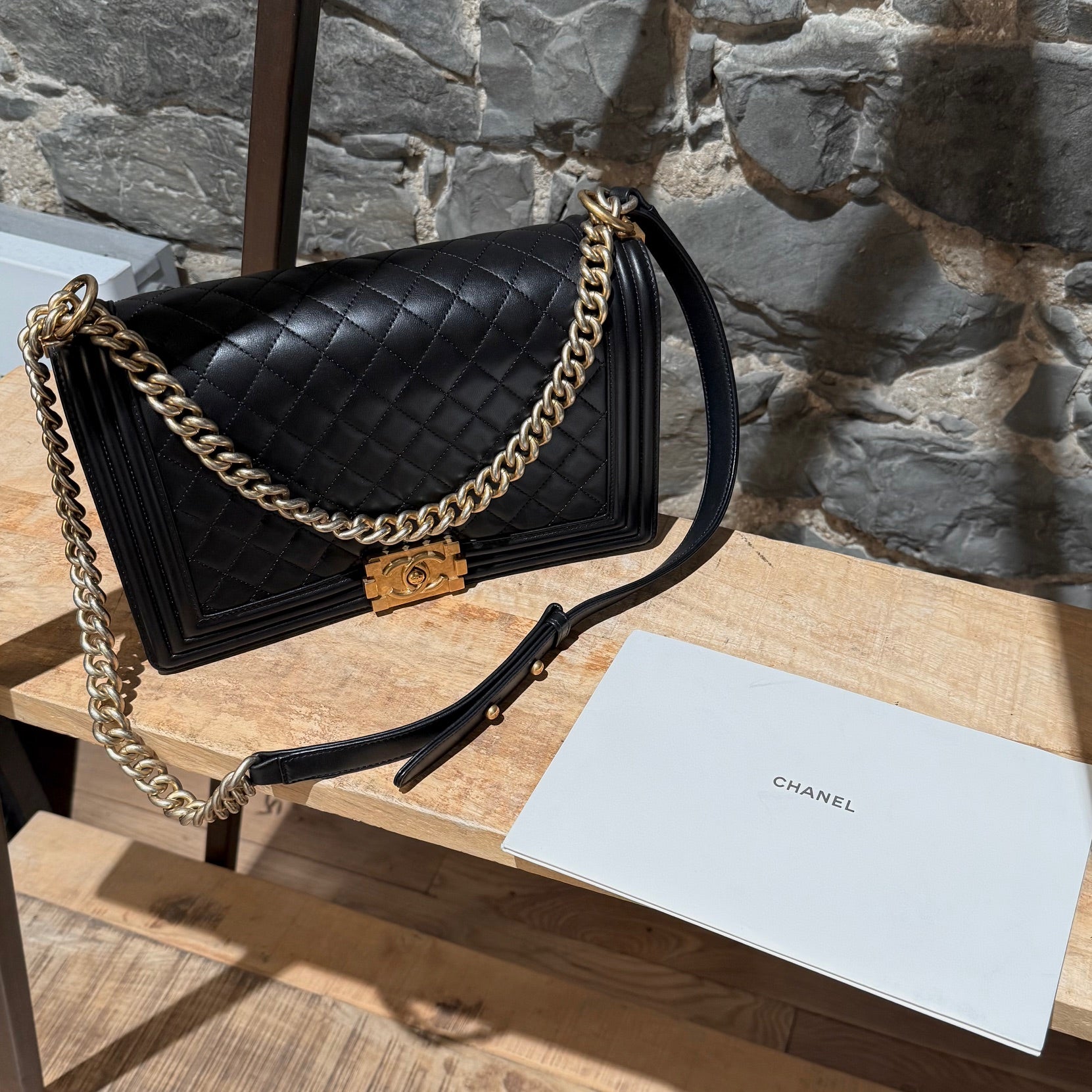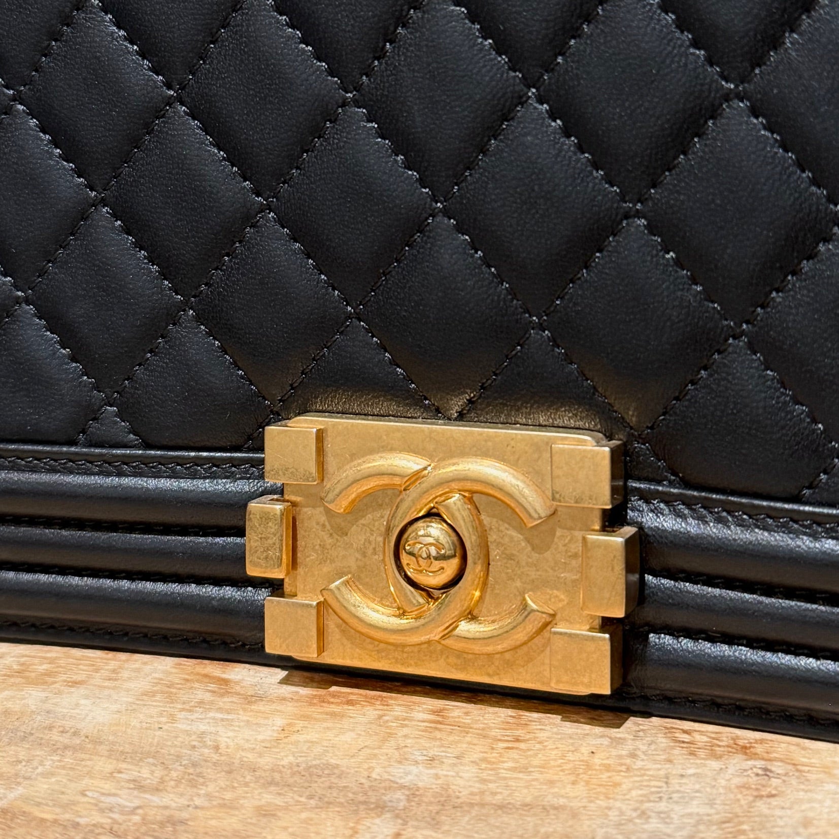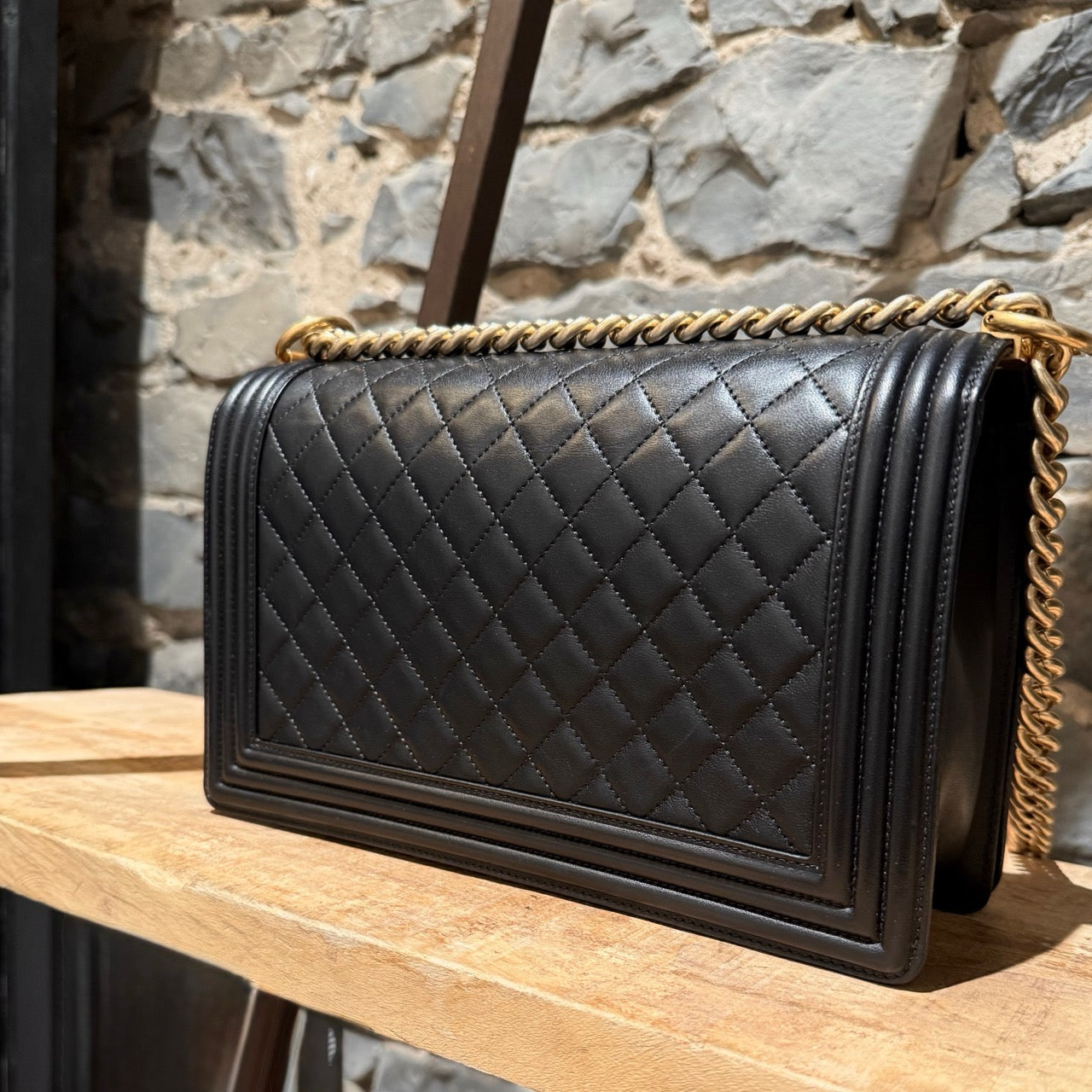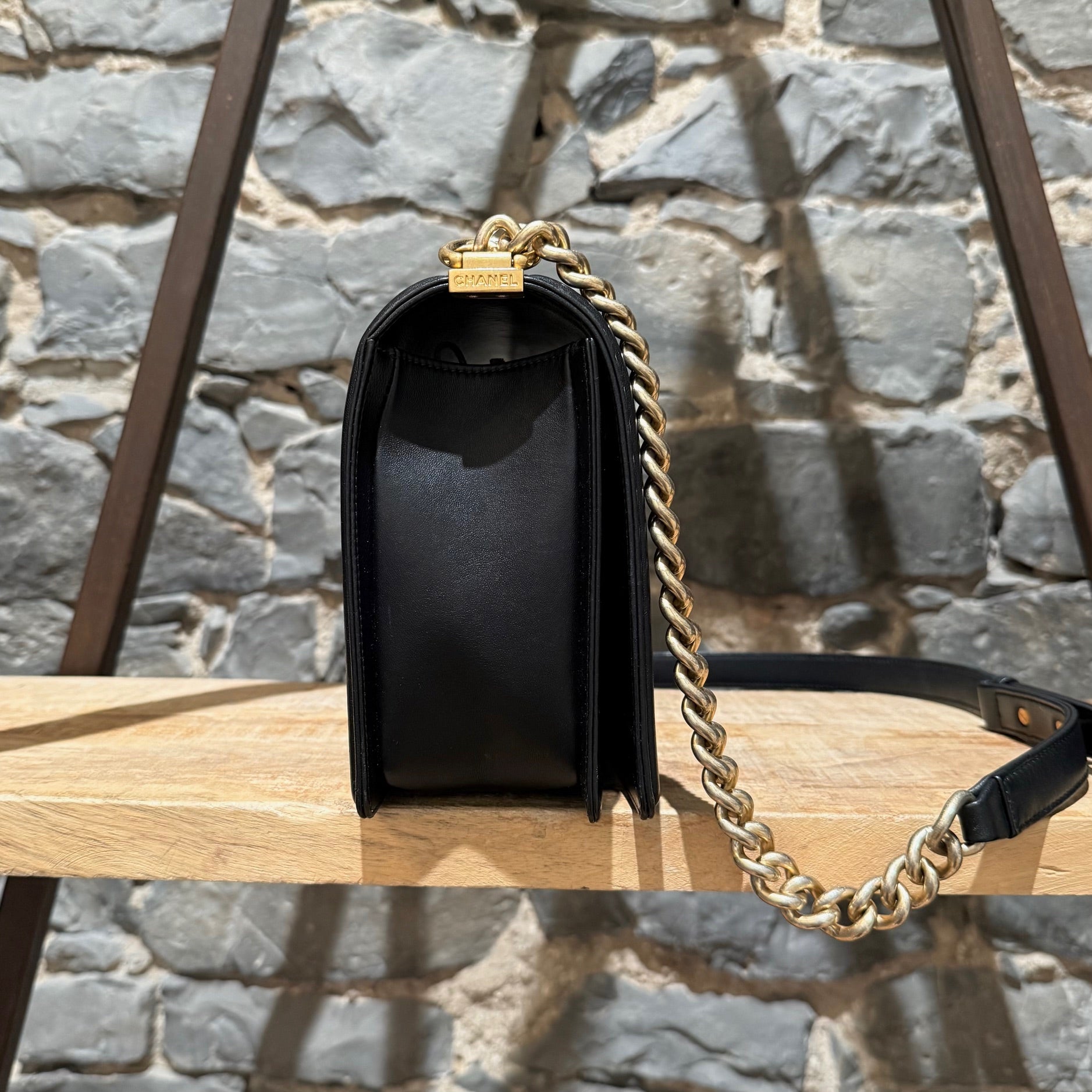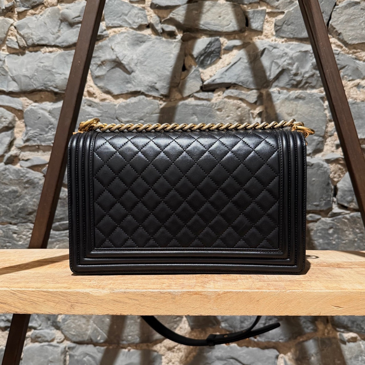 Design rectangulaire structuré en cuir d’agneau noir souple matelassé à motif losanges. Quincaillerie dorée siglée à finition semi antique. Bordures en cuir lisse et arêtes renforcées. Rabat frontal avec fermoir poussoir Boy emblématique et motif CC entrelacé gravé. Bandoulière chaîne et cuir permettant un porté à l’épaule ou en bandoulière. Doublure intérieure en tissu noir comprenant une (1) poche intérieure zippée. Série 23 – production 2016-2017. Fait en Italie. Livré avec le livret d’entretien Chanel.