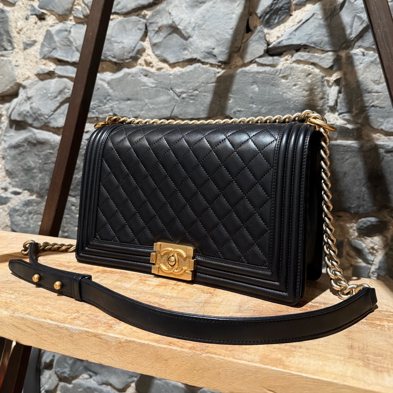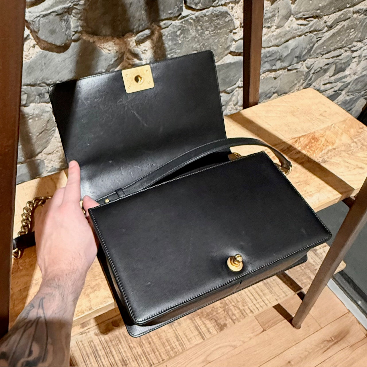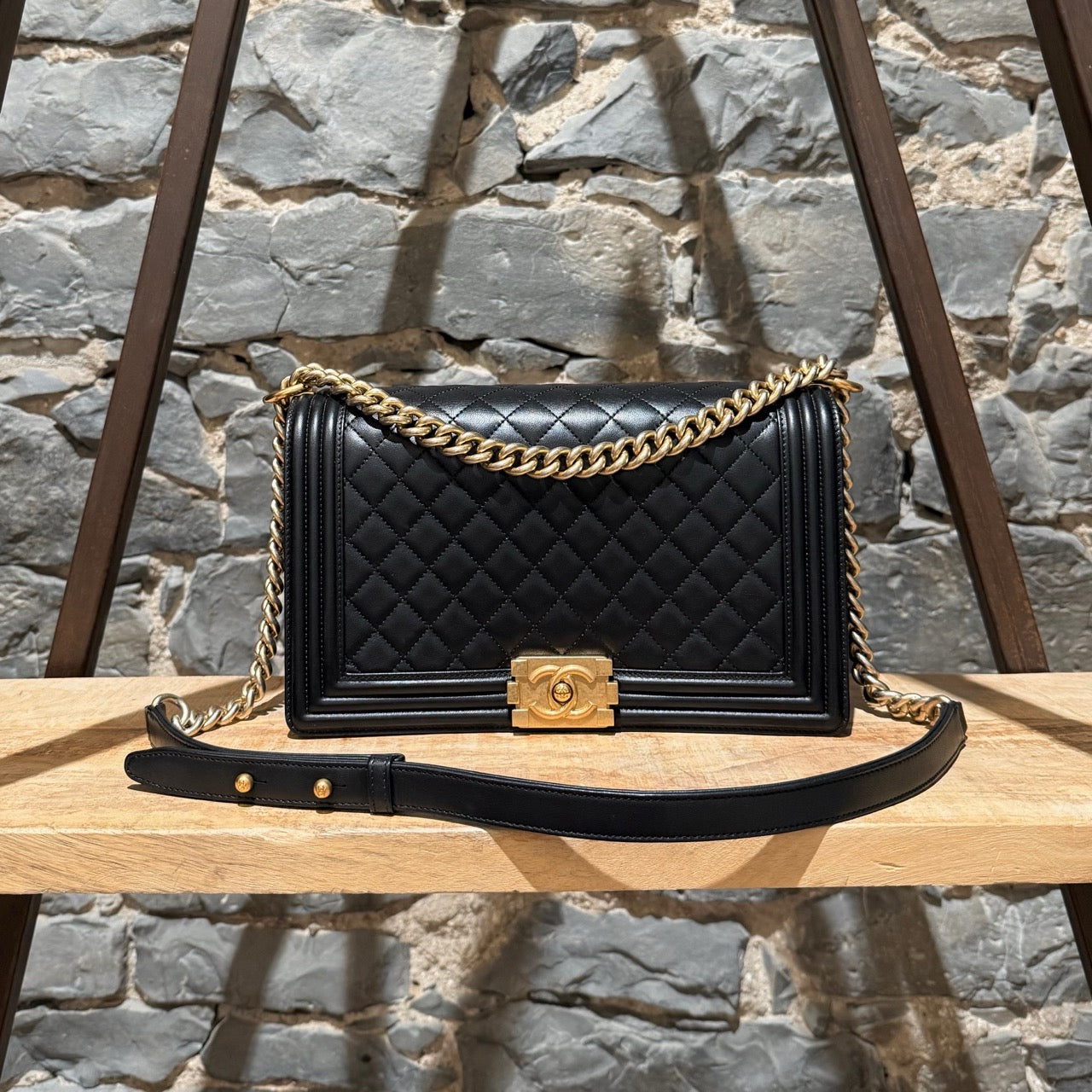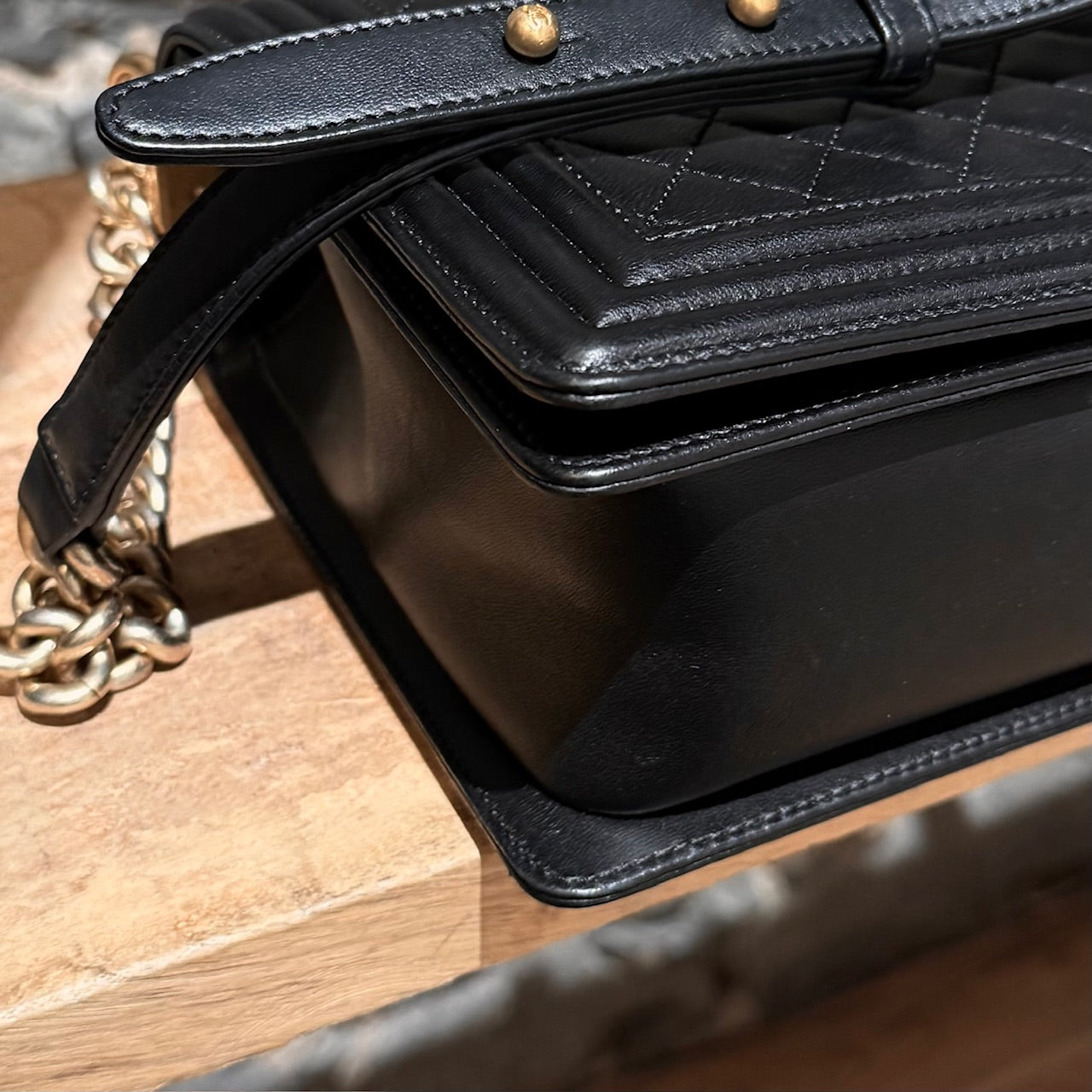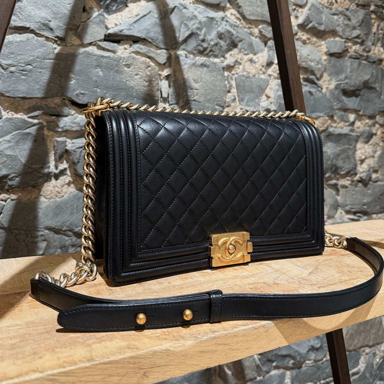 Design rectangulaire structuré en cuir d’agneau noir souple matelassé à motif losanges. Quincaillerie dorée siglée à finition semi antique. Bordures en cuir lisse et arêtes renforcées. Rabat frontal avec fermoir poussoir Boy emblématique et motif CC entrelacé gravé. Bandoulière chaîne et cuir permettant un porté à l’épaule ou en bandoulière. Doublure intérieure en tissu noir comprenant une (1) poche intérieure zippée. Série 23 – production 2016-2017. Fait en Italie. Livré avec le livret d’entretien Chanel.