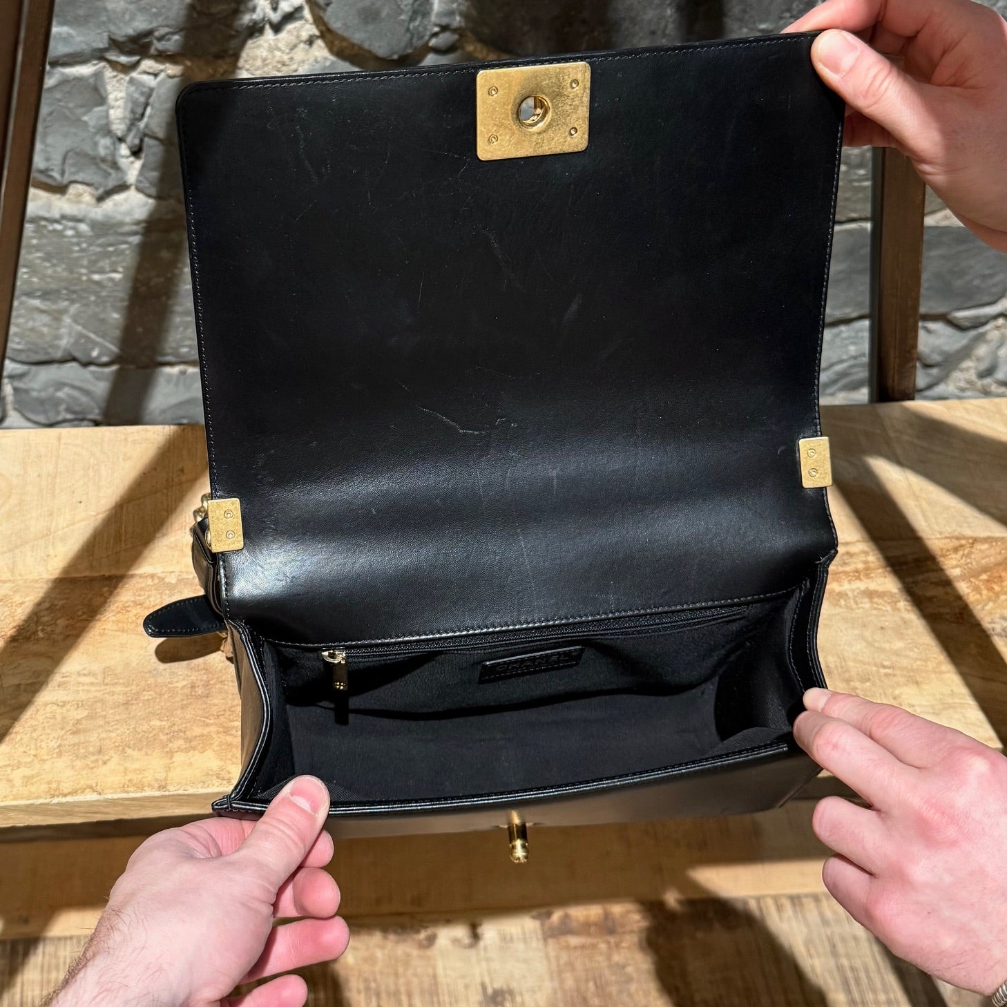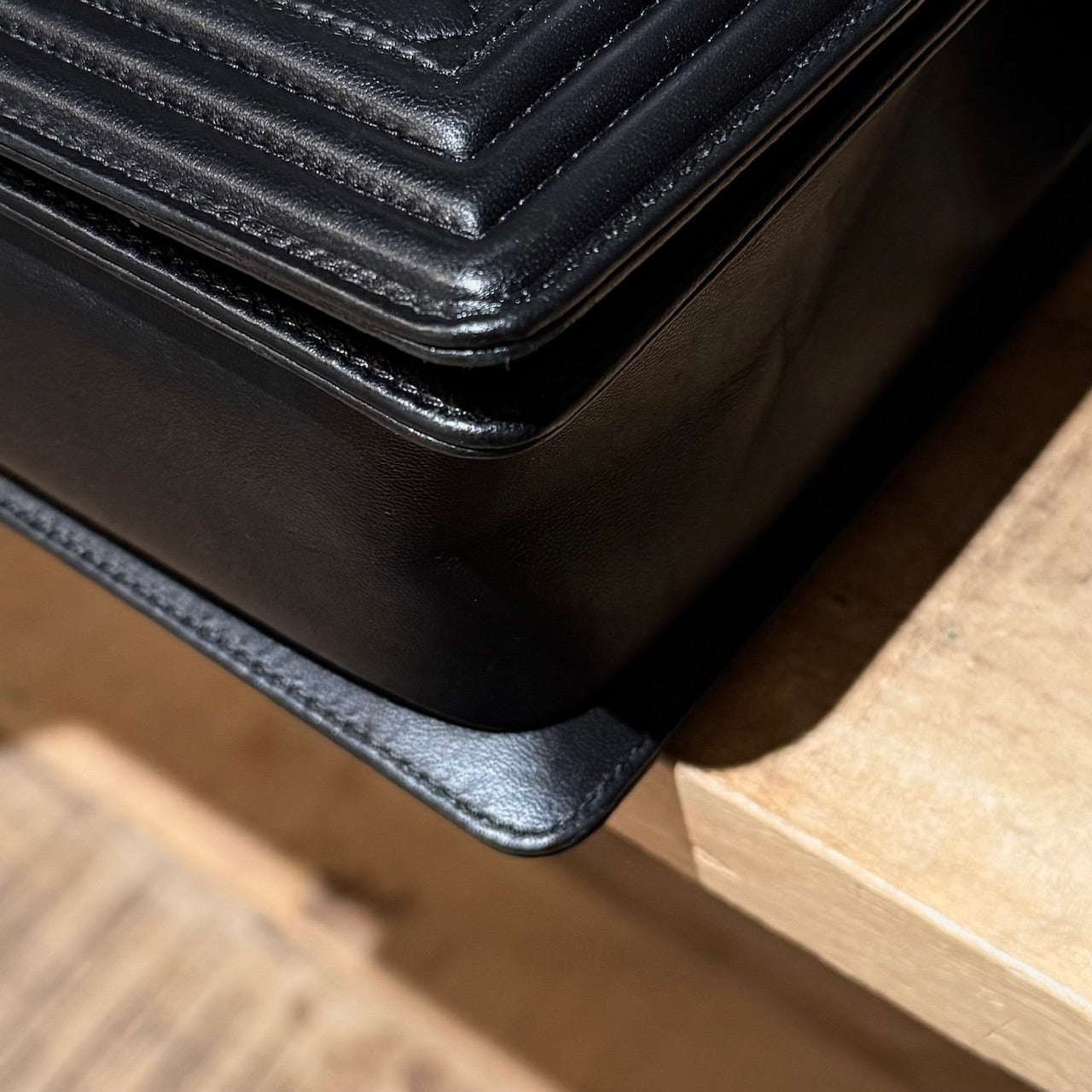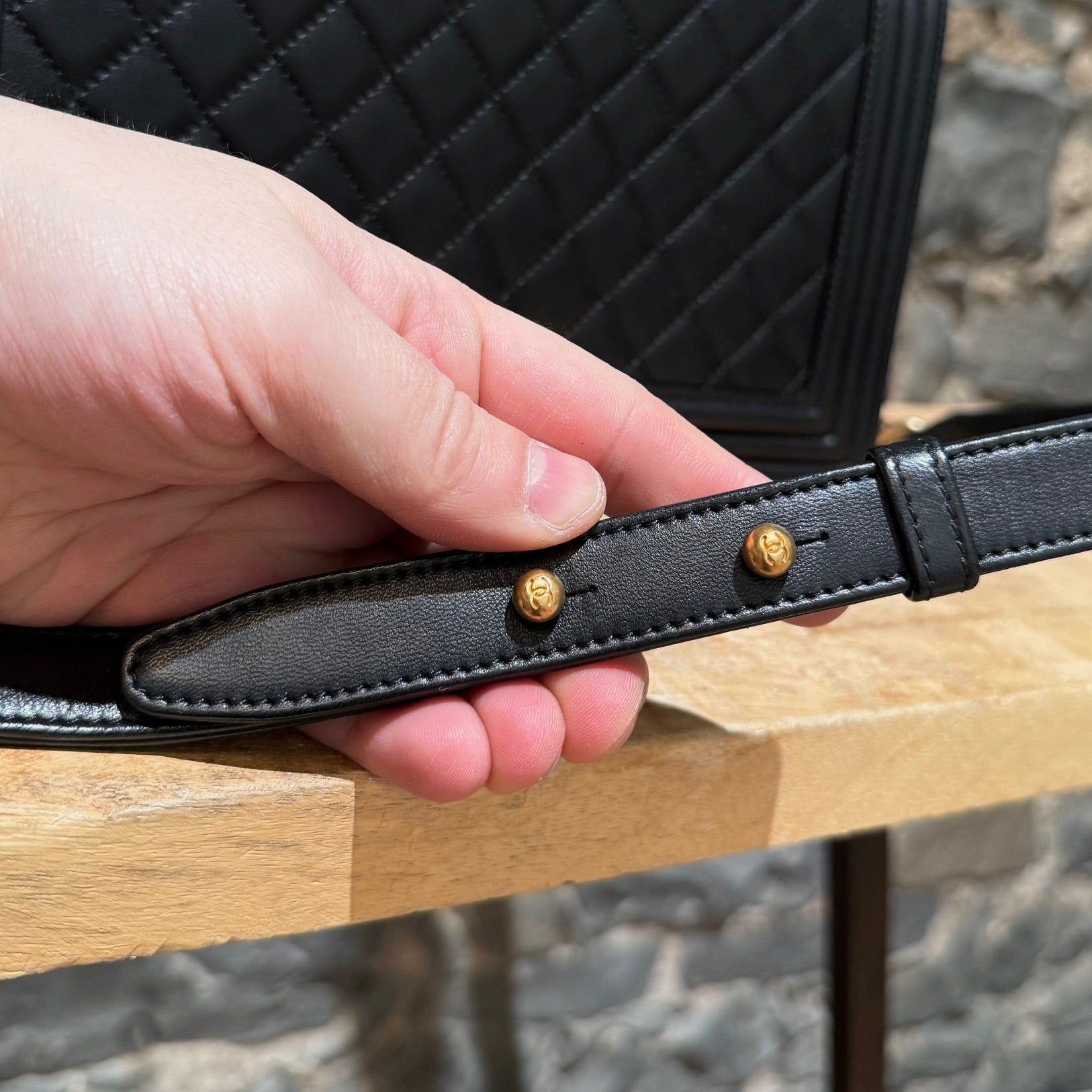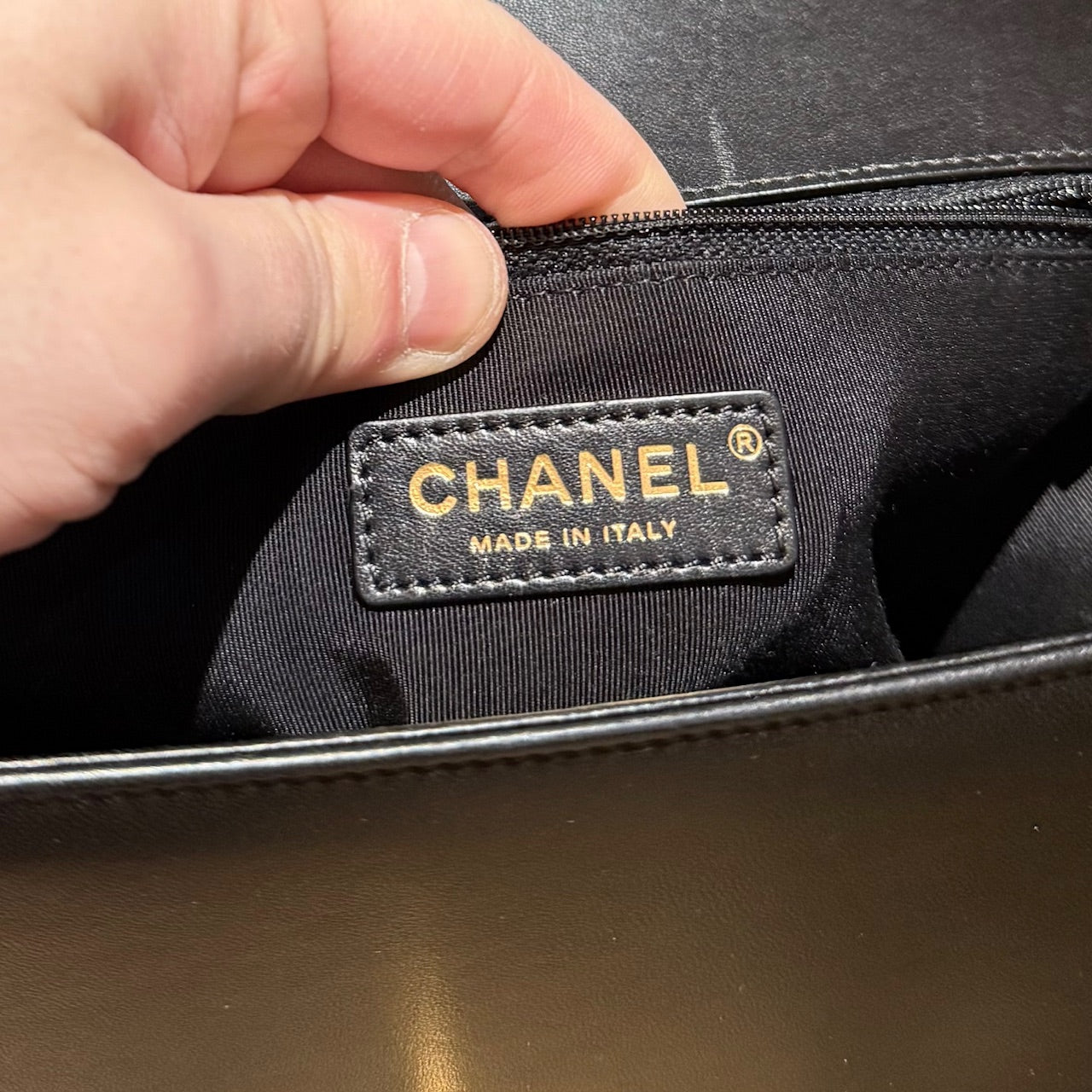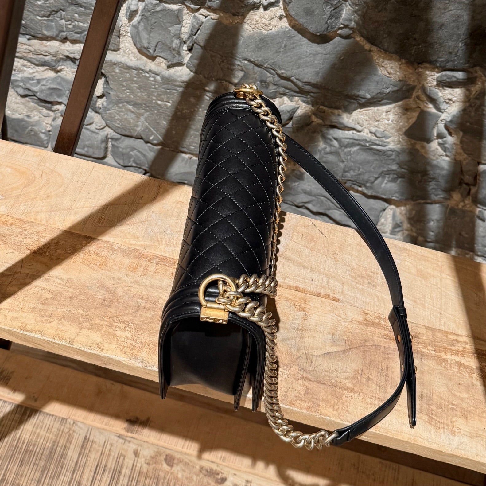 Design rectangulaire structuré en cuir d’agneau noir souple matelassé à motif losanges. Quincaillerie dorée siglée à finition semi antique. Bordures en cuir lisse et arêtes renforcées. Rabat frontal avec fermoir poussoir Boy emblématique et motif CC entrelacé gravé. Bandoulière chaîne et cuir permettant un porté à l’épaule ou en bandoulière. Doublure intérieure en tissu noir comprenant une (1) poche intérieure zippée. Série 23 – production 2016-2017. Fait en Italie. Livré avec le livret d’entretien Chanel.