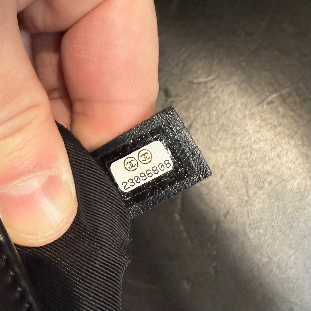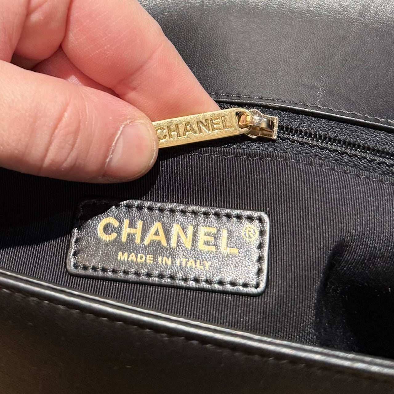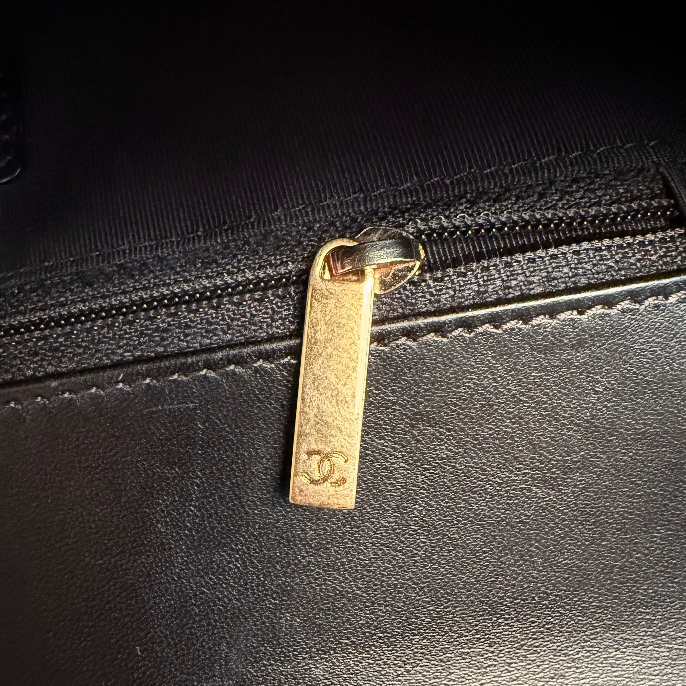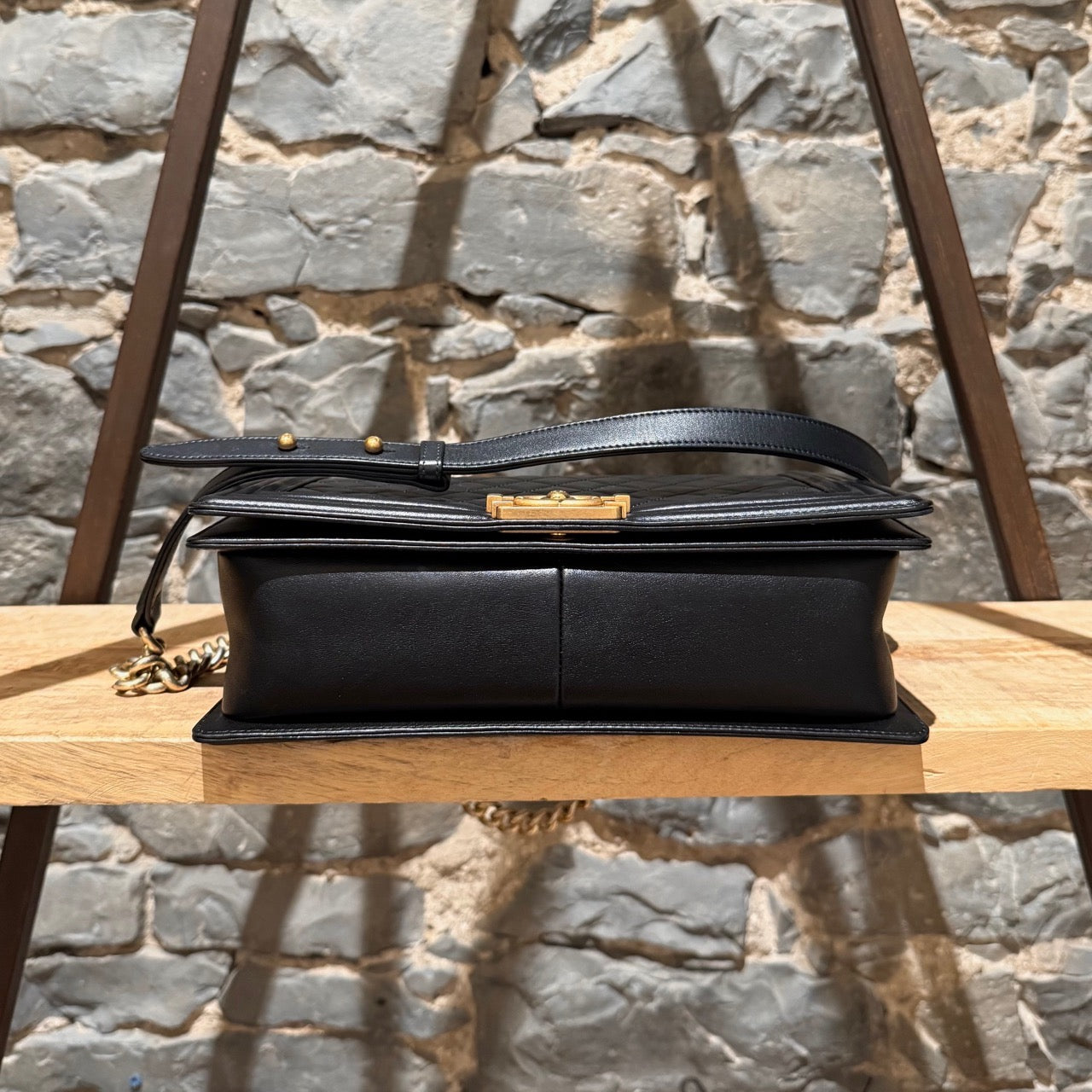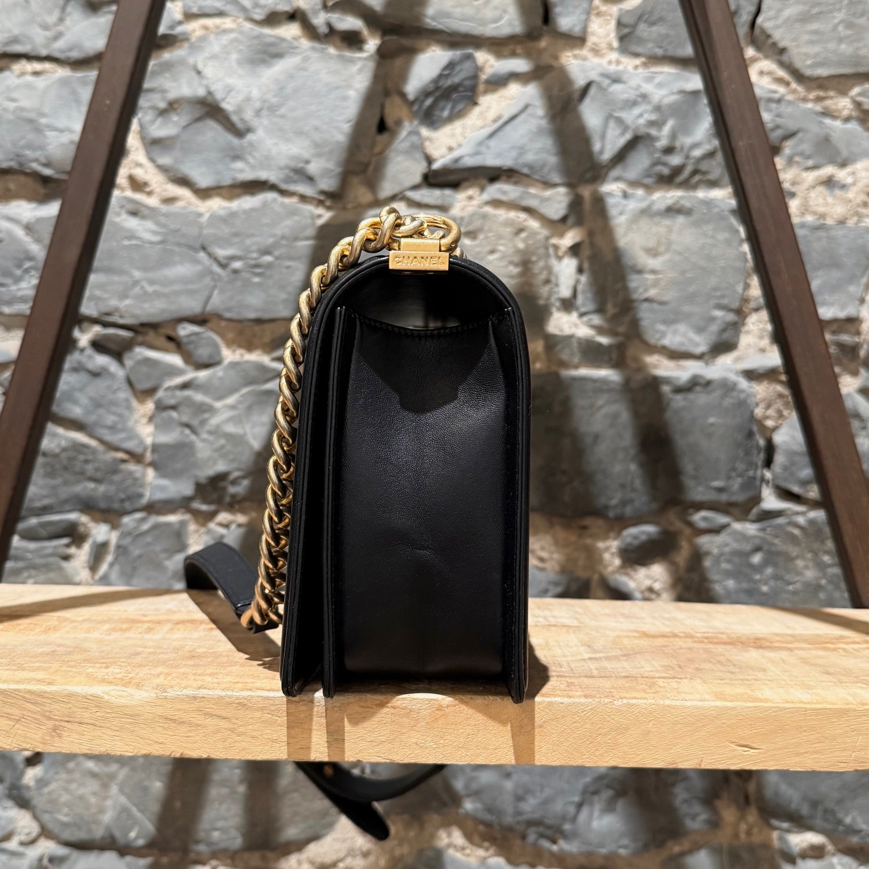 Design rectangulaire structuré en cuir d’agneau noir souple matelassé à motif losanges. Quincaillerie dorée siglée à finition semi antique. Bordures en cuir lisse et arêtes renforcées. Rabat frontal avec fermoir poussoir Boy emblématique et motif CC entrelacé gravé. Bandoulière chaîne et cuir permettant un porté à l’épaule ou en bandoulière. Doublure intérieure en tissu noir comprenant une (1) poche intérieure zippée. Série 23 – production 2016-2017. Fait en Italie. Livré avec le livret d’entretien Chanel.