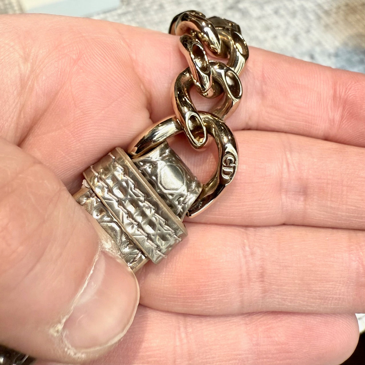 Silhouette Diorama structurée de petit format issue de la collection 2018. Format rectangulaire compact. Extérieur en microcannage or en cuir enduit avec finition métallique brillante. Rabat avec fermeture à poussoir ornée de l’écusson Dior en quincaillerie ton or. Bandoulière chaîne coulissante avec empiècement en cuir ajustable pour porté épaule, croisé ou double poignée. Intérieur en cuir bleu marine avec compartiments et poche zippée. Fait en Italie. Livré avec carte d’authenticité Dior et livret d’entretien.
